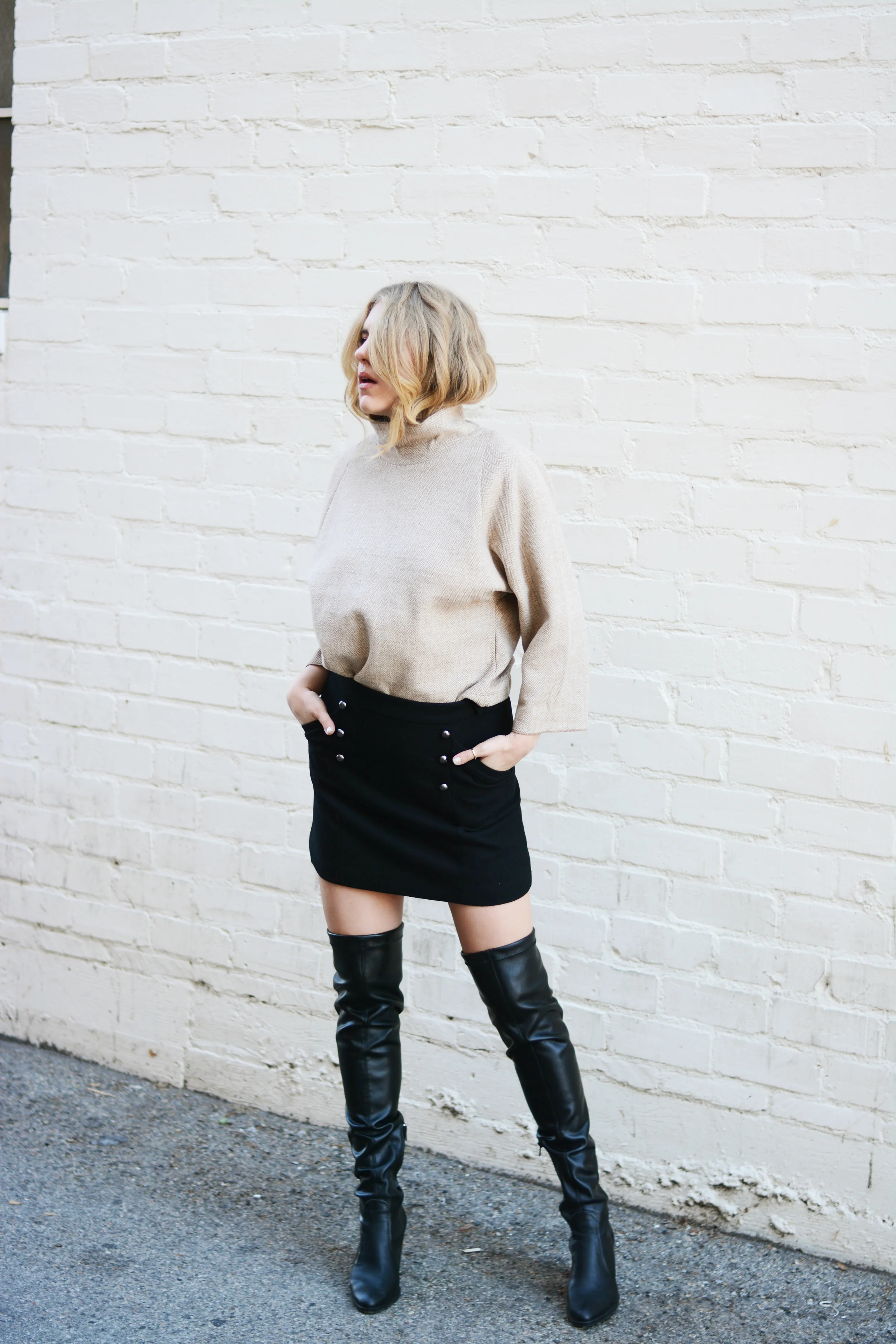Madewell Herringbone Sweater / Topshop 'Matelot' A Line Skirt / Topshop Commander Boots
