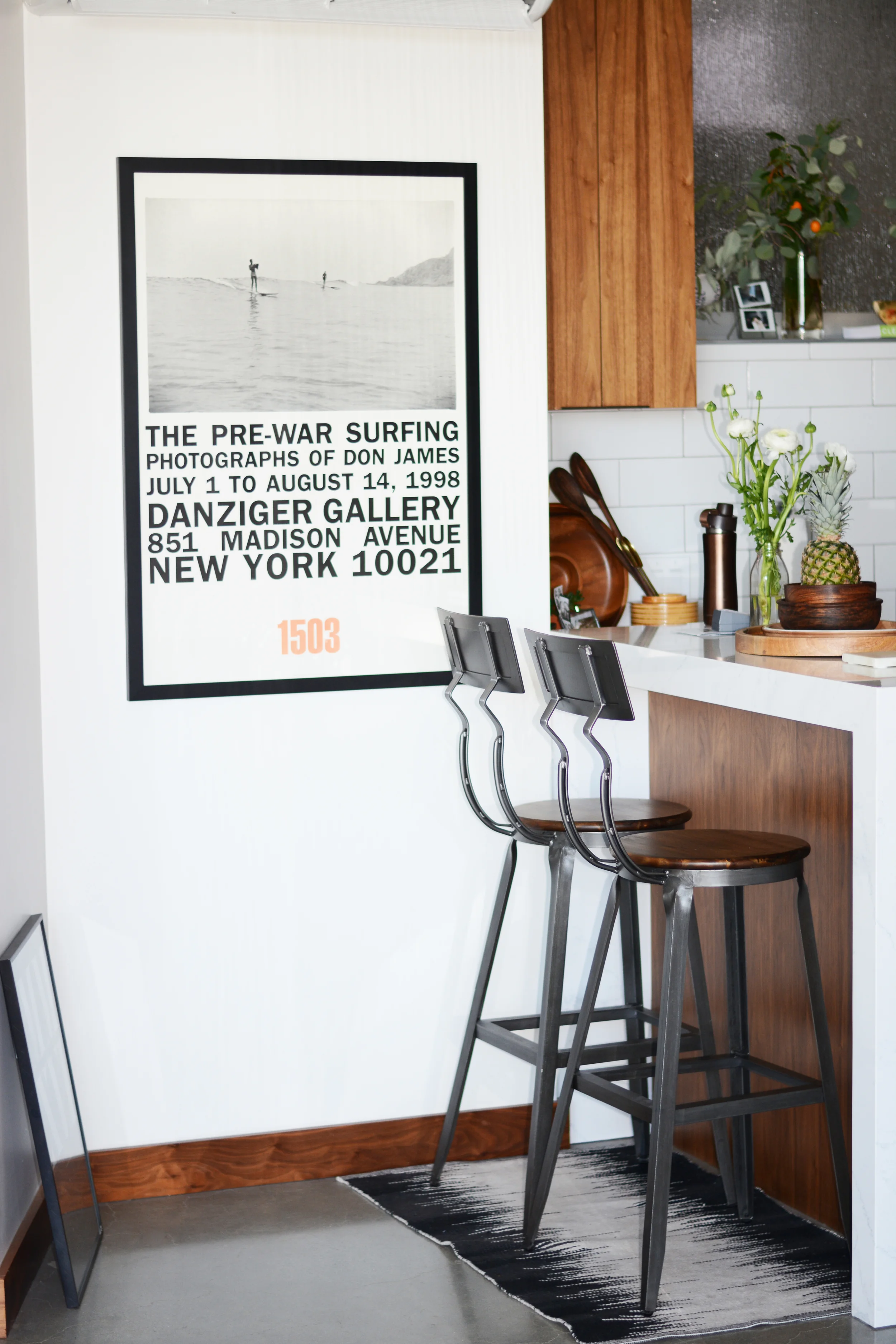 I love to have art not only hanging, but resting against my walls and sitting on top of books. Resting large frames against your walls gives your home a very laid back and effortless feel, as if your art just perfectly belongs there. I also prefer to put personal and mixed media work next to prints, giving the eye plenty to look at. Variety is key! Bottom line: Fill your home up with art and break rules. It is good for the soul and will brighten your mood.
