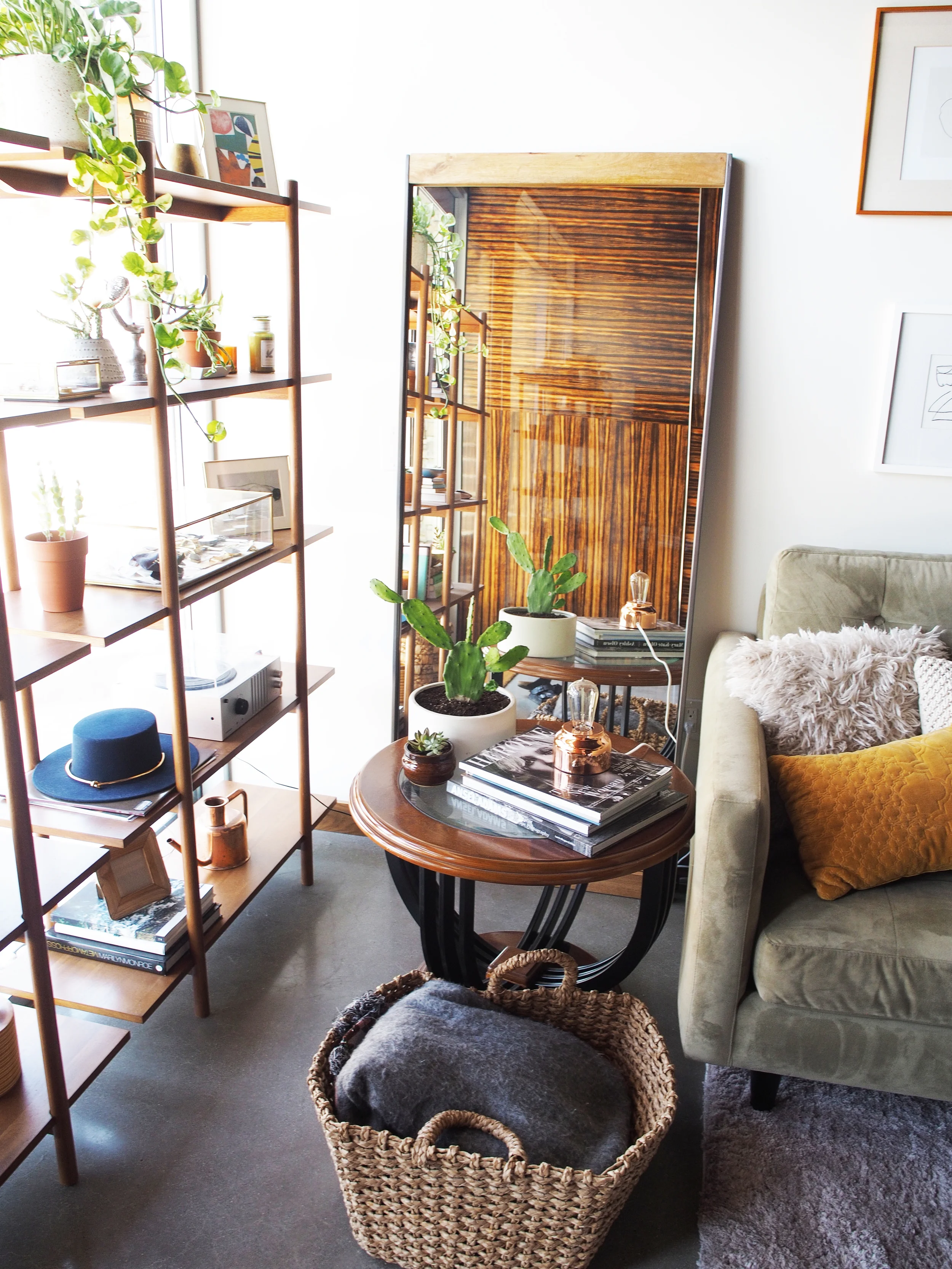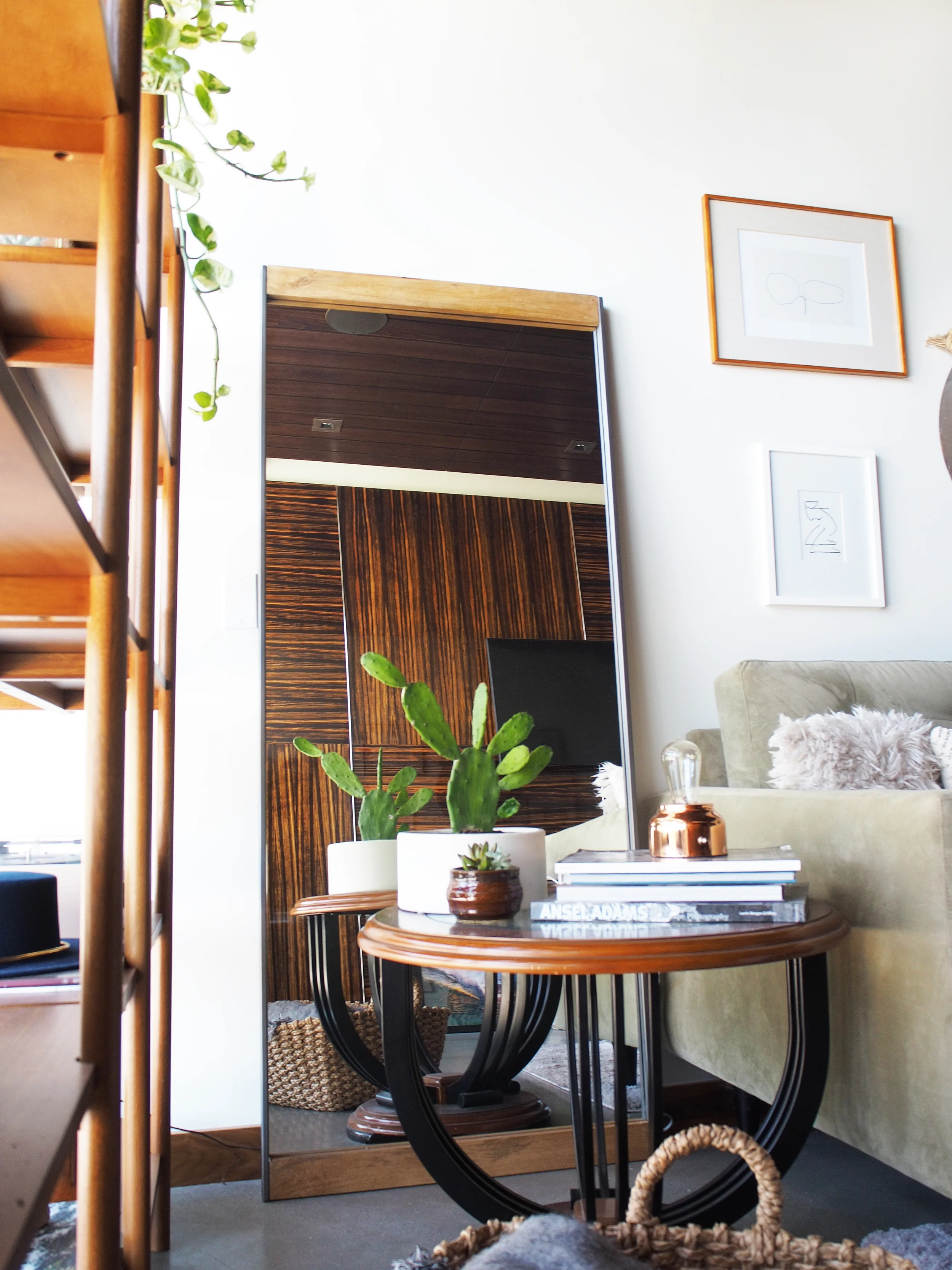 You can see in my before photos how badly I needed to fill that empty space. It was calling for a mirror and for some pretty bookcases to put all of my books on. If you get to know me and see my space in person, it wouldn't be long before you noticed how many books I have. My place could be categorized into four different things: books, plants, art, and mixed materials. It makes me happy to be surrounded by these things and I anxiously awaited for my new furniture to arrive. Within two weeks, I had white glove delivery and my furniture arrived in pristine condition. I had heart eyes as they brought the bookshelves down my stairs and placed them right in front of my windows. They fit like they were made for my place. And the mirror? Well, that's a whole other story. I mean, look at it.