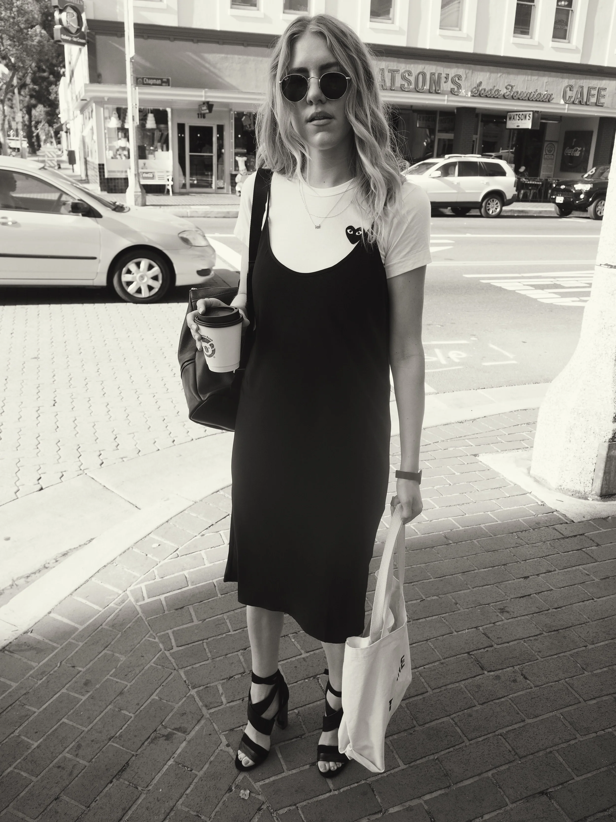 The slip dress. Ah, yes. If I were to travel and could only bring one item of clothing with me, the slip dress would win hands-down, every time. Transitional, comfortable, sexy, and convenient are a few words to describe this beloved article, yet only a few reasons why I love it so much. Pair it with a tee underneath and it becomes effortless. Wear it sans bra and a pair of heels? Instantly sexy. Since I was going for more of a day look, I elevated this outfit with a Comme des Garçons Tee I've had in my closet for a while and a cool pair of heeled sandals by Vince. Finished with dainty jewelry and a few accessories– done and done.