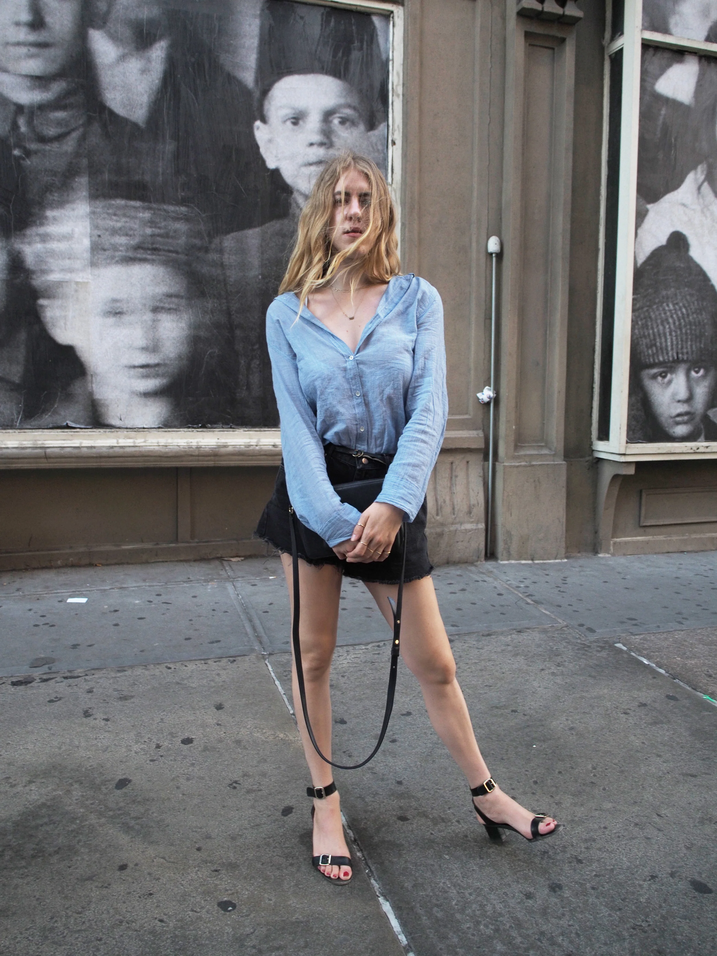 Lou&Grey Button Up Shirt | Vintage Cutoff Shorts | ATP Carmen Sandals | Manufacture Pascal Lady Officer Midnight Handbag