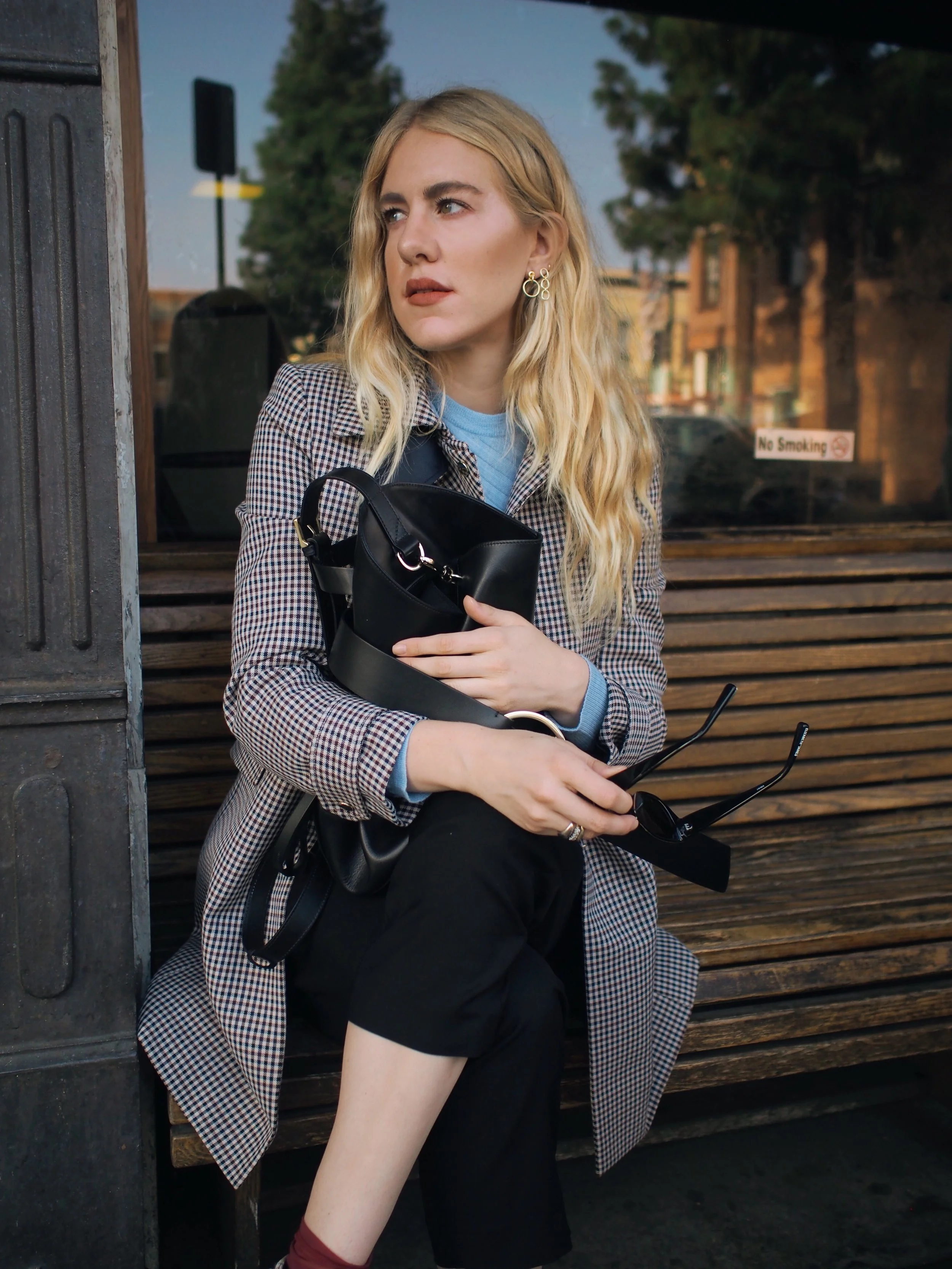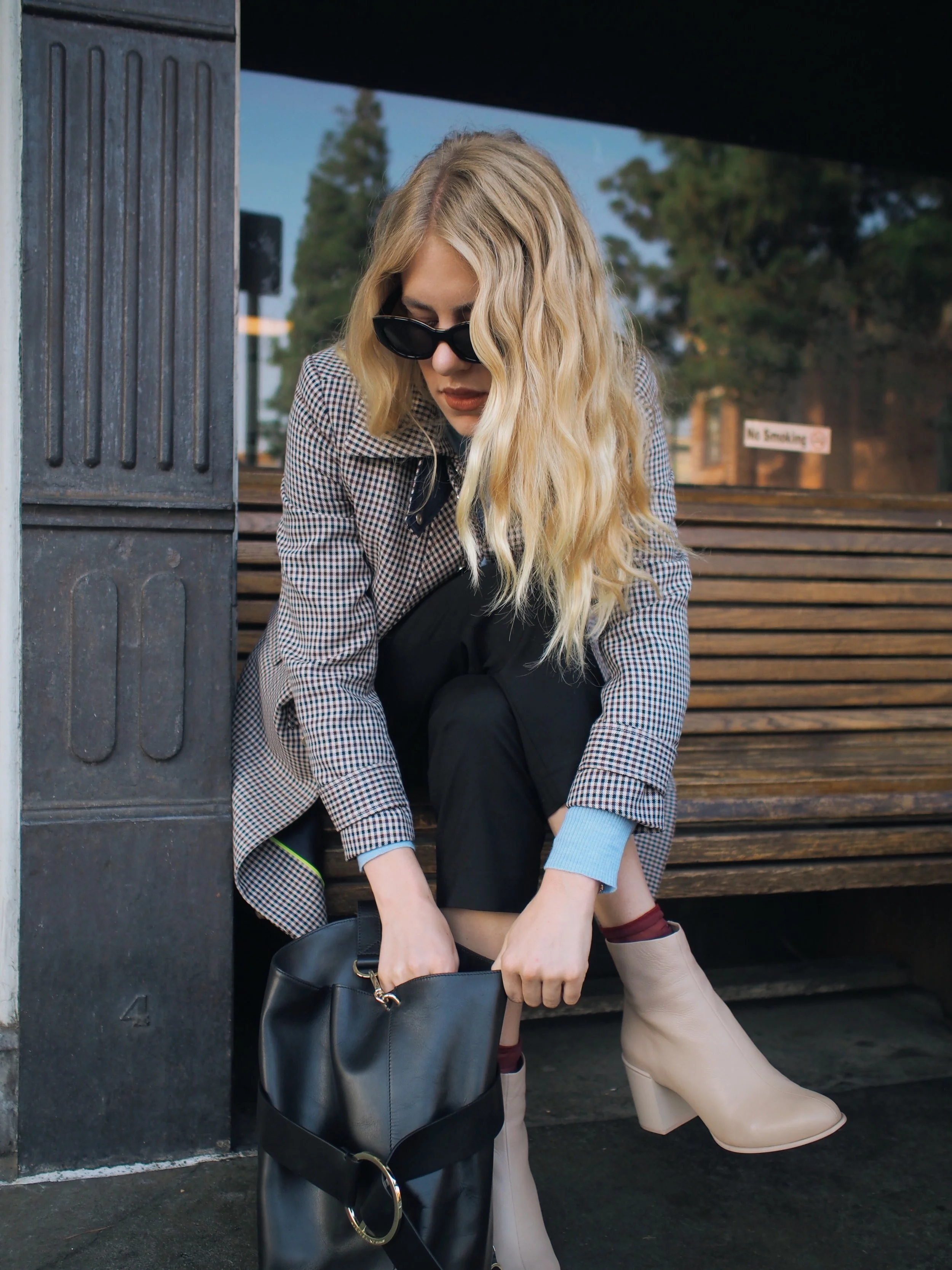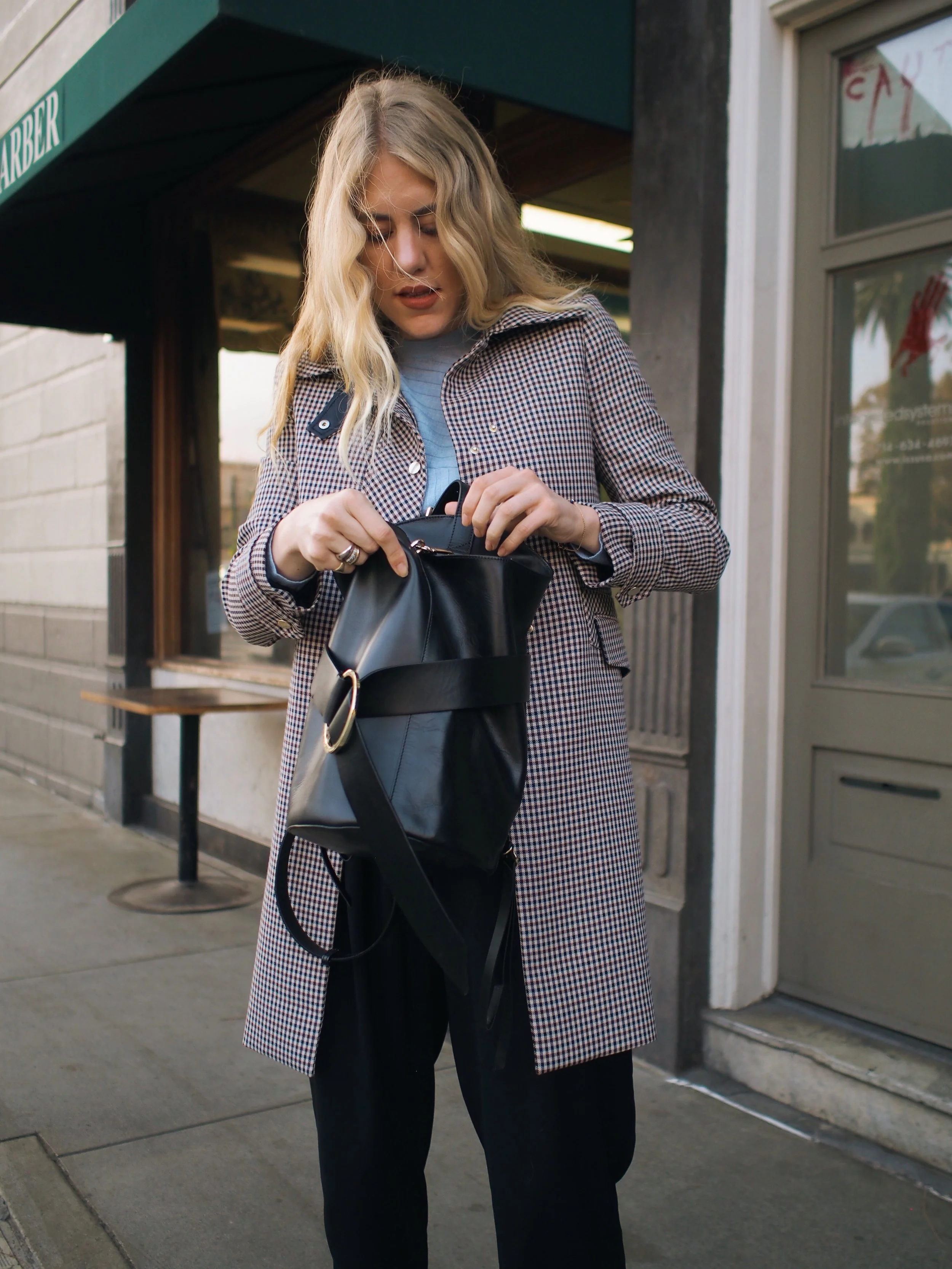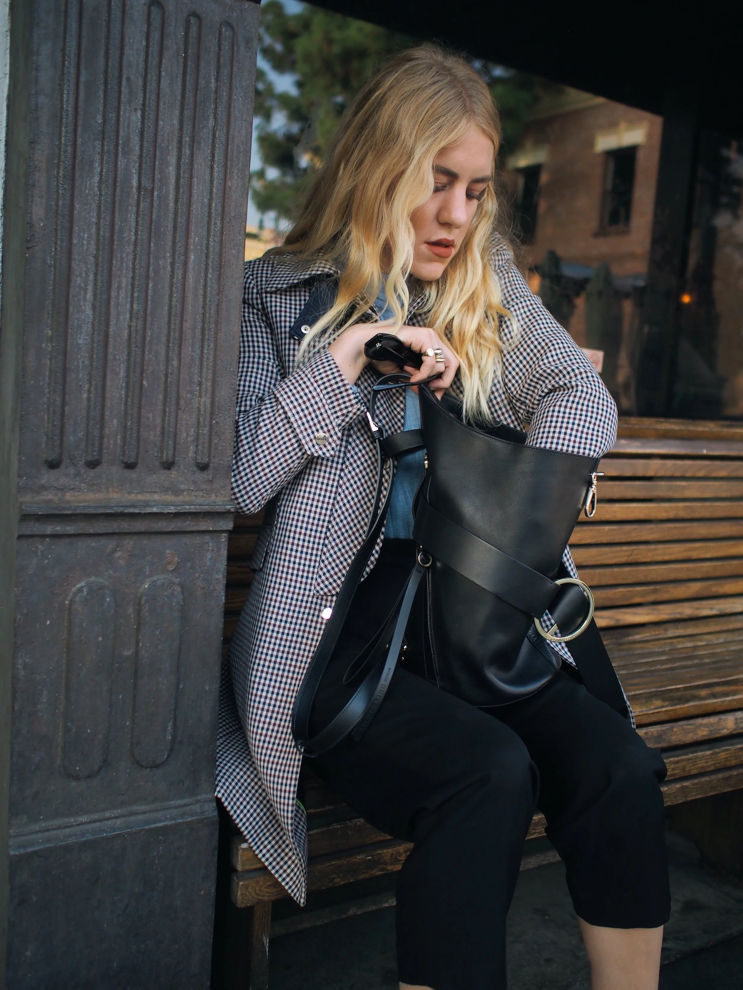 Tara Jarmon Two-Tone Gingham Coat |Inexclsv Nev Sweater | Tara Jarmon Black High-Waist Wool Trousers |DKNY Emma Ankle Boot | Darner Socks |Leibeskind Berlin Bag | Rhyden Quinn Earrings | Rhyden Margot Chain Earrings