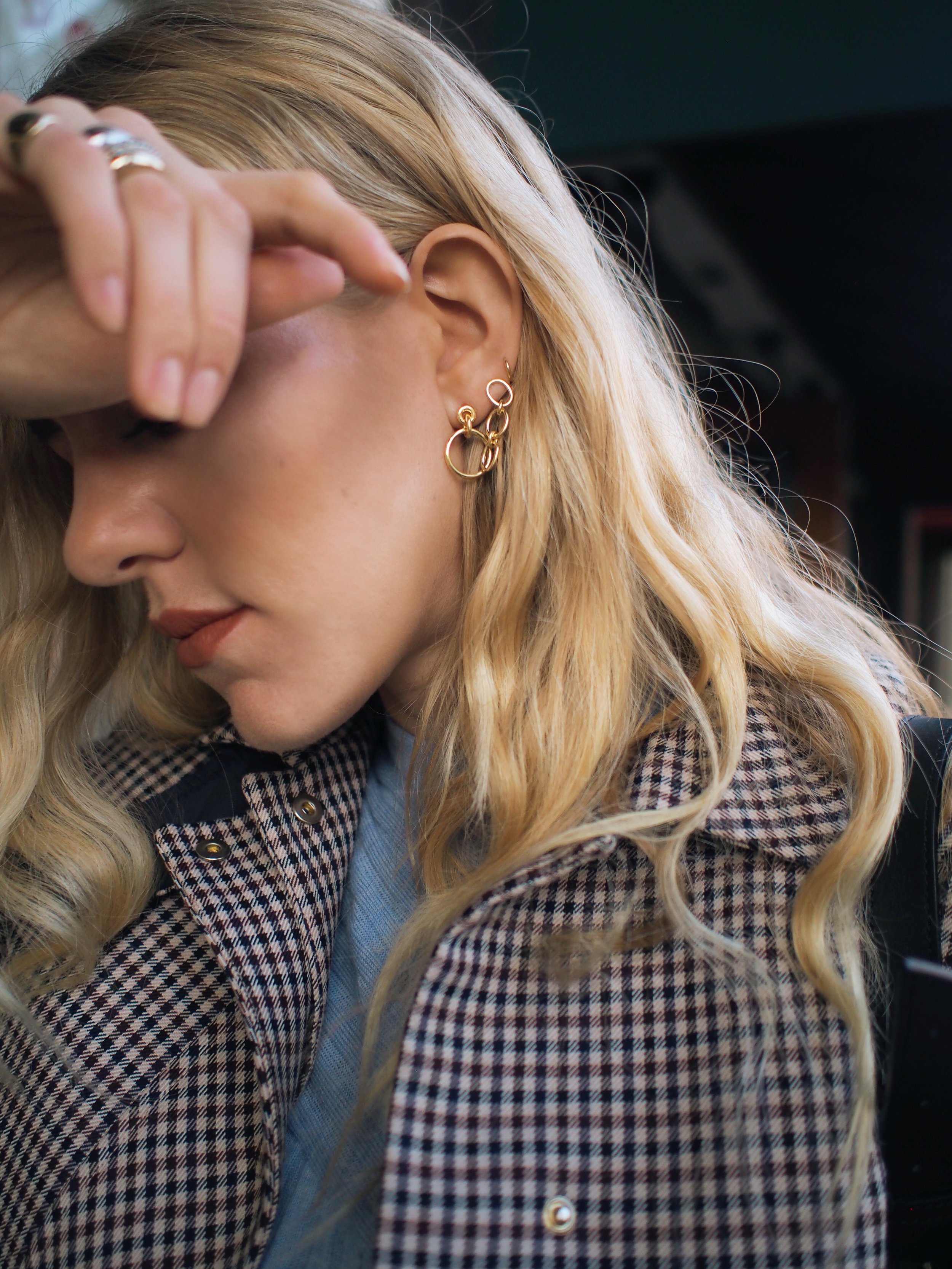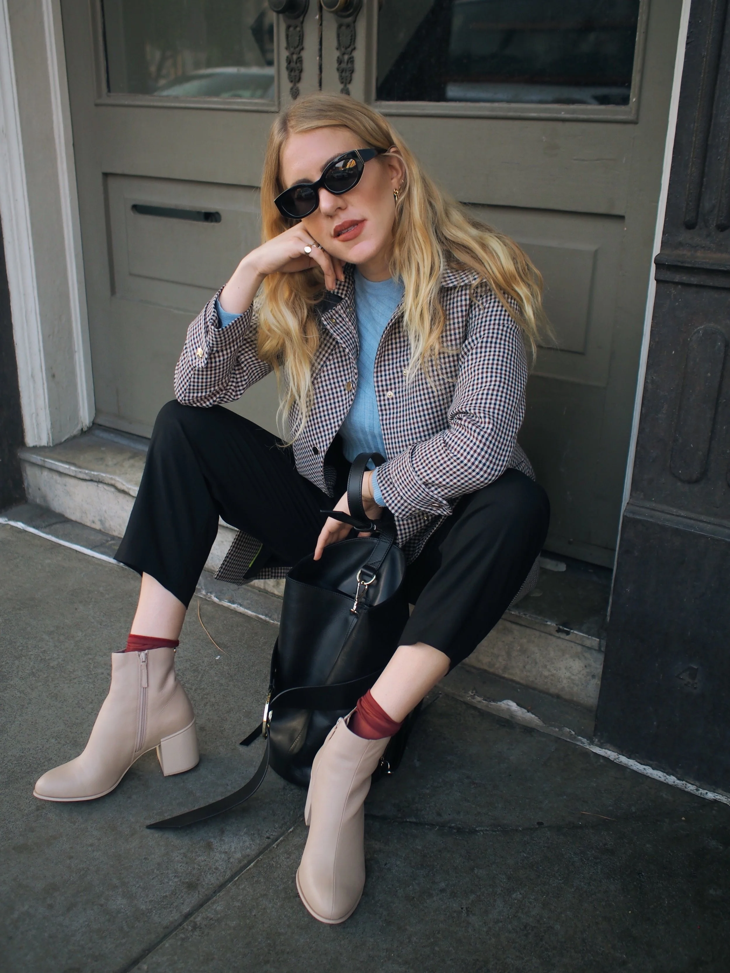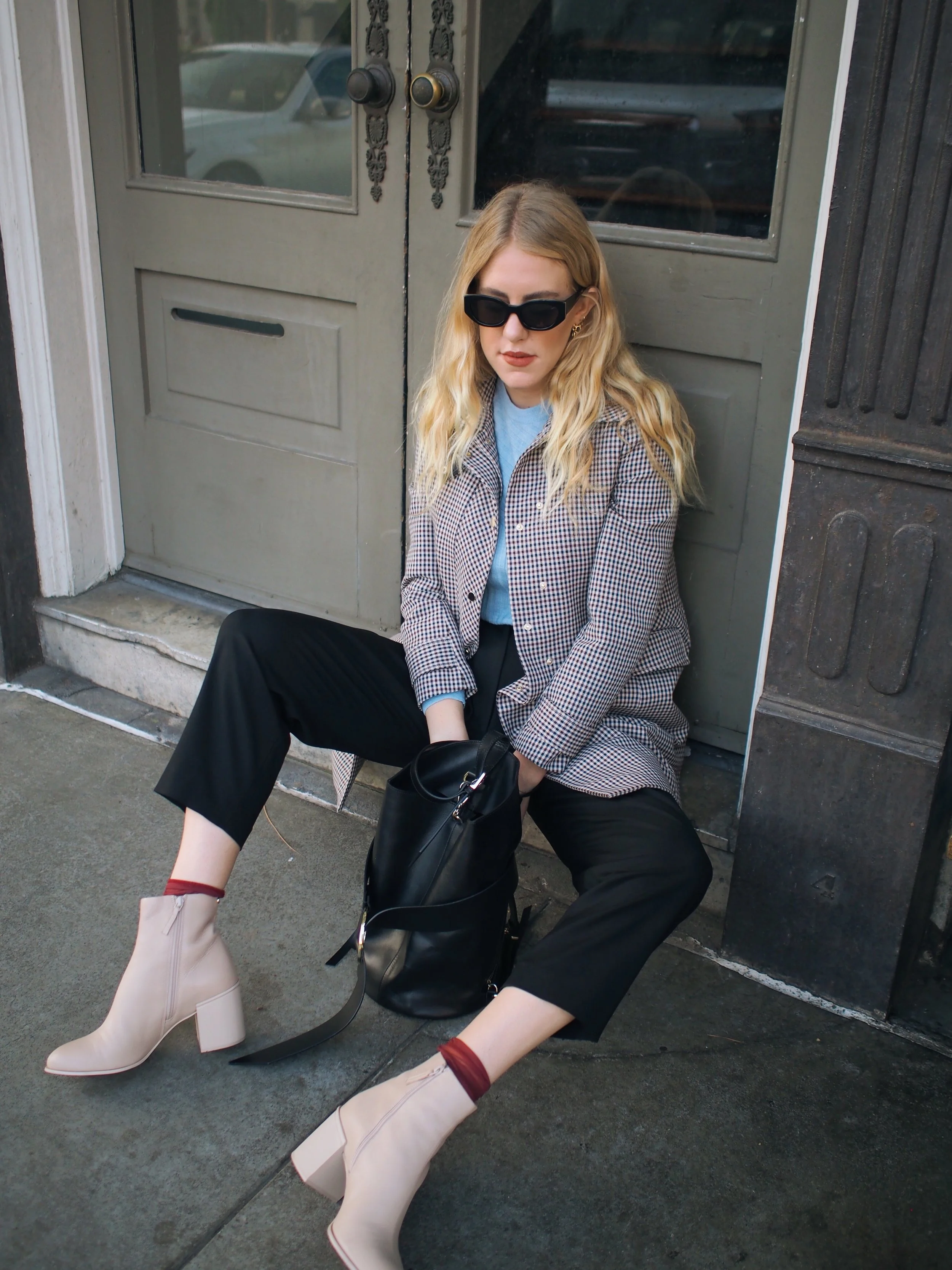 Tara Jarmon Two-Tone Gingham Coat |Inexclsv Nev Sweater | Tara Jarmon Black High-Waist Wool Trousers |DKNY Emma Ankle Boot | Darner Socks |Leibeskind Berlin Bag | Rhyden Quinn Earrings | Rhyden Margot Chain Earrings
