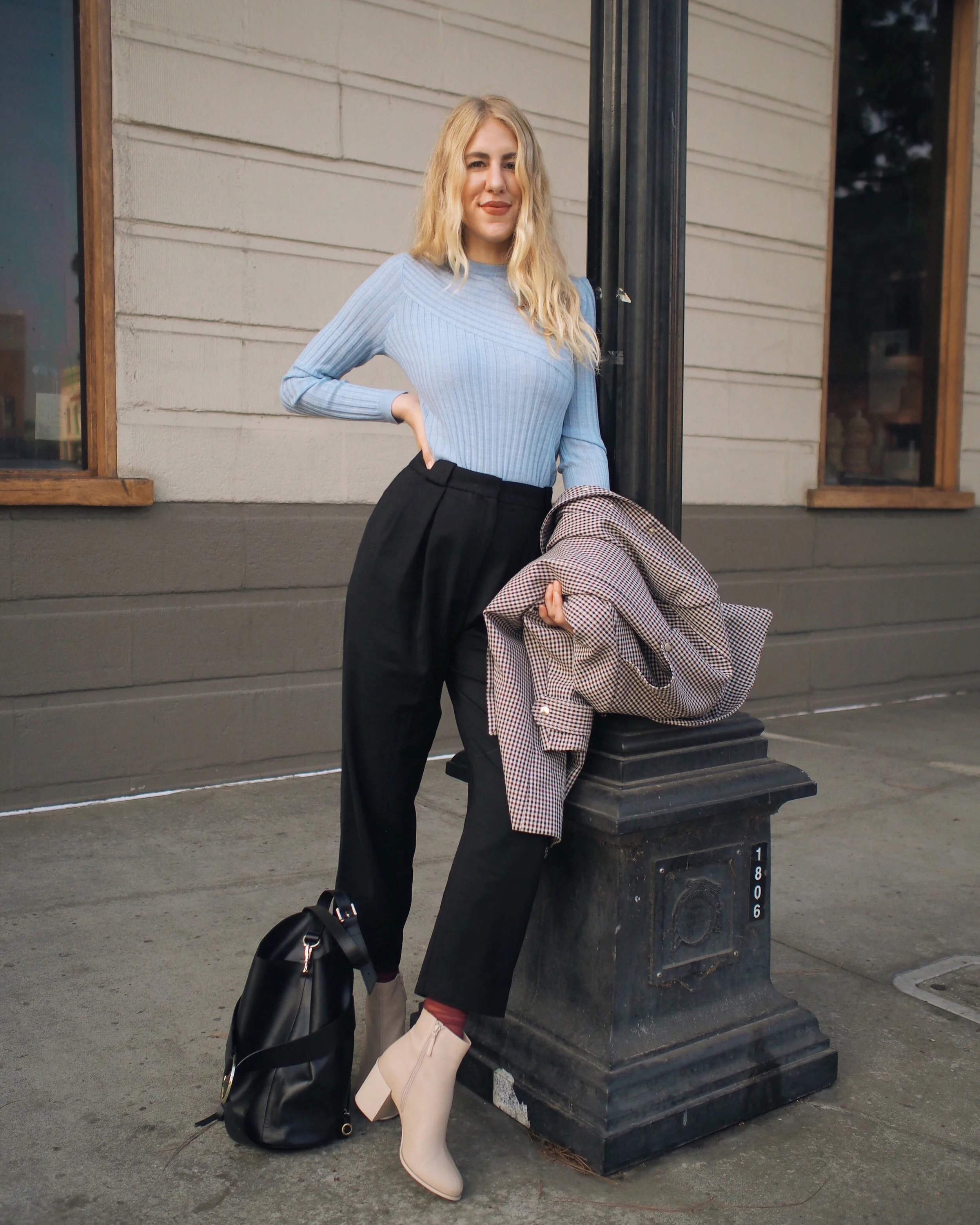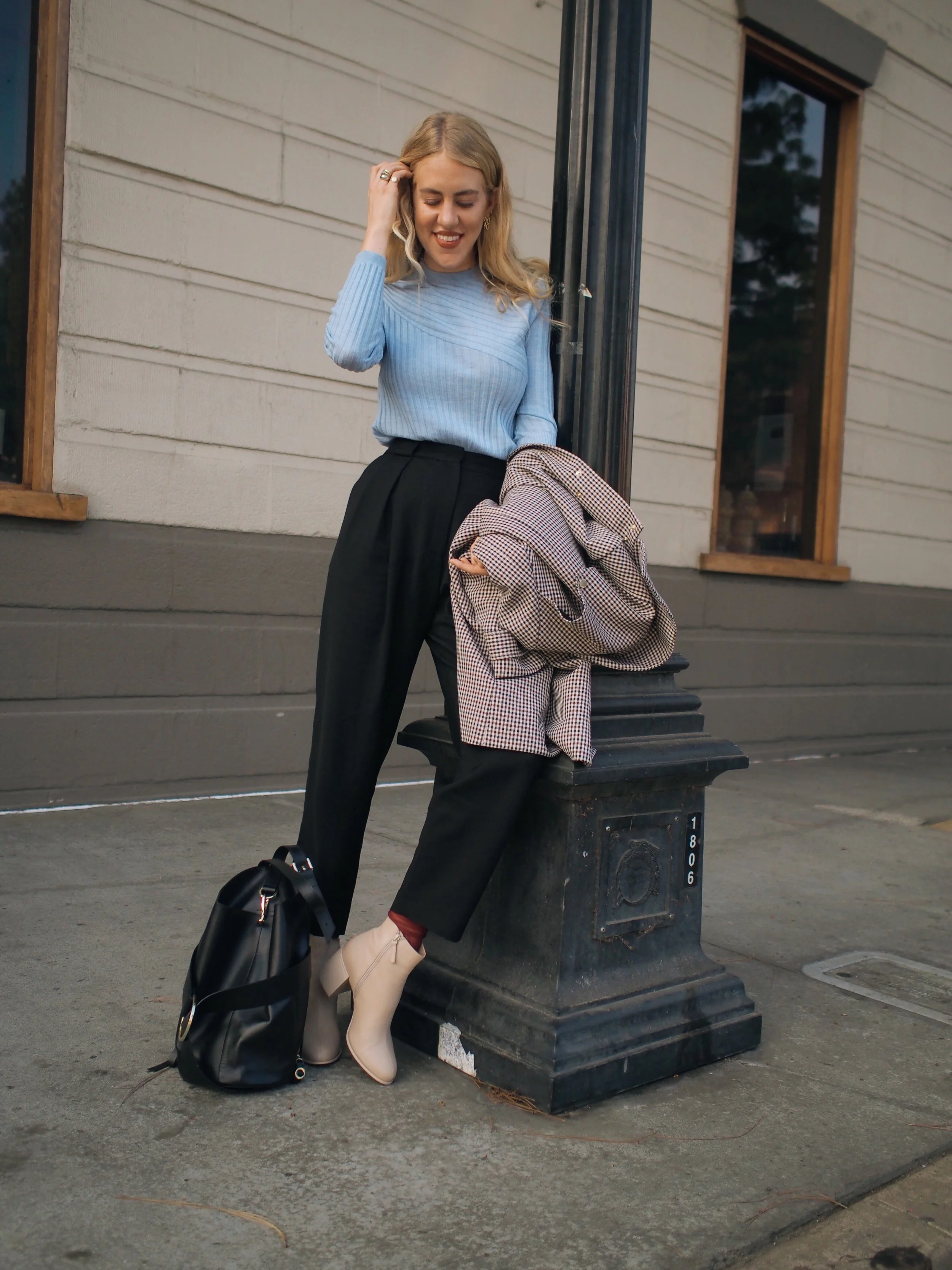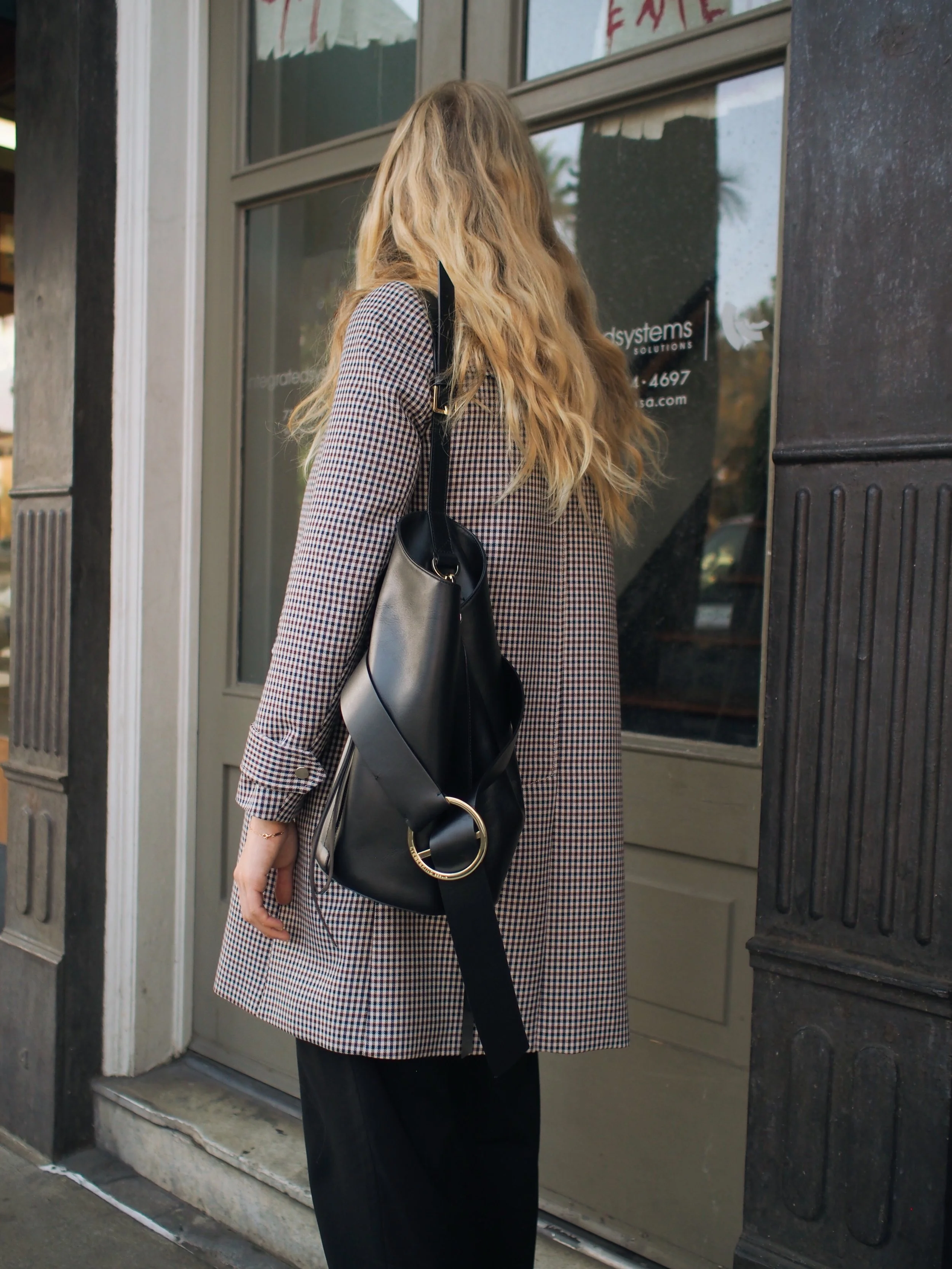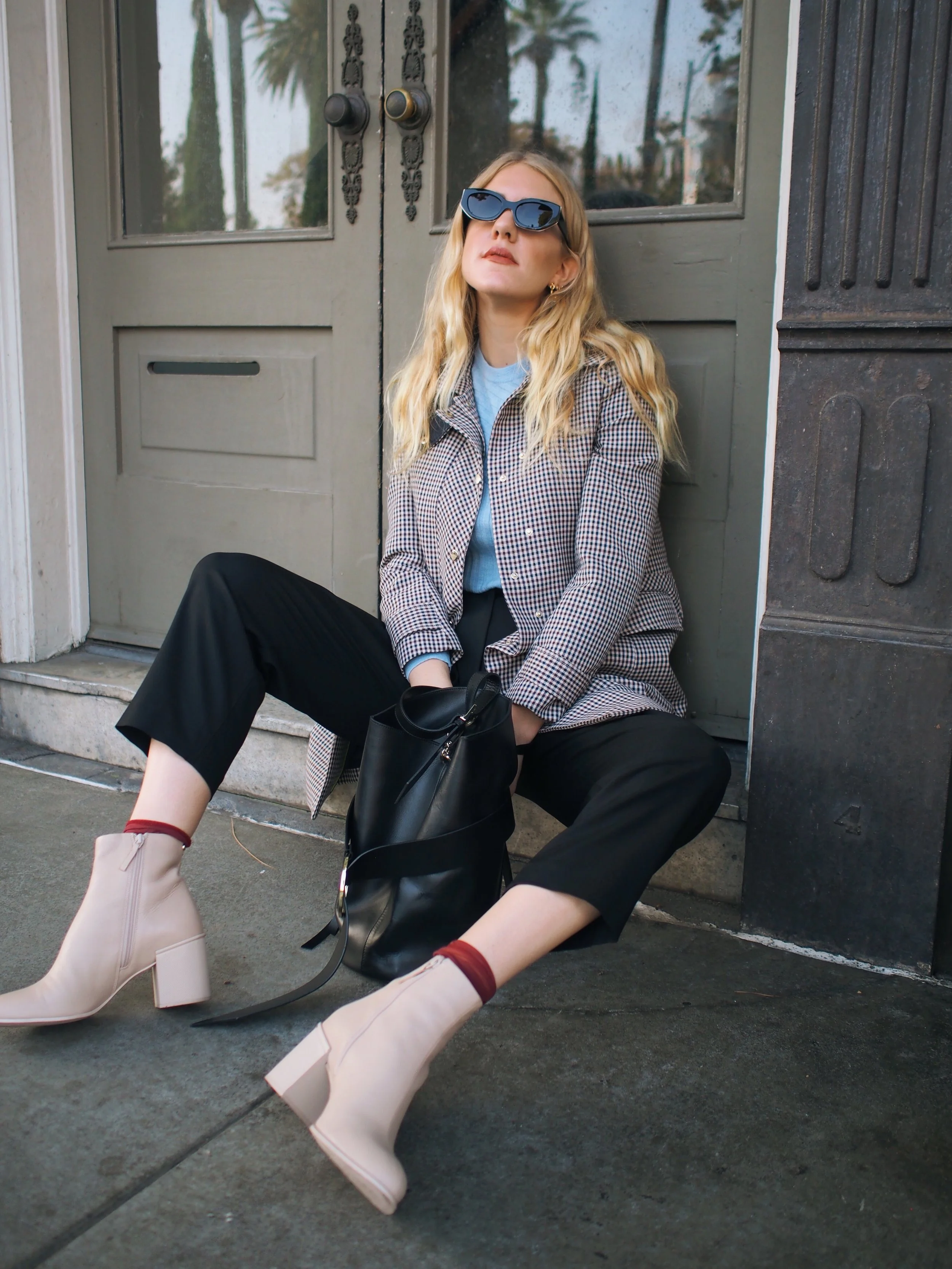 Tara Jarmon Two-Tone Gingham Coat |Inexclsv Nev Sweater | Tara Jarmon Black High-Waist Wool Trousers |DKNY Emma Ankle Boot | Darner Socks |Leibeskind Berlin Bag | Rhyden Quinn Earrings | Rhyden Margot Chain Earrings