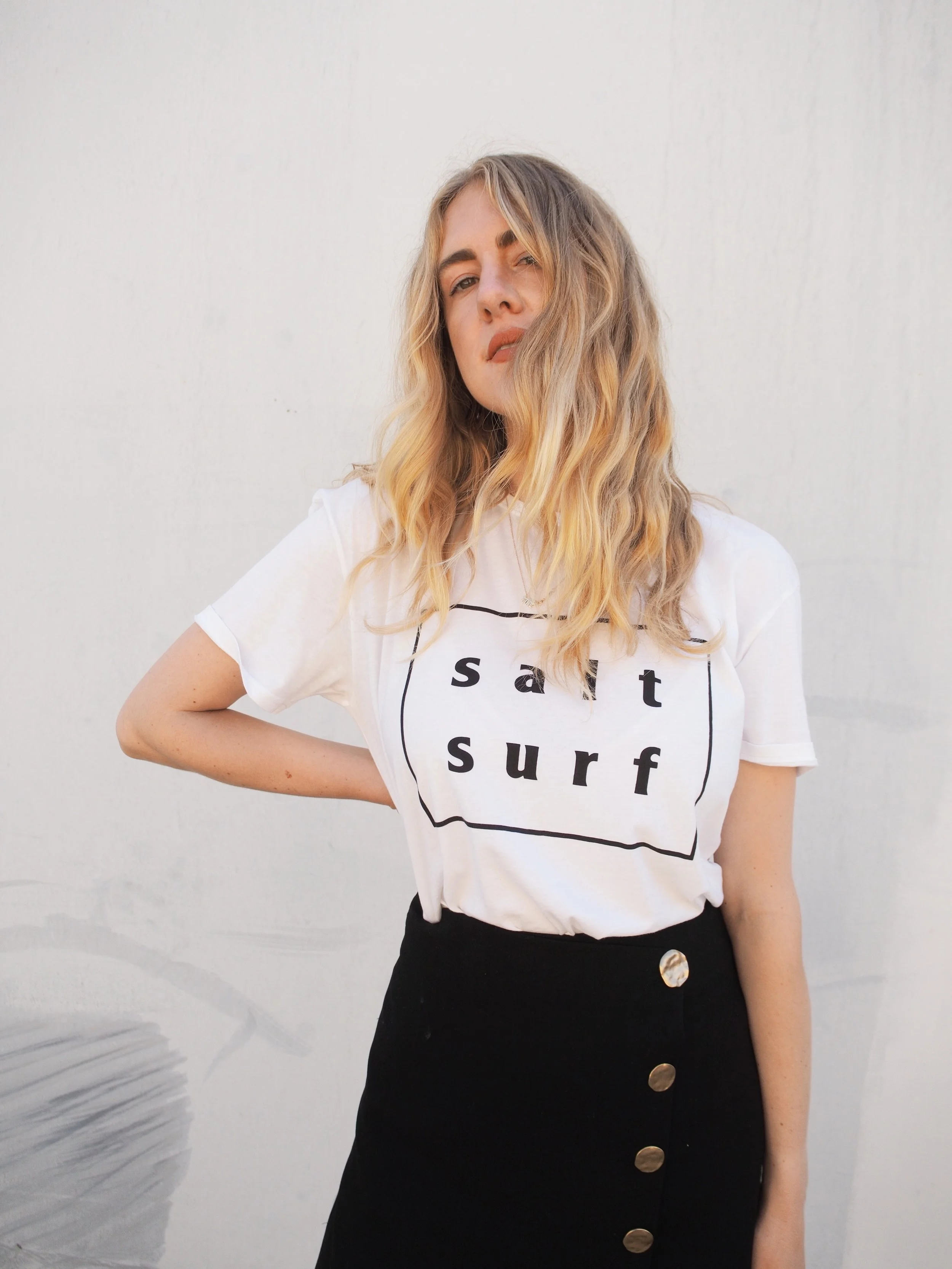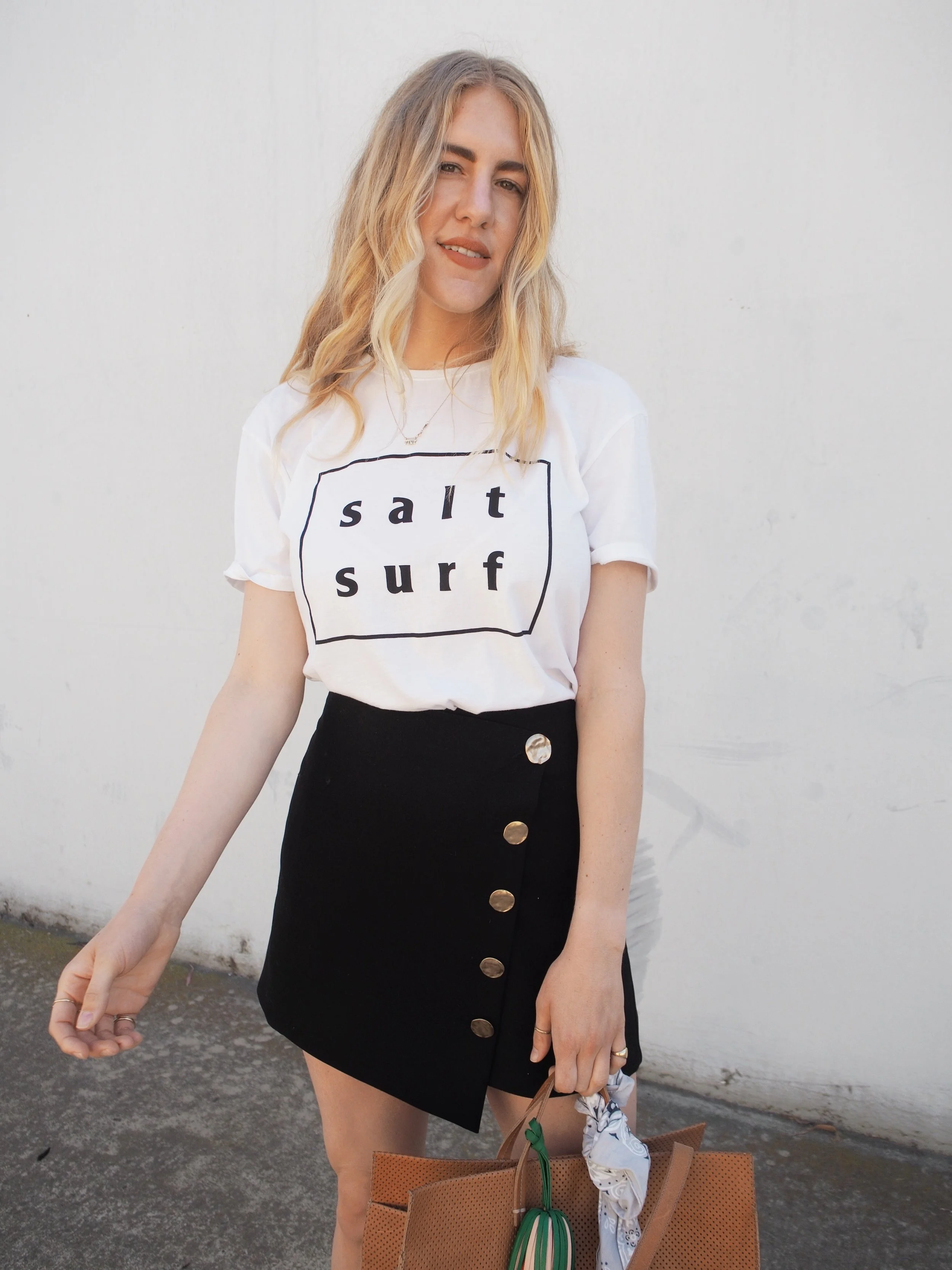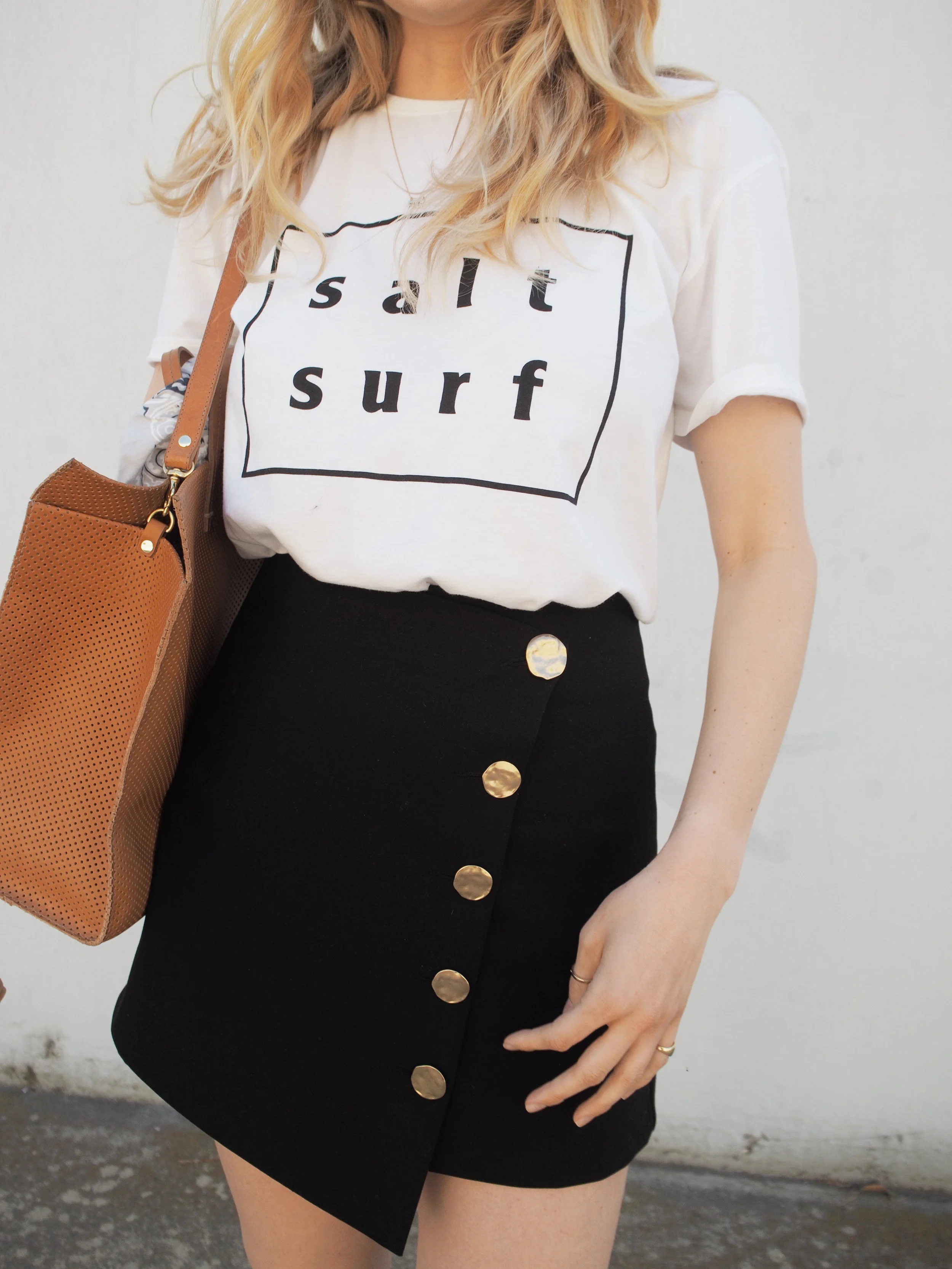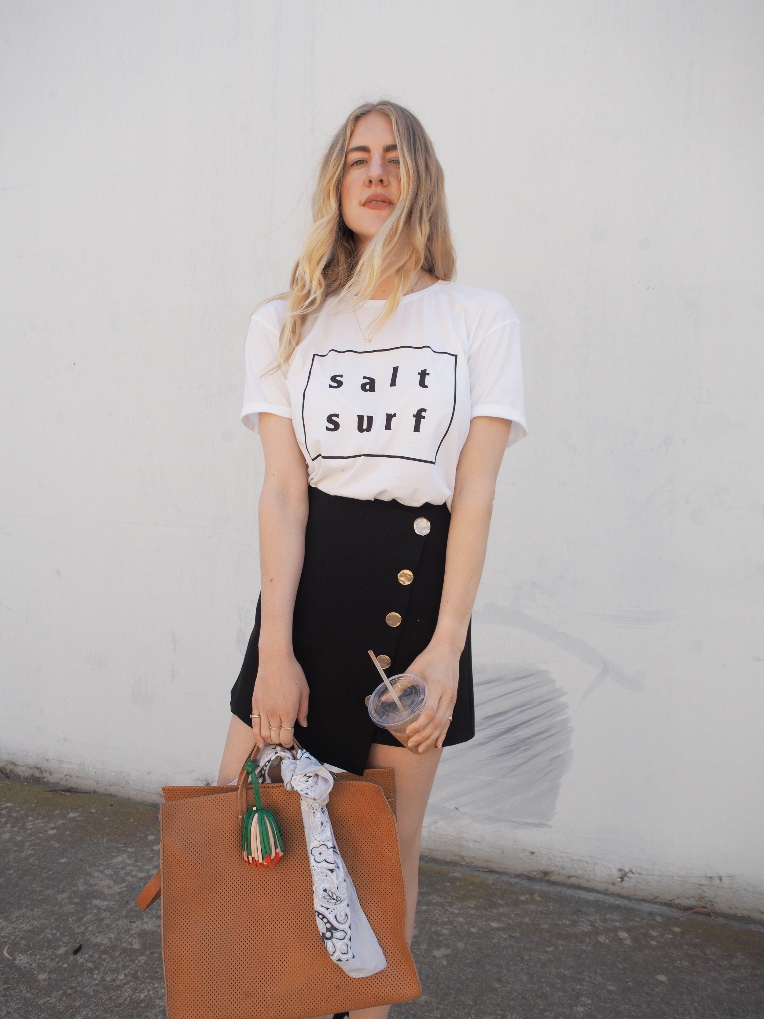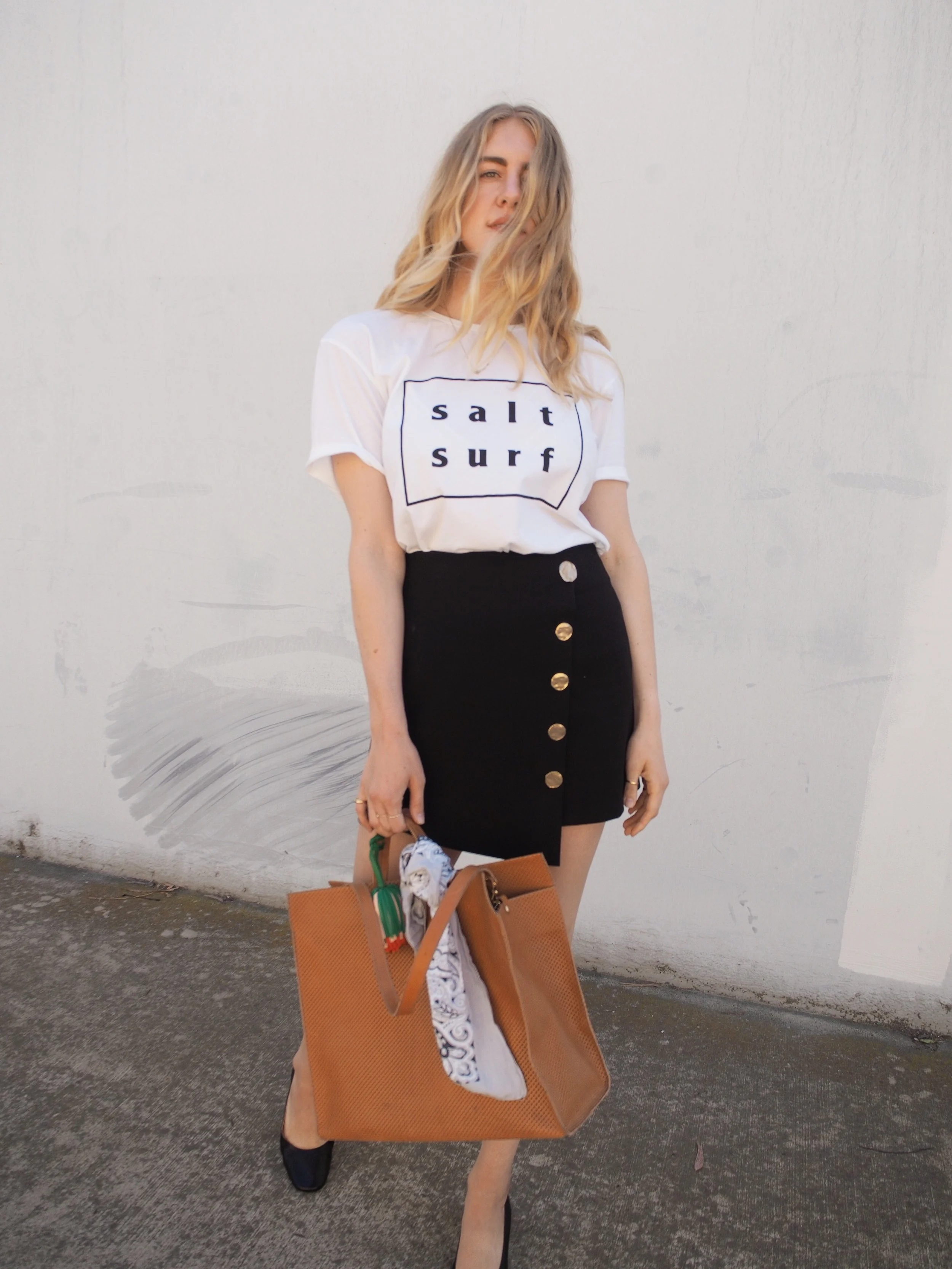 Salt Surf Logo White Tee | Pixie Market Button Asymmetric Black Mini Skirt | Clare V. Simple Tote | Everlane Heels (Coming Soon)