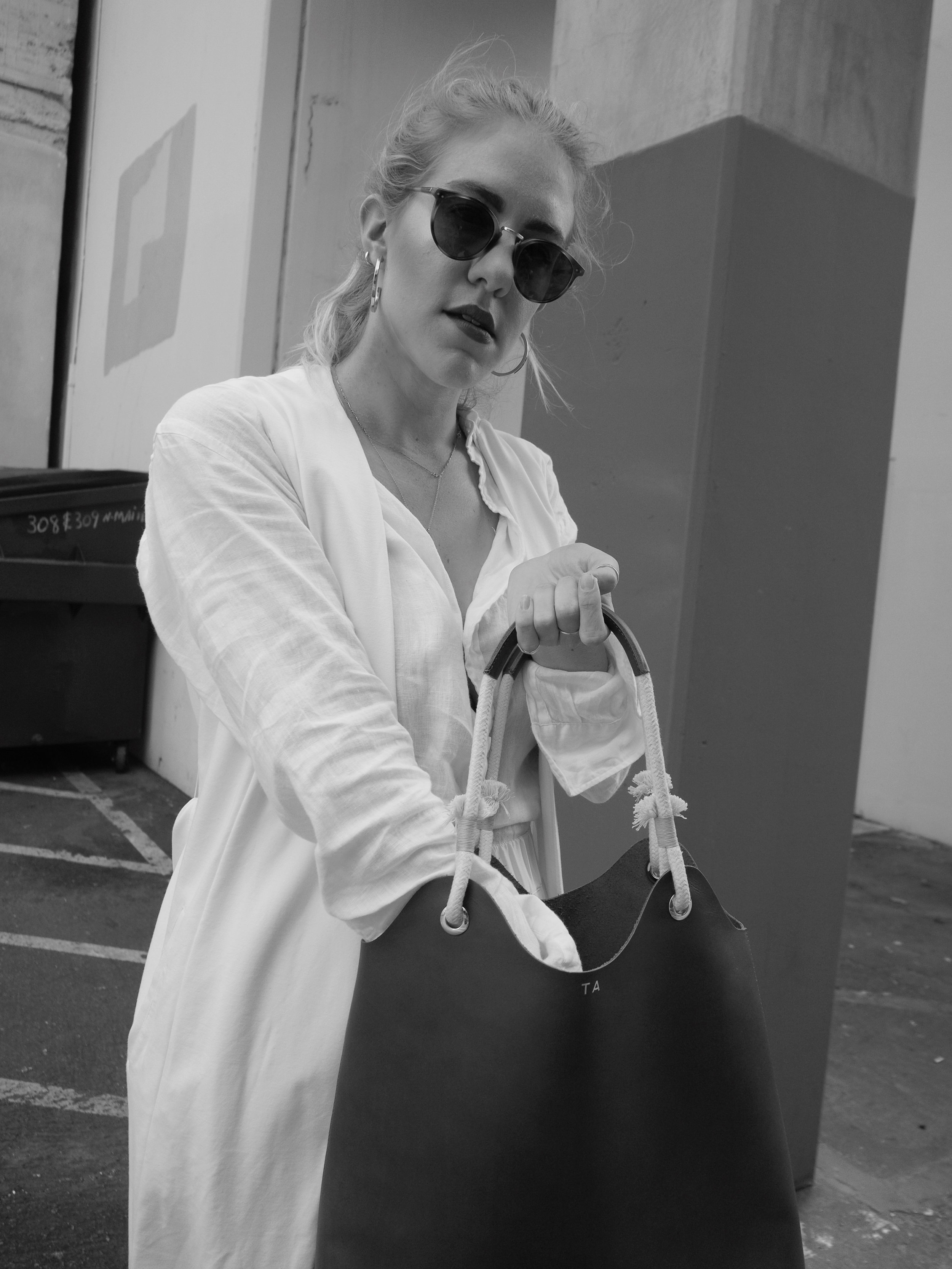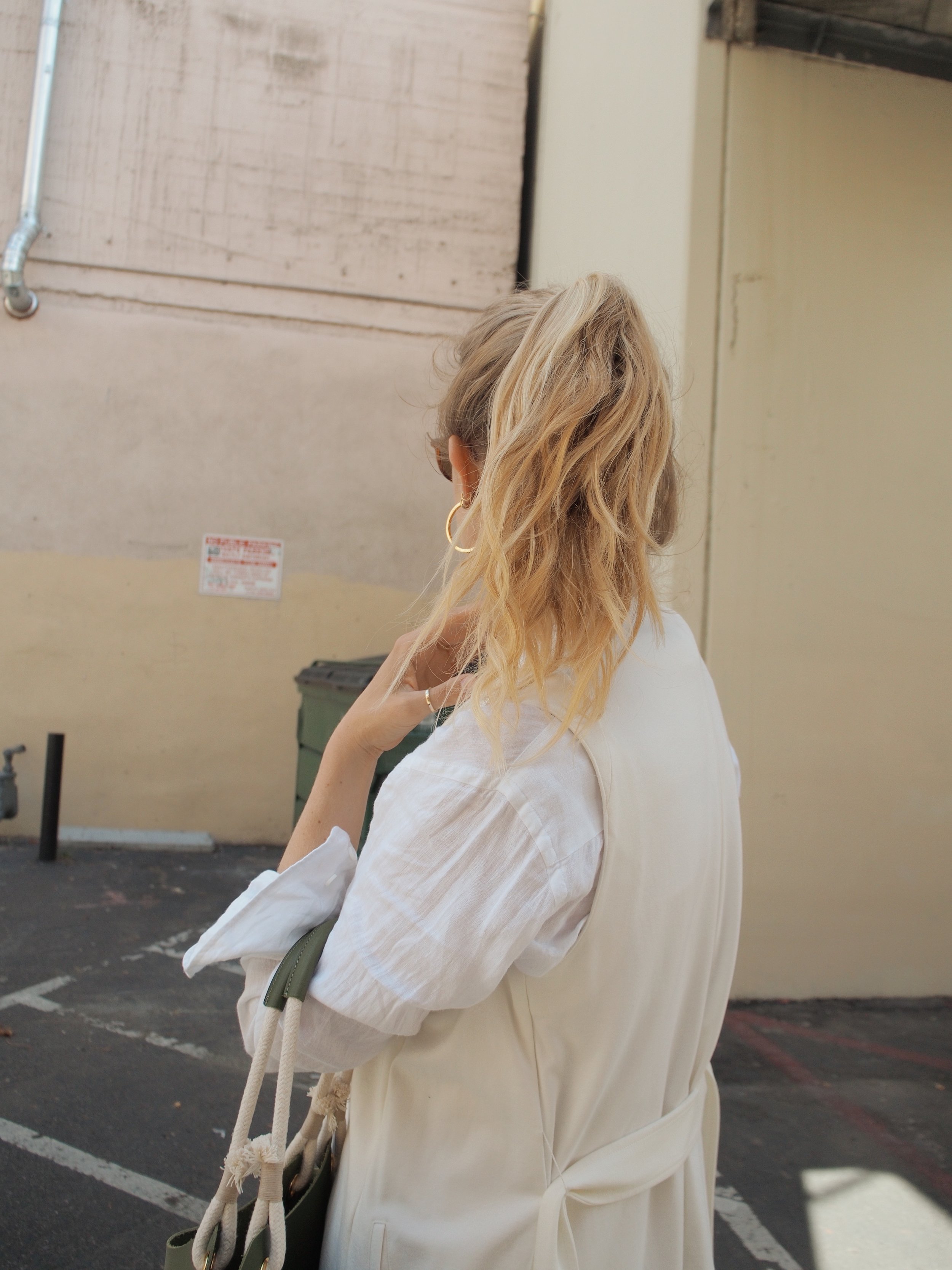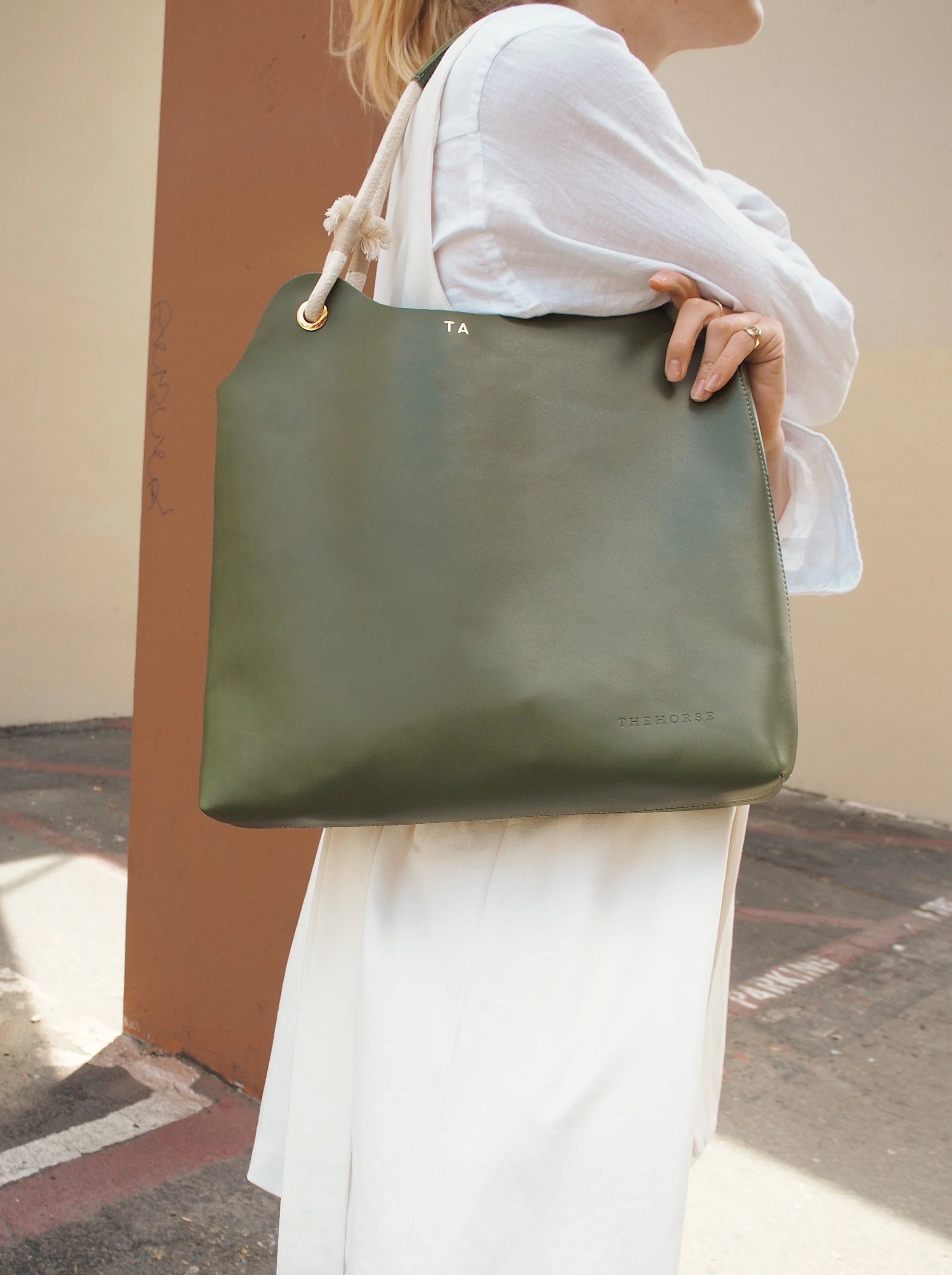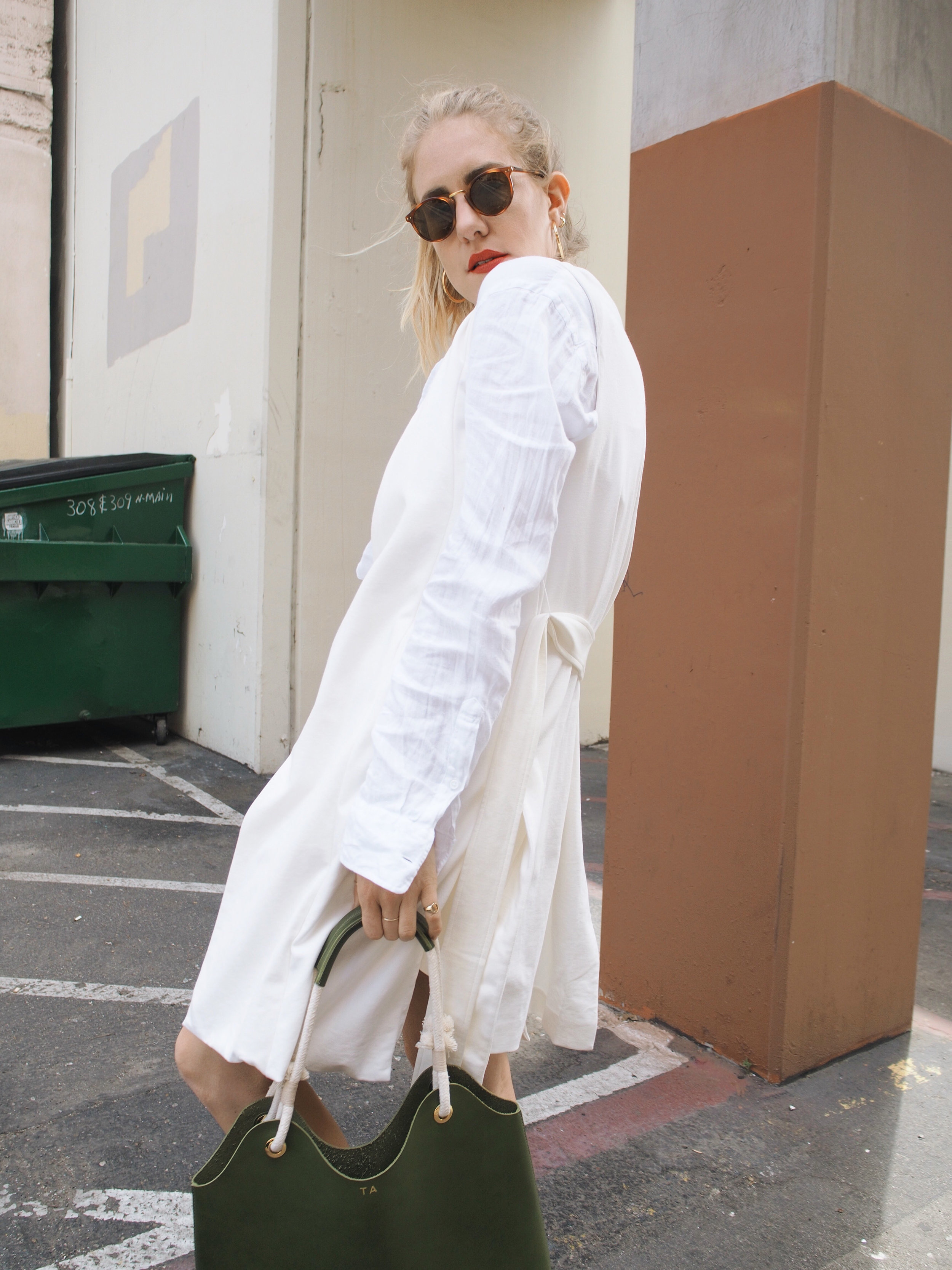 I love wearing all white, no matter what time of the year it is. Mixing shades of this color gives an outfit a fresh look when paired with darker accessories and vintage sunnies. I found these vintage sunnies at a local flea market this past Saturday for $2. In beautiful condition, they look almost identical to my Céline sunglasses I wore constantly last summer. I've come to love flea markets so much because every time I buy something, I cherish it forever. The majority of my home is decorated with secondhand goods, and it also makes up about 50/50 of my closet. I've had this Vince side slit vest for a few seasons and it always comes in clutch when I need it. For this outfit, I paired it with silk shorts that matched and a crisp white linen Oxford shirt from Grana. I've been in love with Grana all year long because of the quality and versatility in their pieces. I know I will be wearing this shirt forever and made sure to get a size larger for that perfect menswear fit. Can't forget to mention this gorgeous olive Everyday tote via The Horse that has my initials embossed right on the front so beautifully. The rope detailing of the handles give this bag a perfect excuse to be carried around all summer long, while sporting an editorial shade of green.