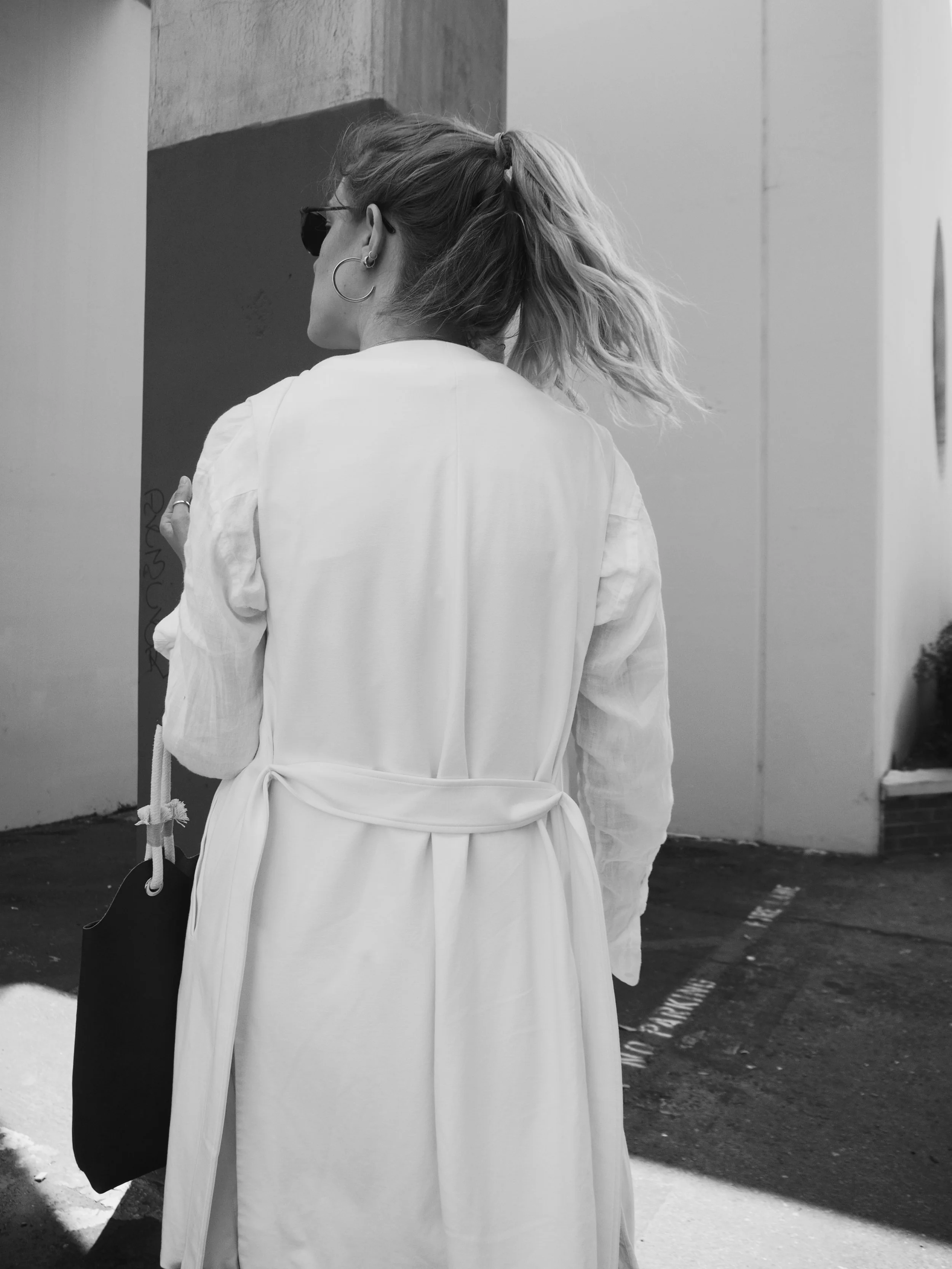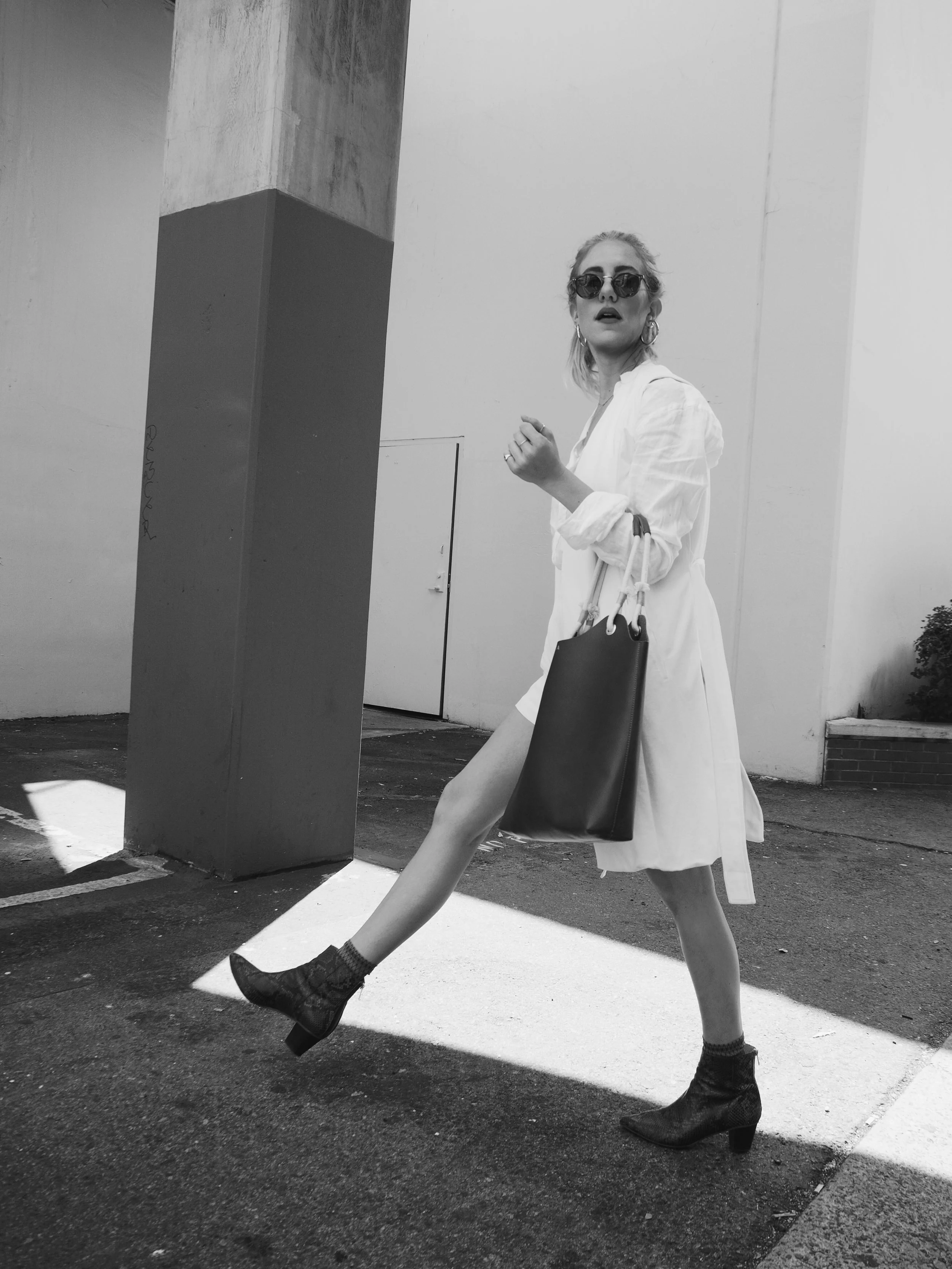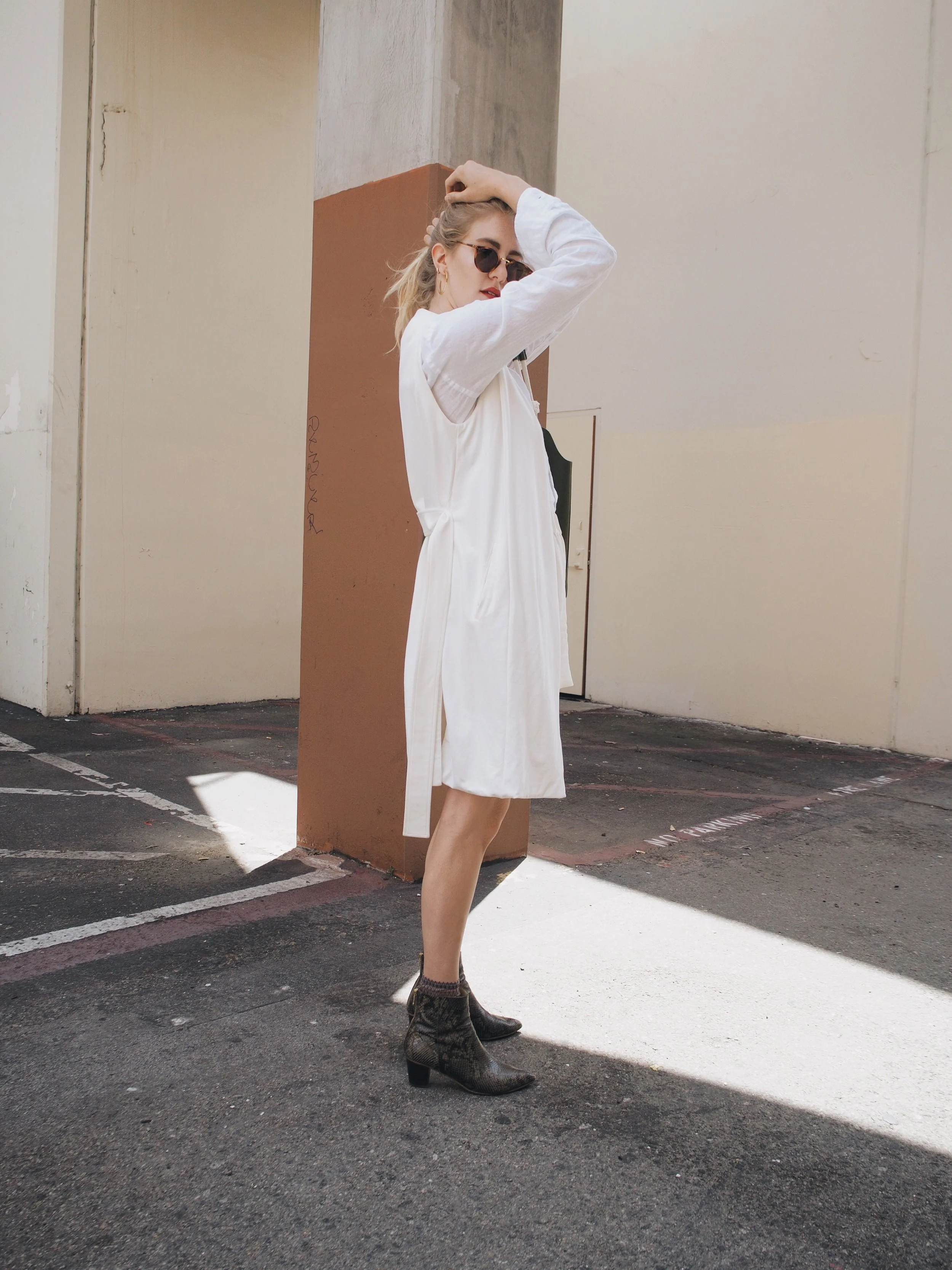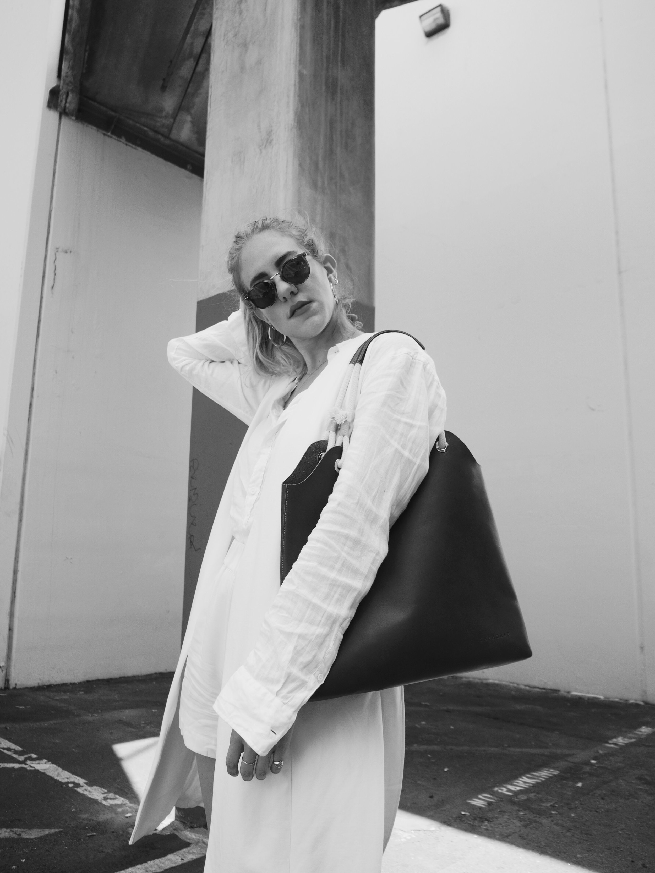 I love wearing all white, no matter what time of the year it is. Mixing shades of this color gives an outfit a fresh look when paired with darker accessories and vintage sunnies. I found these vintage sunnies at a local flea market this past Saturday for $2. In beautiful condition, they look almost identical to my Céline sunglasses I wore constantly last summer. I've come to love flea markets so much because every time I buy something, I cherish it forever. The majority of my home is decorated with secondhand goods, and it also makes up about 50/50 of my closet. I've had this Vince side slit vest for a few seasons and it always comes in clutch when I need it. For this outfit, I paired it with silk shorts that matched and a crisp white linen Oxford shirt from Grana. I've been in love with Grana all year long because of the quality and versatility in their pieces. I know I will be wearing this shirt forever and made sure to get a size larger for that perfect menswear fit. Can't forget to mention this gorgeous olive Everyday tote via The Horse that has my initials embossed right on the front so beautifully. The rope detailing of the handles give this bag a perfect excuse to be carried around all summer long, while sporting an editorial shade of green.