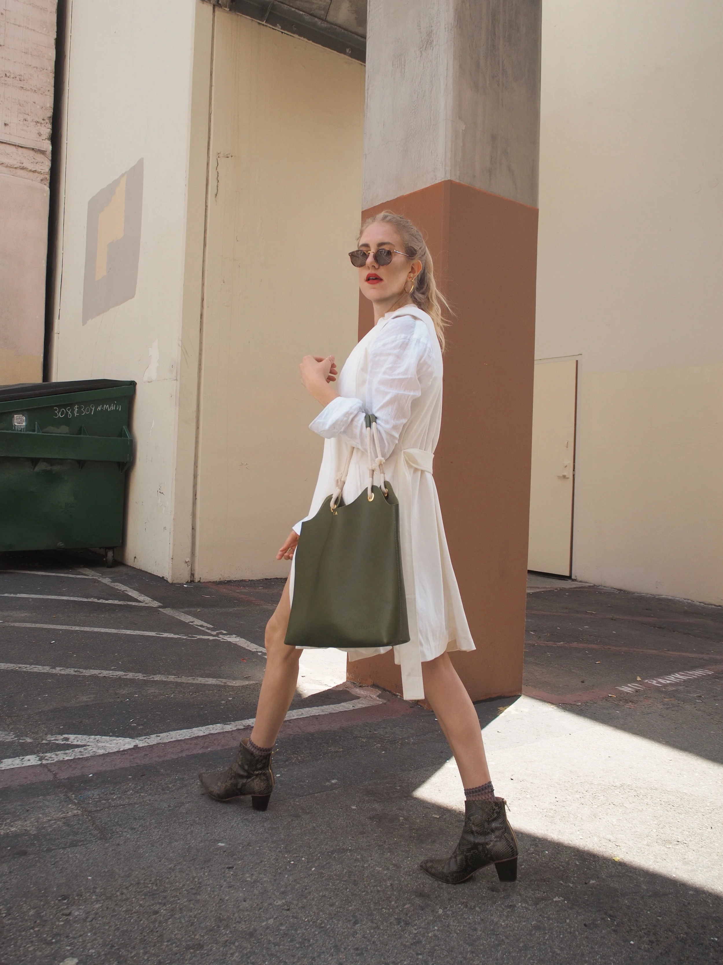 Wearing: Vince Sleeveless Vest | Grana Oxford Classic Shirt | Grana Loose Silk Shorts | The Horse Everyday Bag in Olive | Vintage Sunnies | ATP Snakeskin Boots in Olive | Argento Vivo Open Hoops | M. Hisae Figure Ring