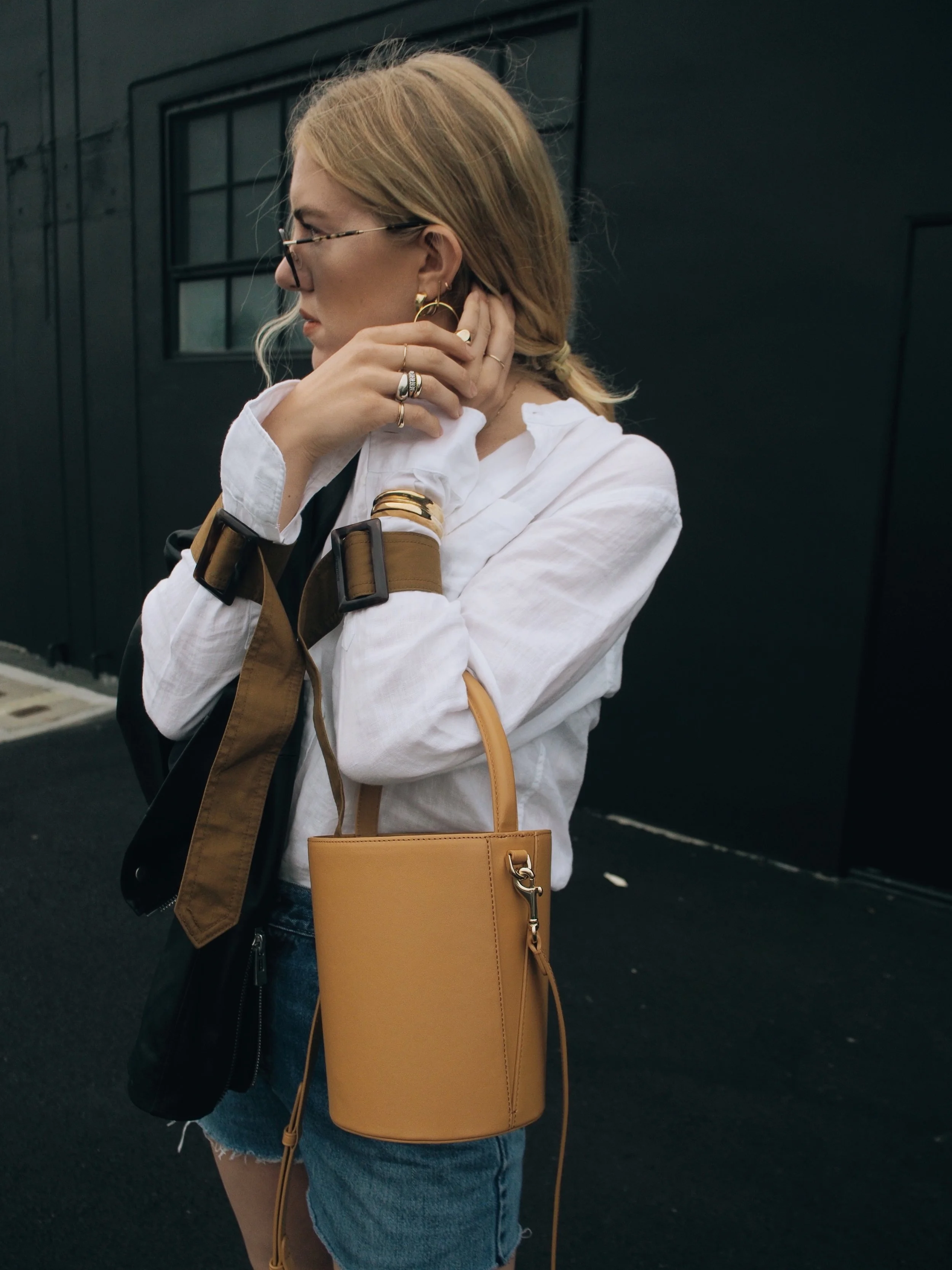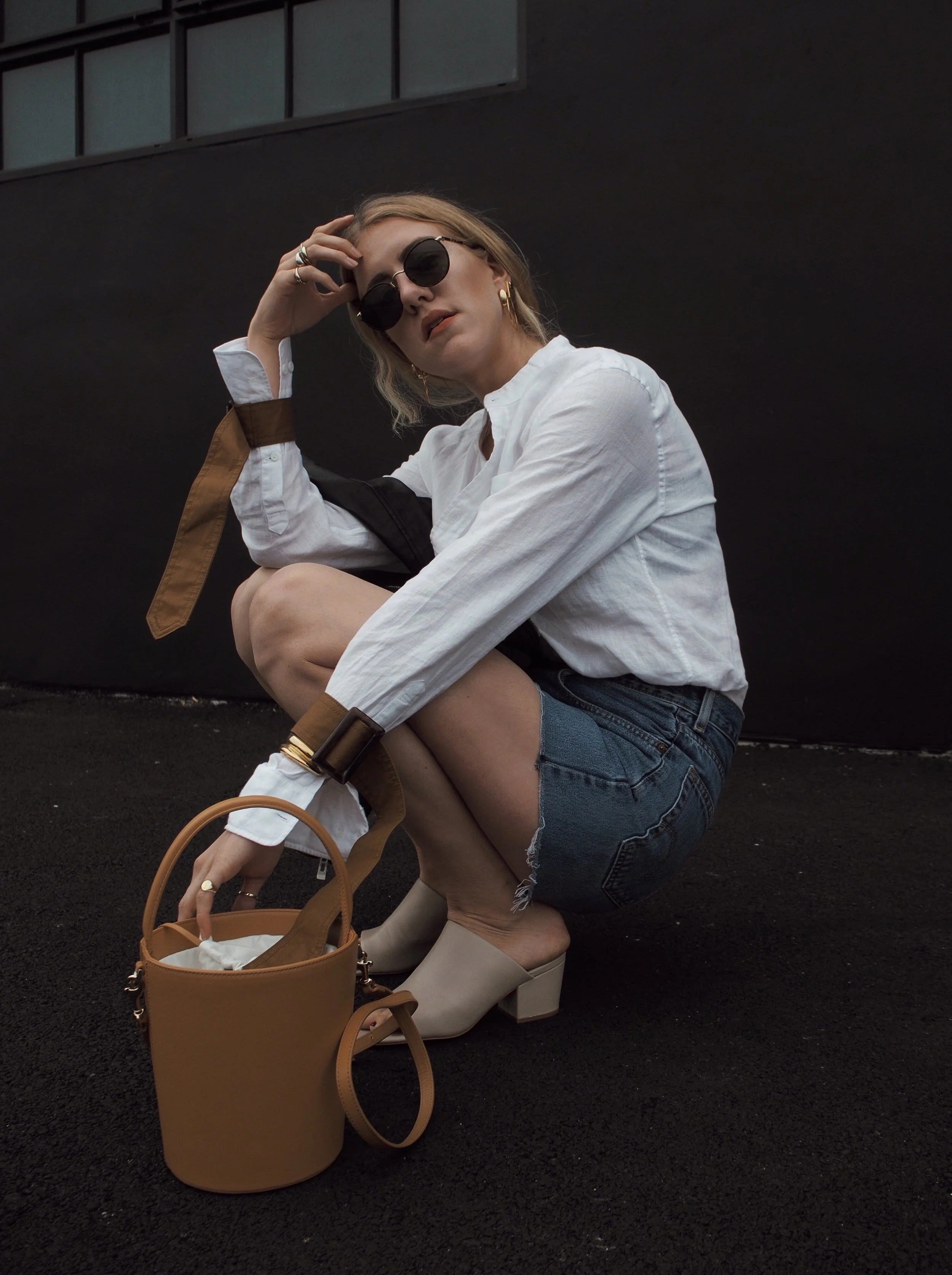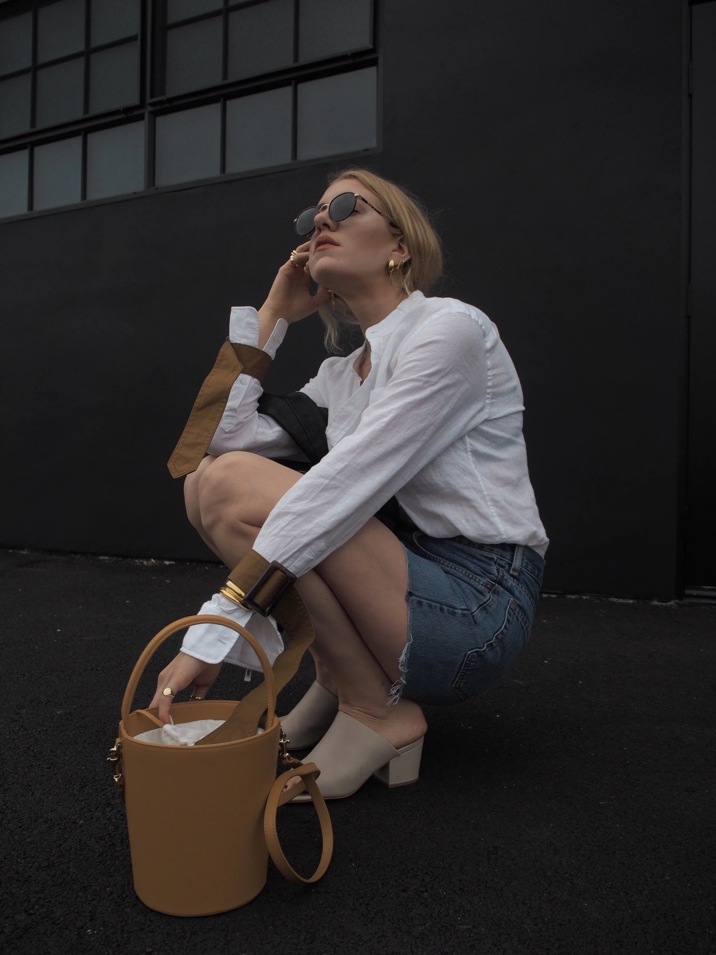 I love wearing men's clothes. When paired with feminine pieces, men's clothing becomes instantly unisex. That's the beauty of being a woman.. we can put on a piece of clothing and make it our own with a little styling. A men's button up shirt doesn't have to be boring. While I am all for the classic high waist denim and undone button up, there is something fun about unexpected details. I took sleeve belts from a trench I have and a thick gold cuff bracelet from Ursa Major jewelry and piled on top of an open sleeve. With a bucket bag and mules for a neutral addition, this look is just the right amount of yes.