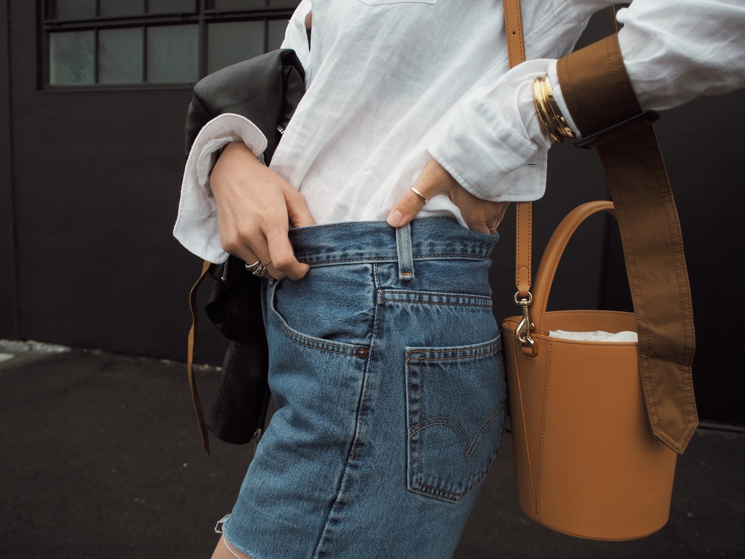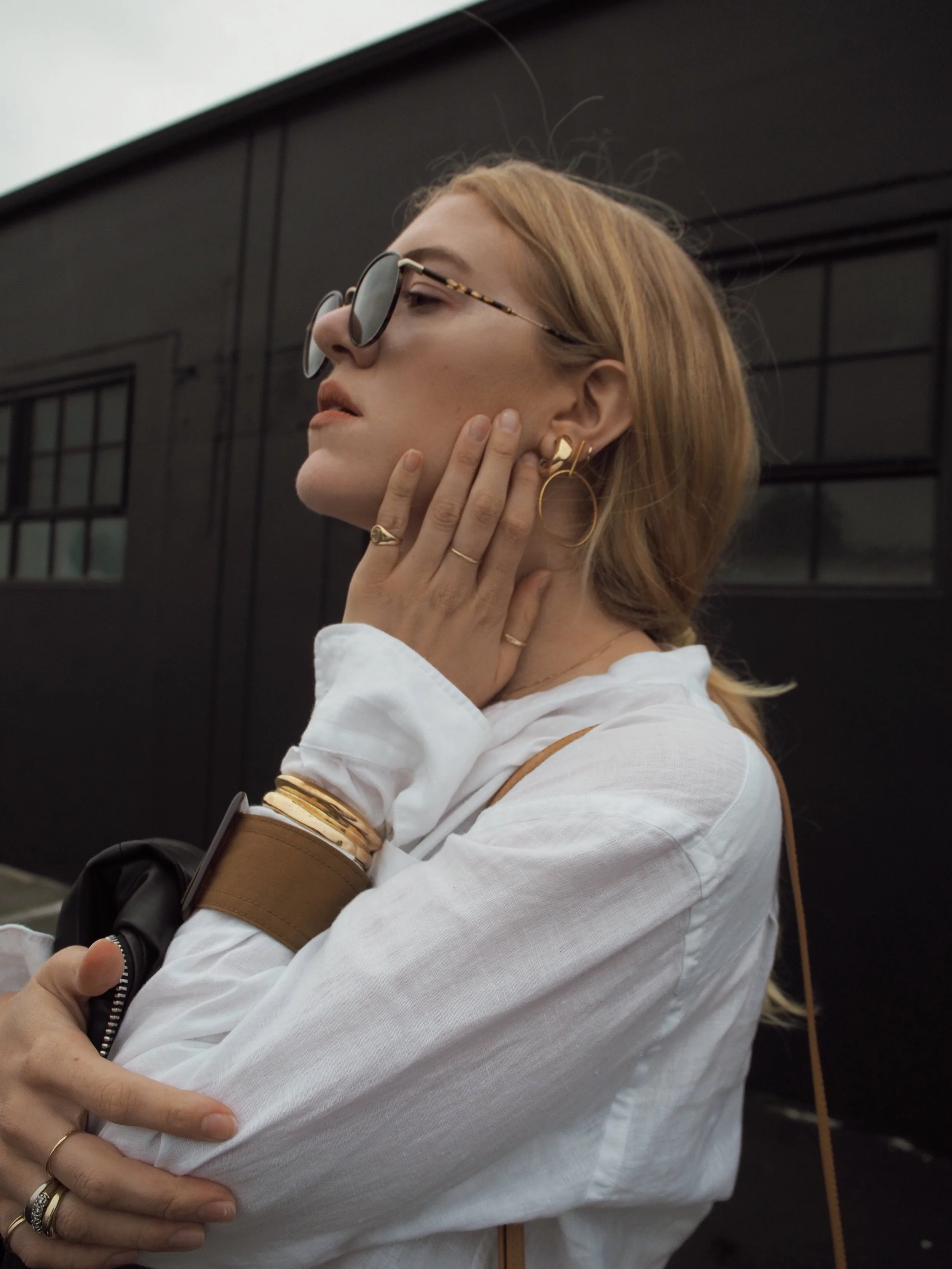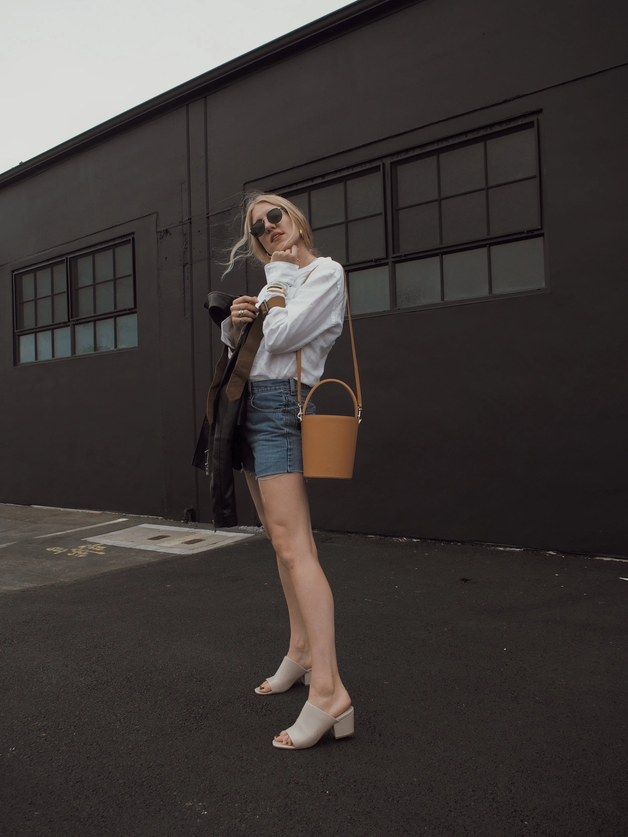 I love wearing men's clothes. When paired with feminine pieces, men's clothing becomes instantly unisex. That's the beauty of being a woman.. we can put on a piece of clothing and make it our own with a little styling. A men's button up shirt doesn't have to be boring. While I am all for the classic high waist denim and undone button up, there is something fun about unexpected details. I took sleeve belts from a trench I have and a thick gold cuff bracelet from Ursa Major jewelry and piled on top of an open sleeve. With a bucket bag and mules for a neutral addition, this look is just the right amount of yes.