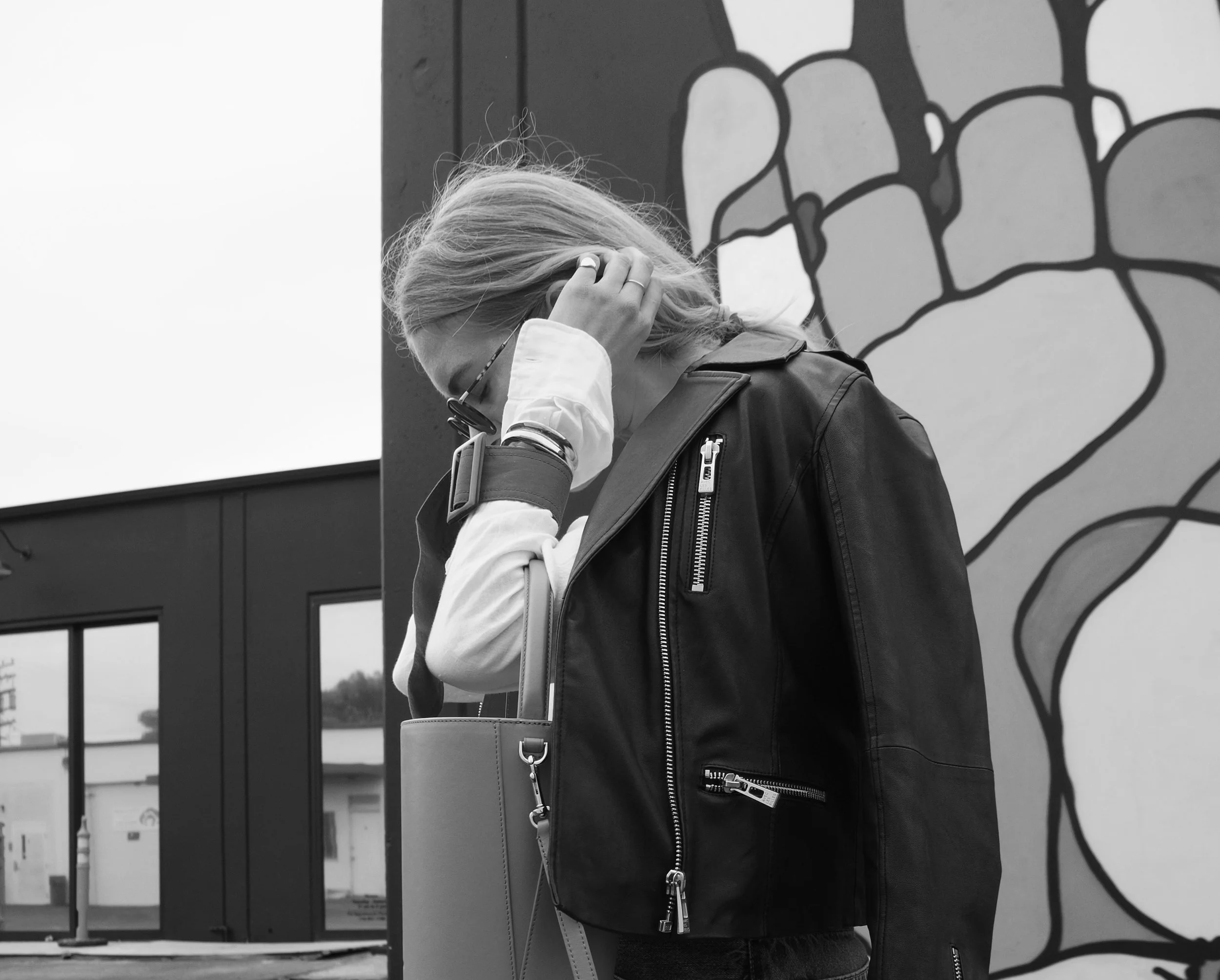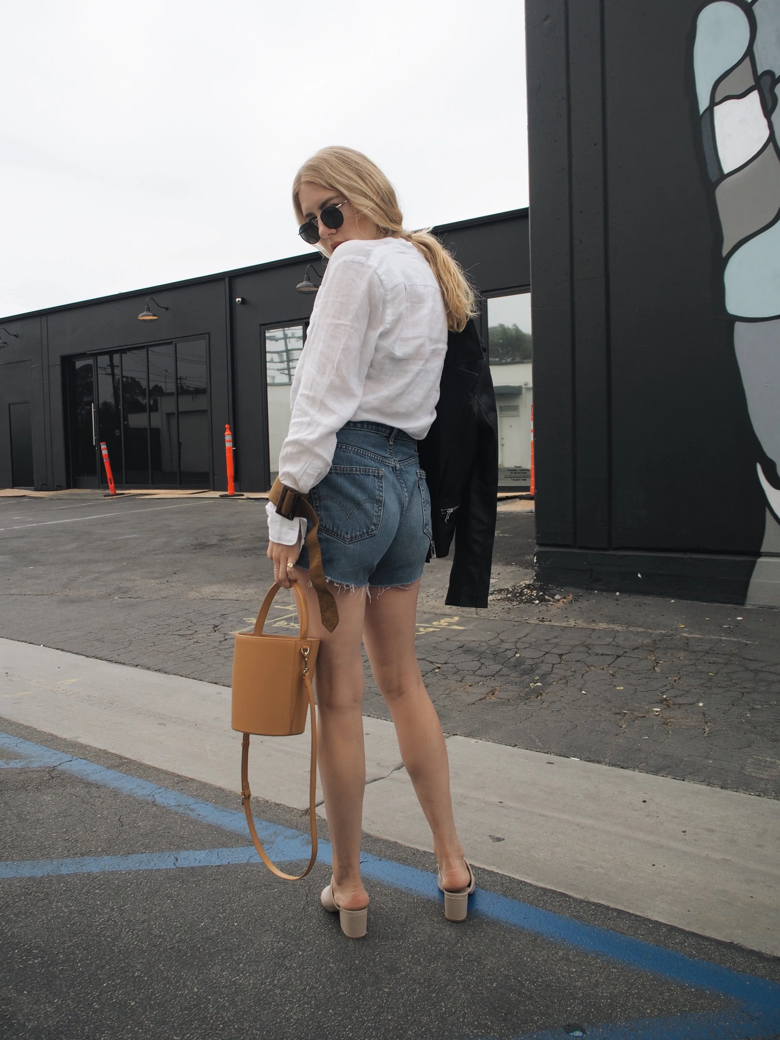 Wearing: Grana Men's Linen Collarless Shirt | Vintage Levi's | Avec Les Filles Leather Moto Jacket | Article& Marcy Mule | Cafuné Bucket Bag | Raen Mason Sunglasses | Ursa Major Cori Cuff