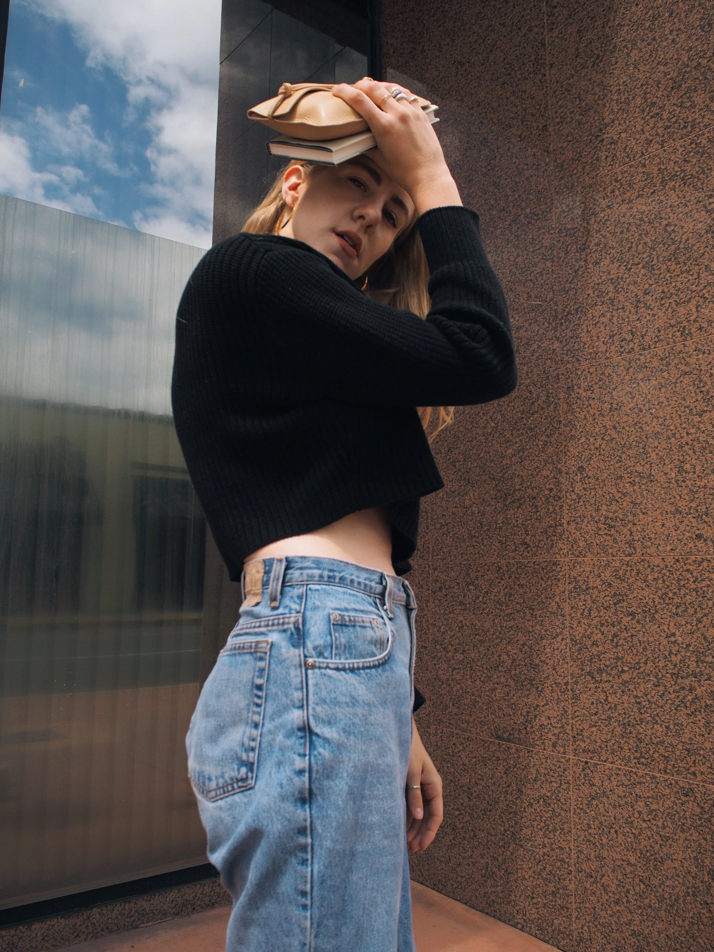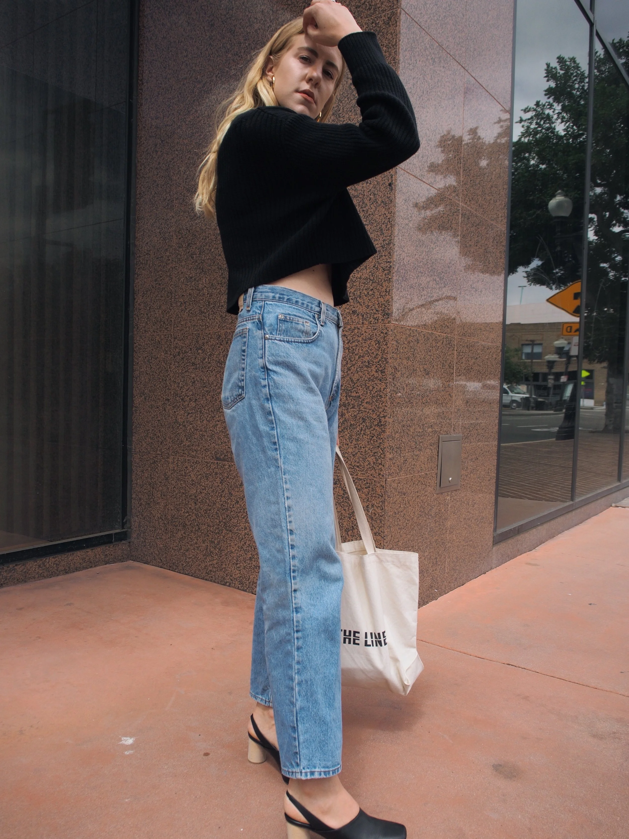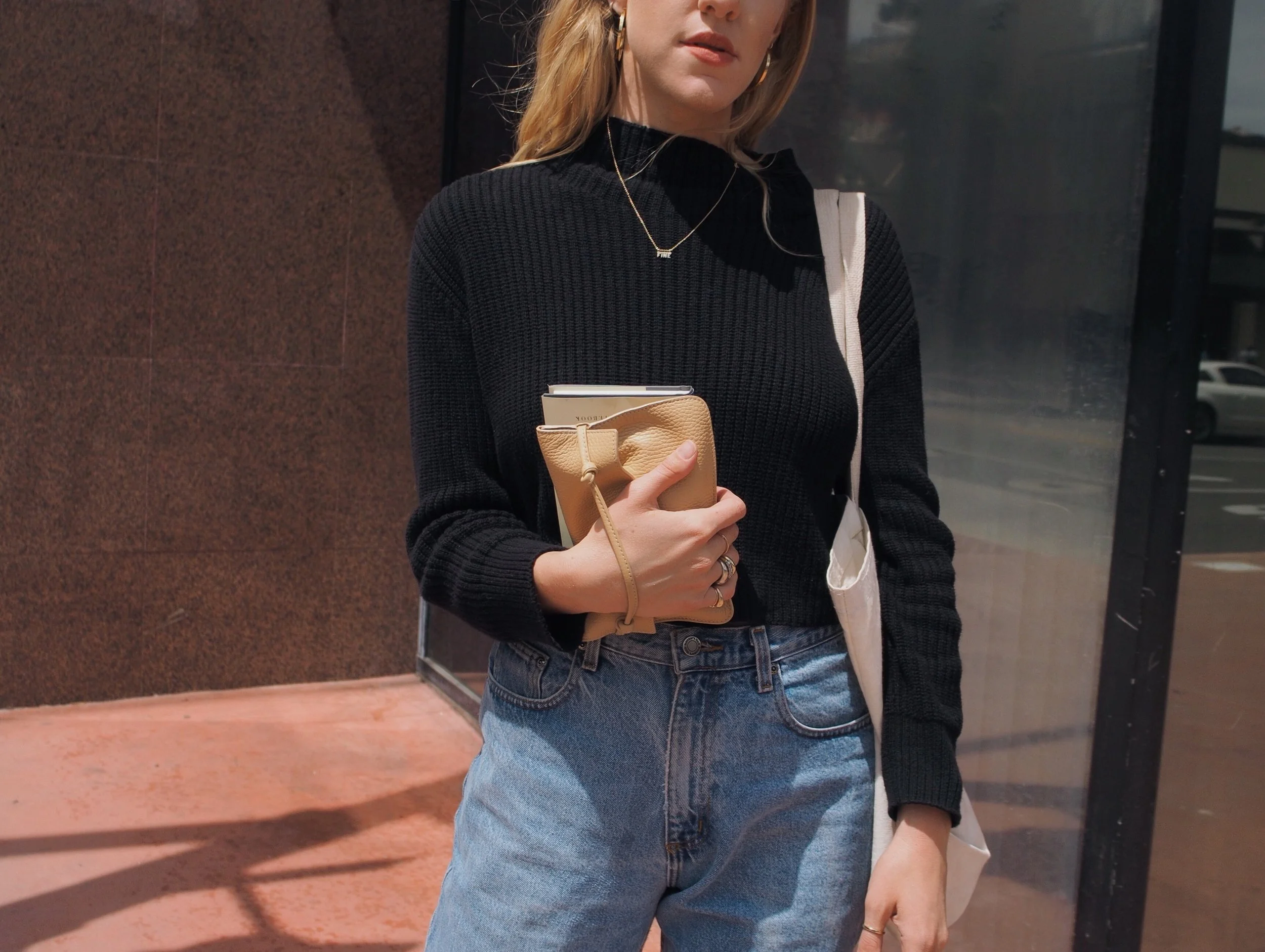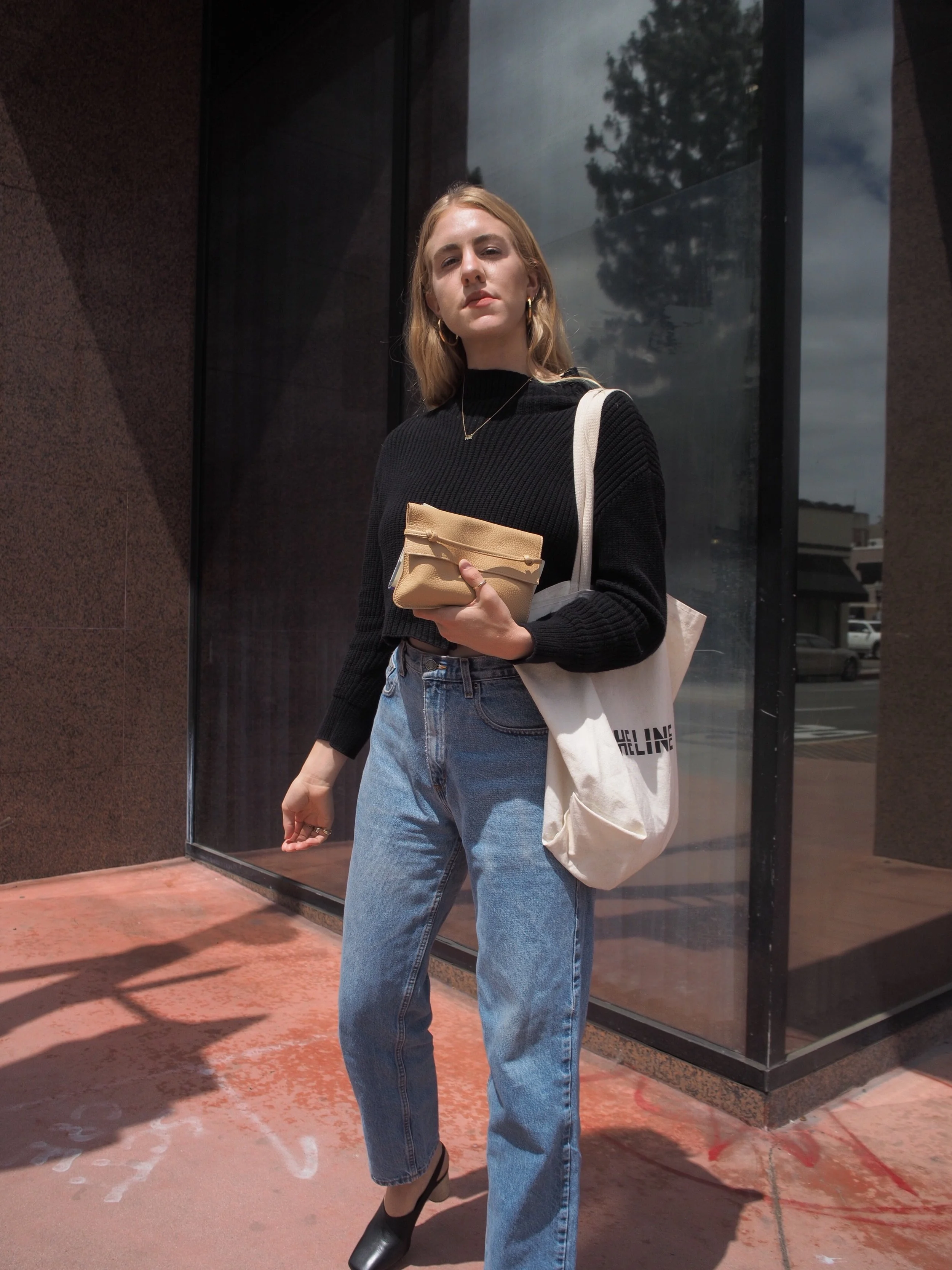 Wearing: Rachel Comey Sweater | Vintage Denim | Shaina Mote Menhir Mule | von Holzhausen Pouch in Sand | Argento Vivo Open Hoops