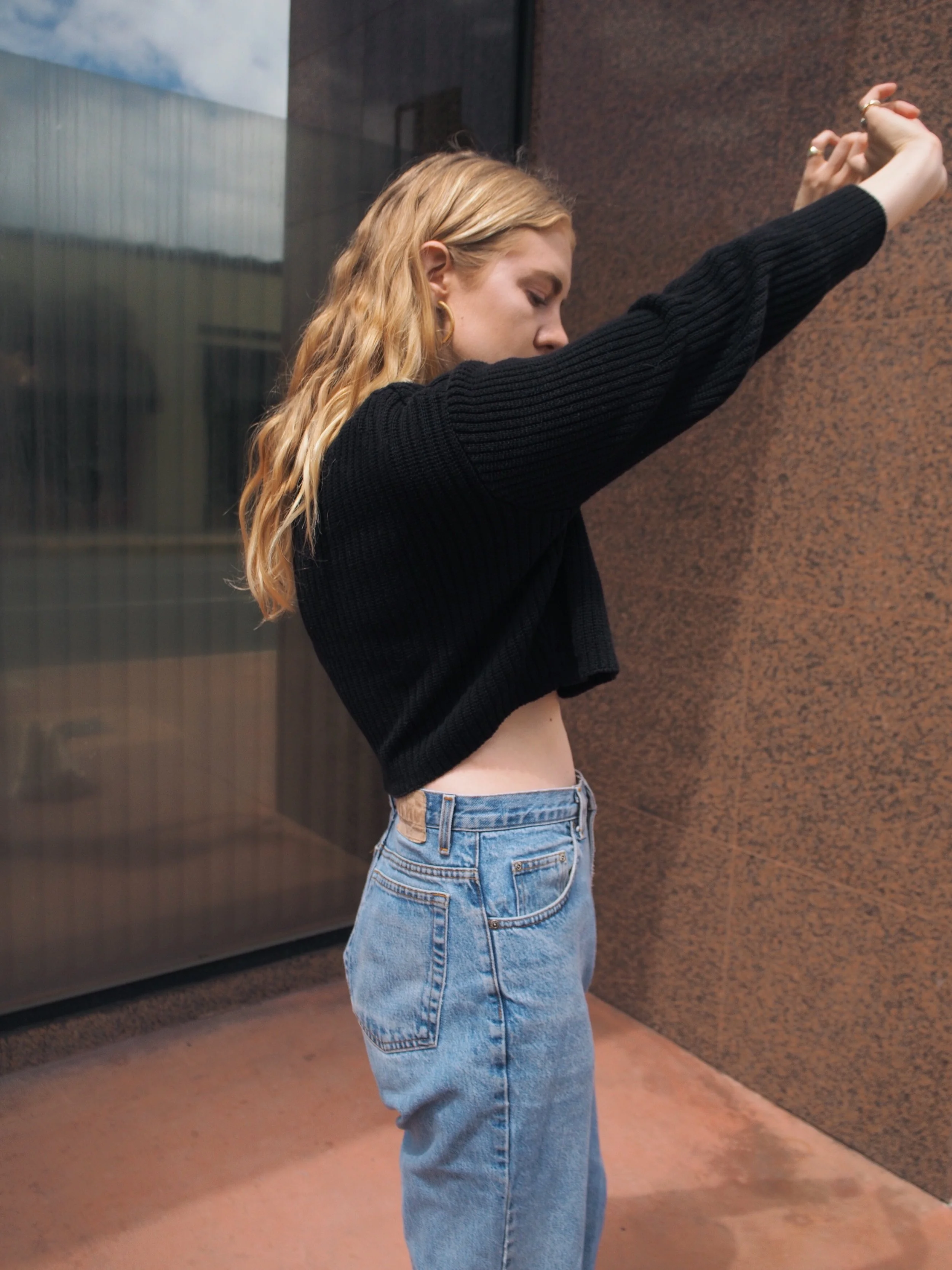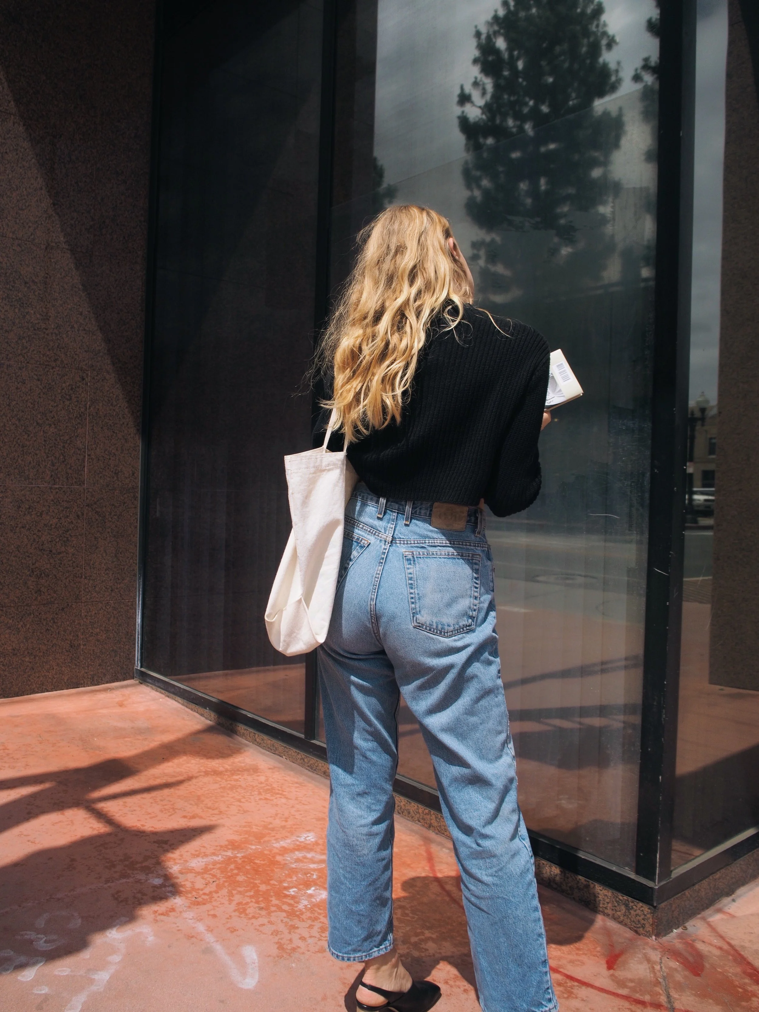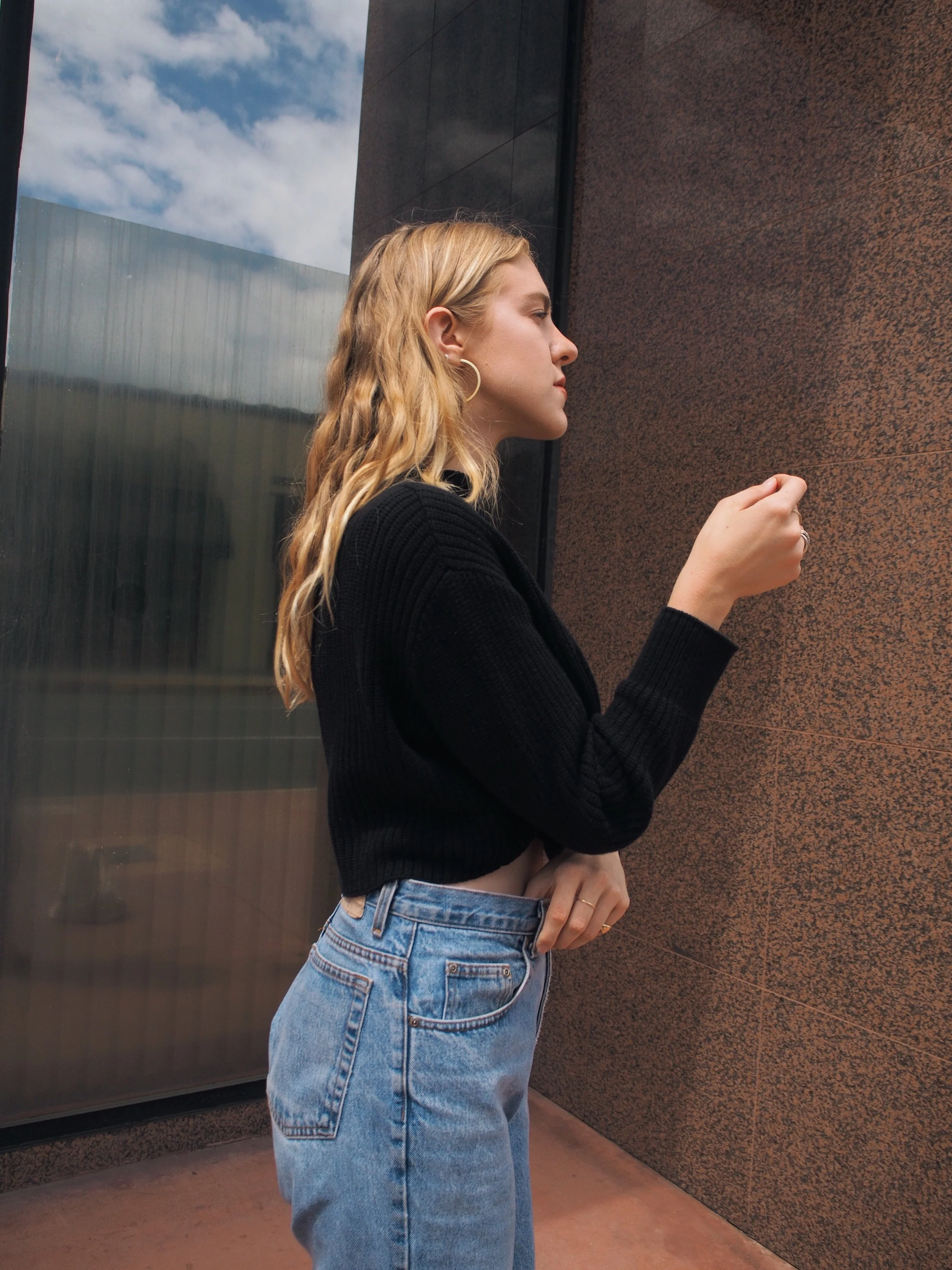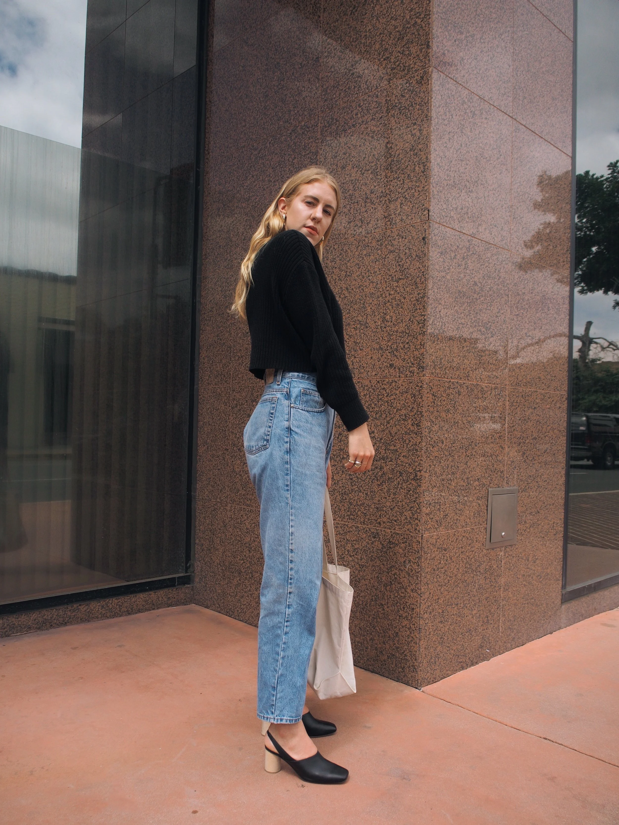 Wearing: Rachel Comey Sweater | Vintage Denim | Shaina Mote Menhir Mule | von Holzhausen Pouch in Sand | Argento Vivo Open Hoops