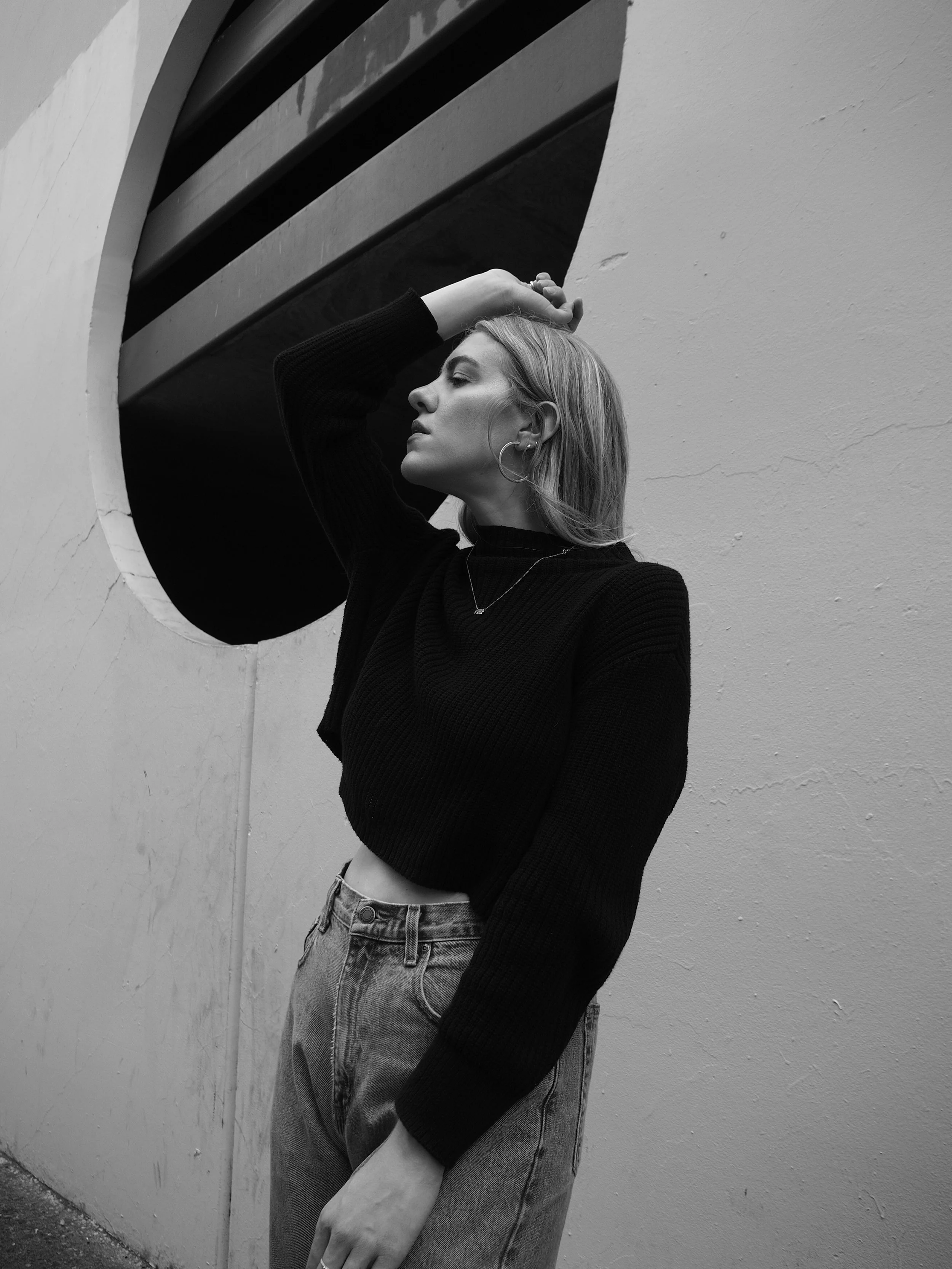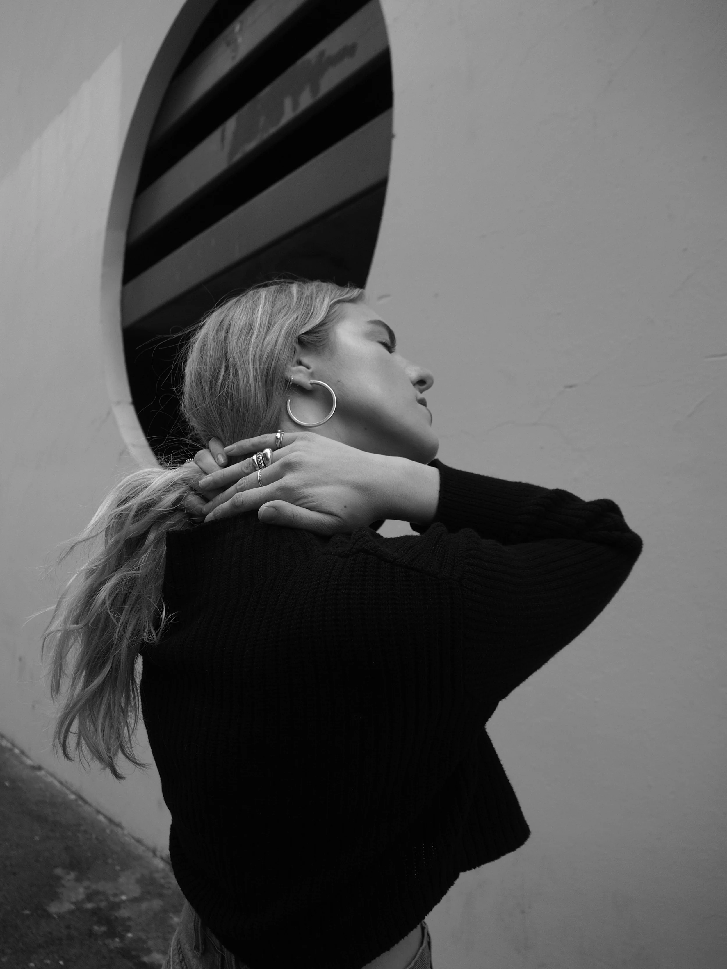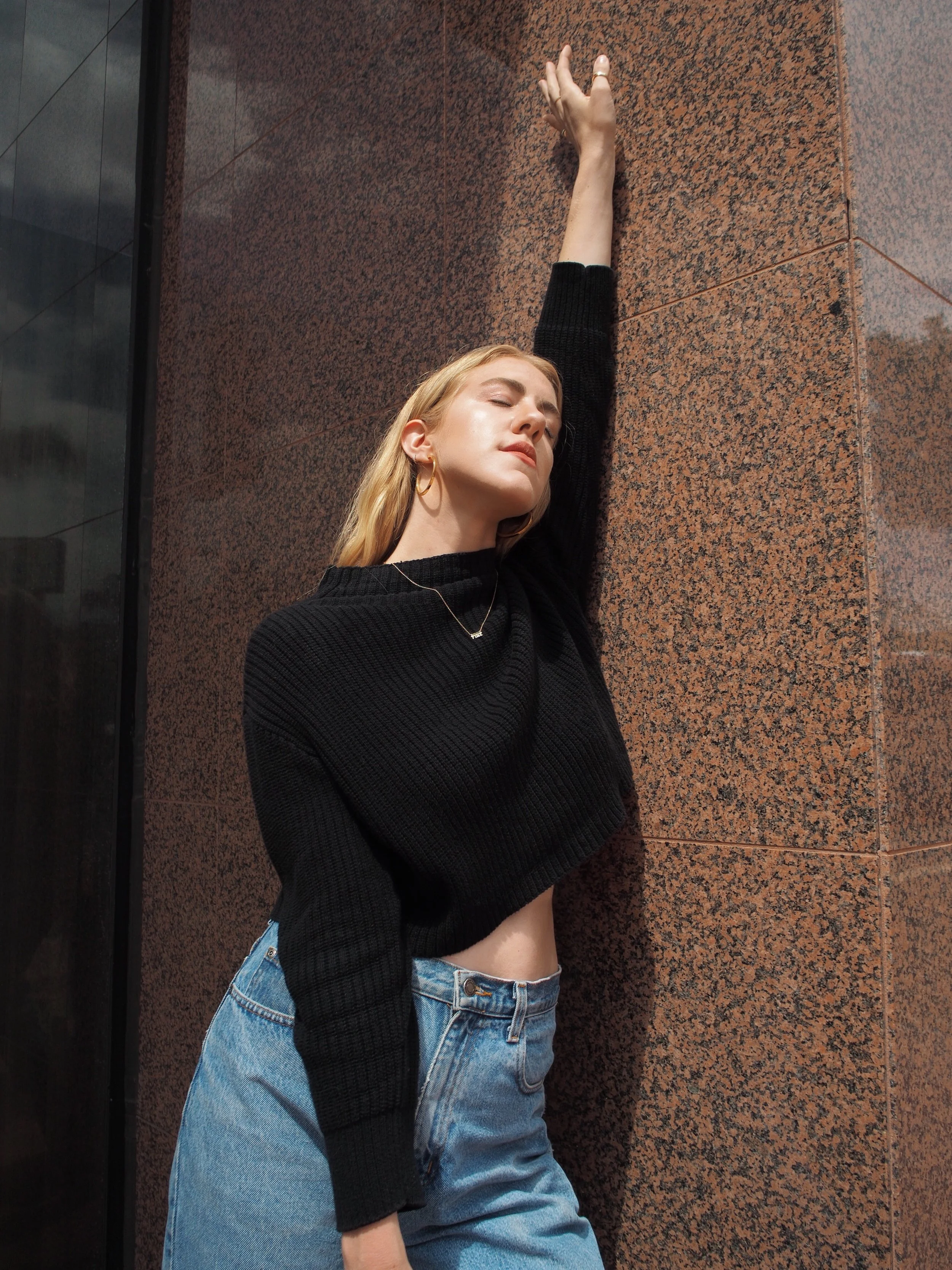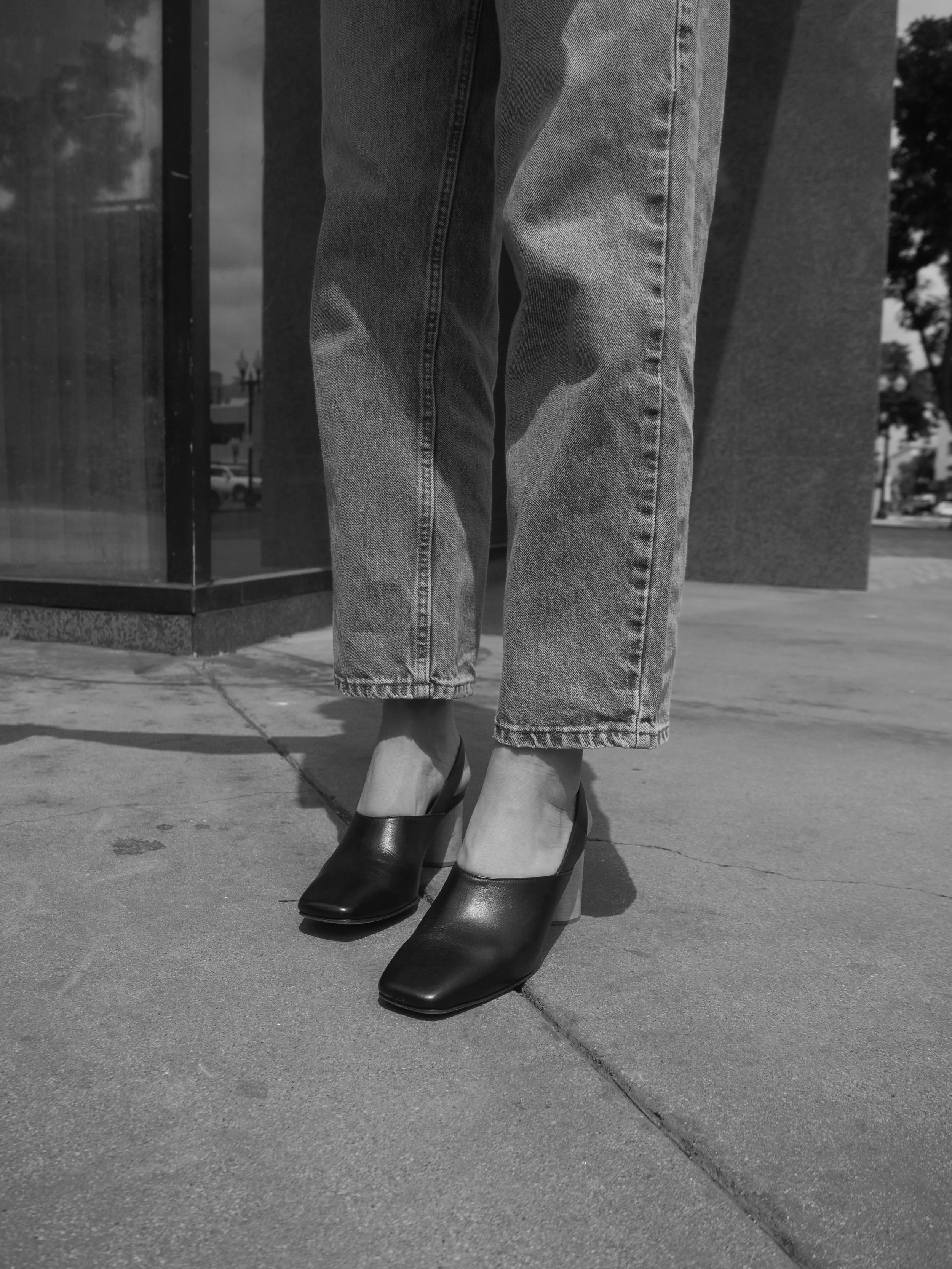 Wearing: Rachel Comey Sweater | Vintage Denim | Shaina Mote Menhir Mule | von Holzhausen Pouch in Sand | Argento Vivo Open Hoops
