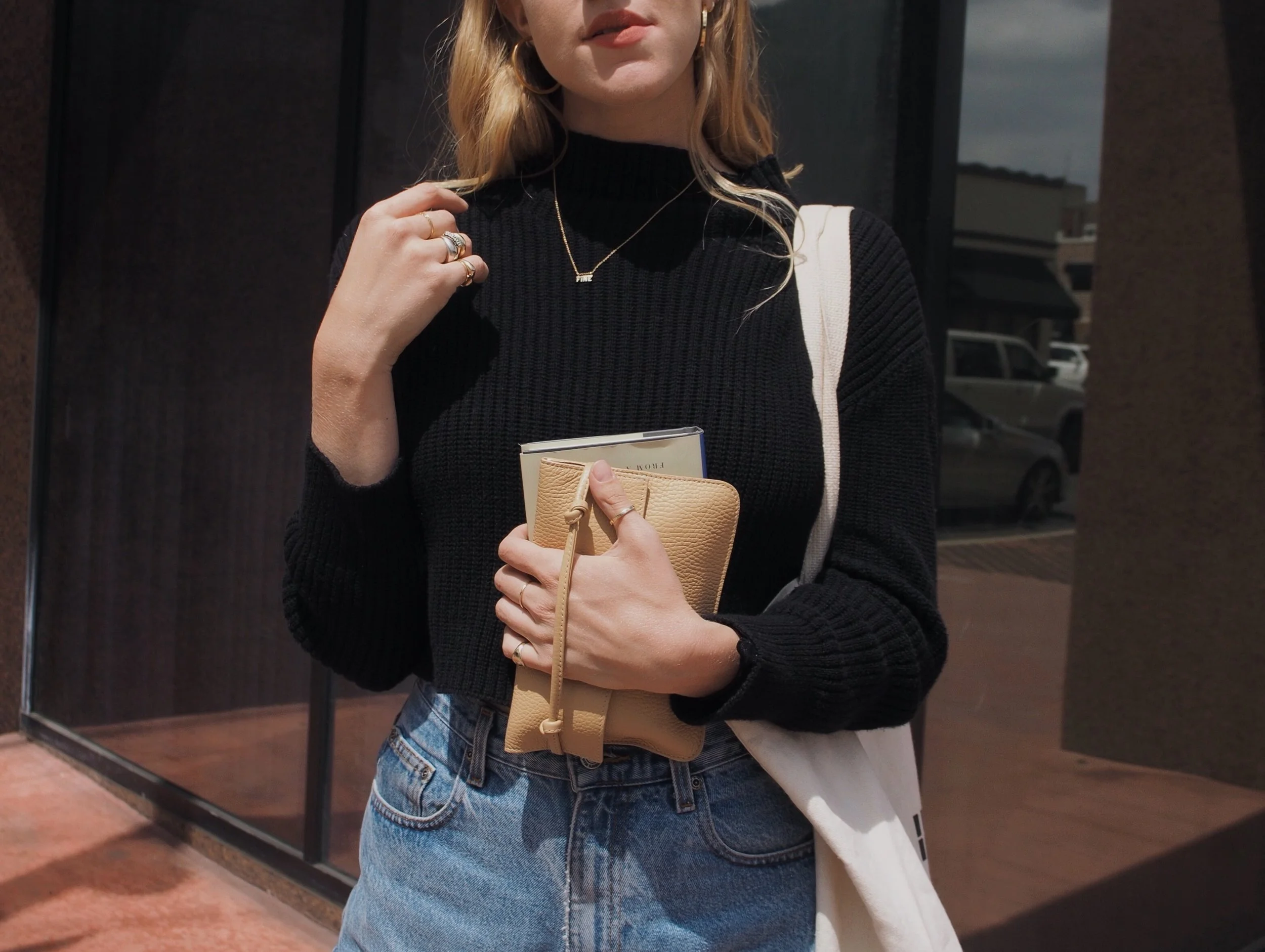 Continuing with my ongoing collaboration with von Holzhausen and sharing my favorite travel clutch, I've decided that bringing less is always a better option when running out the door. Lately I've been taking a more minimal approach when it comes to my handbag situation. I've always been the one to have a heavier handbag for the 'just in case' moments. I am the type of person who likes to be prepared for things. For example, I typically have an extra pair of shoes in my car or a sweater in case I get cold. While I still do those things, it's nice to have a lighter option when it comes to what I carry around all day. When I leave the house with only my necessities (keys, phone, wallet, lip tint and a book). I find myself feeling lighter as well, metaphorically speaking of course. This little pouch by von Holzhausen is actually one of my favorites. I used to carry it in a larger bag, full of euros while in Paris, and more typically a lipstick and keys. Now I carry it as the only thing I need (along with a canvas tote used for groceries, dog mom things, etc). It has a minimal leather strap across the front which is perfect for closure, as well as a place to slip your hand in a stylish fashion.