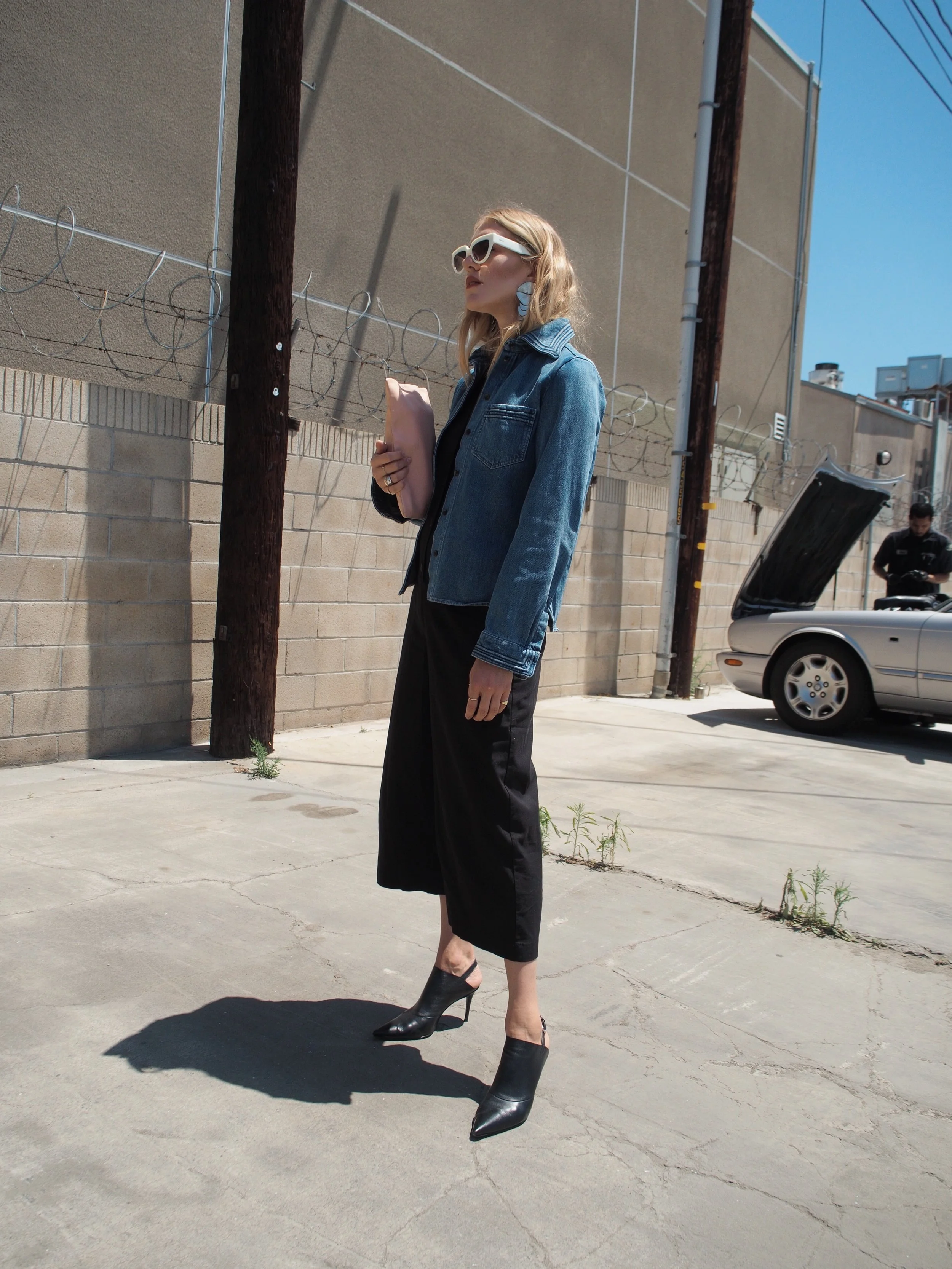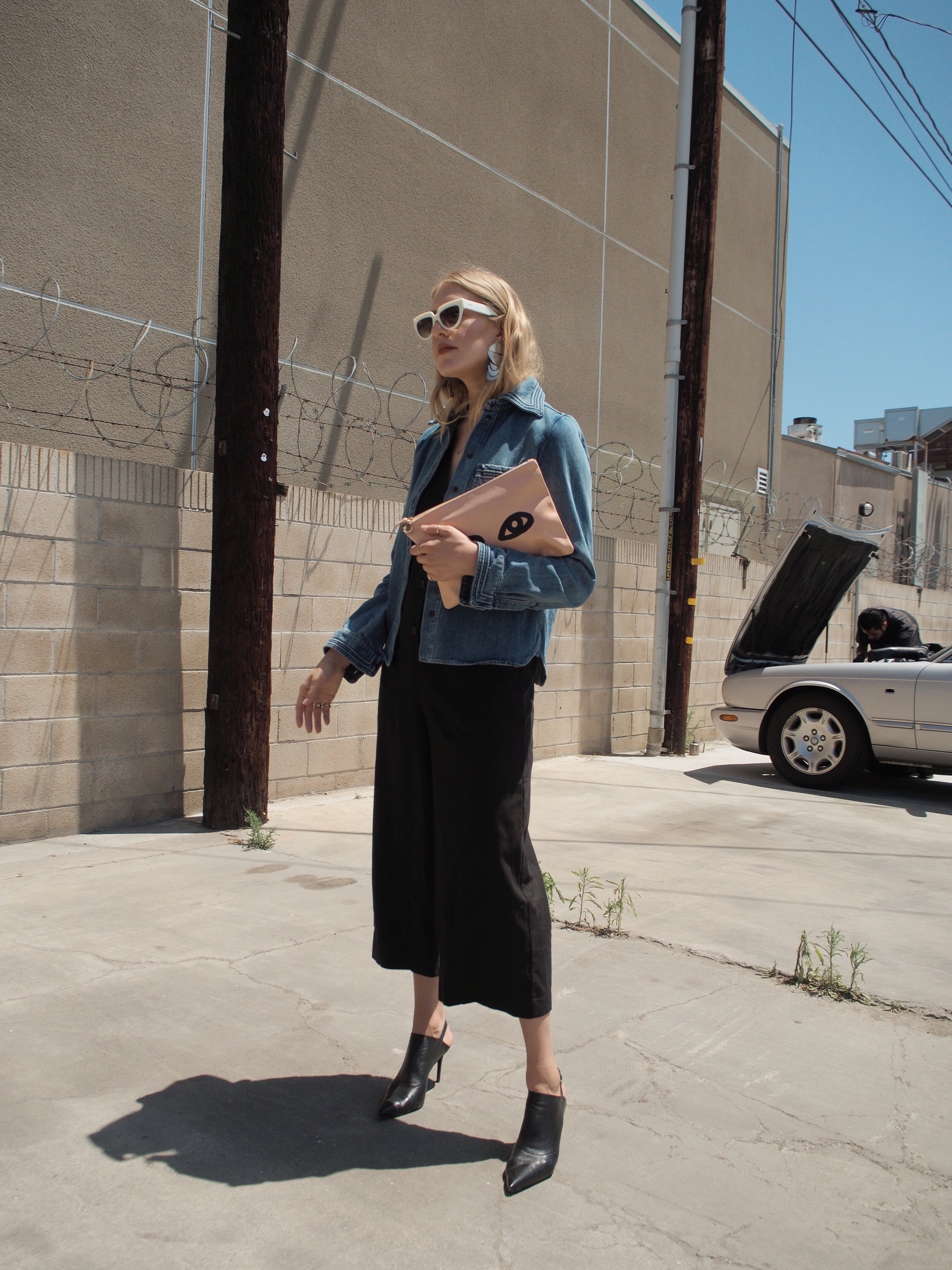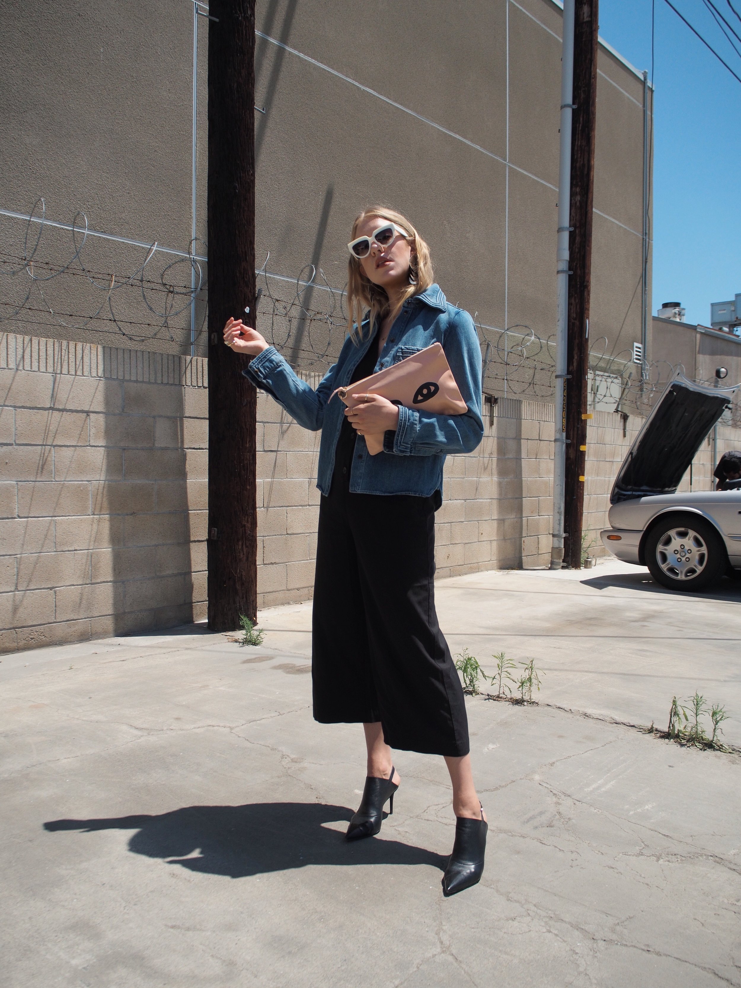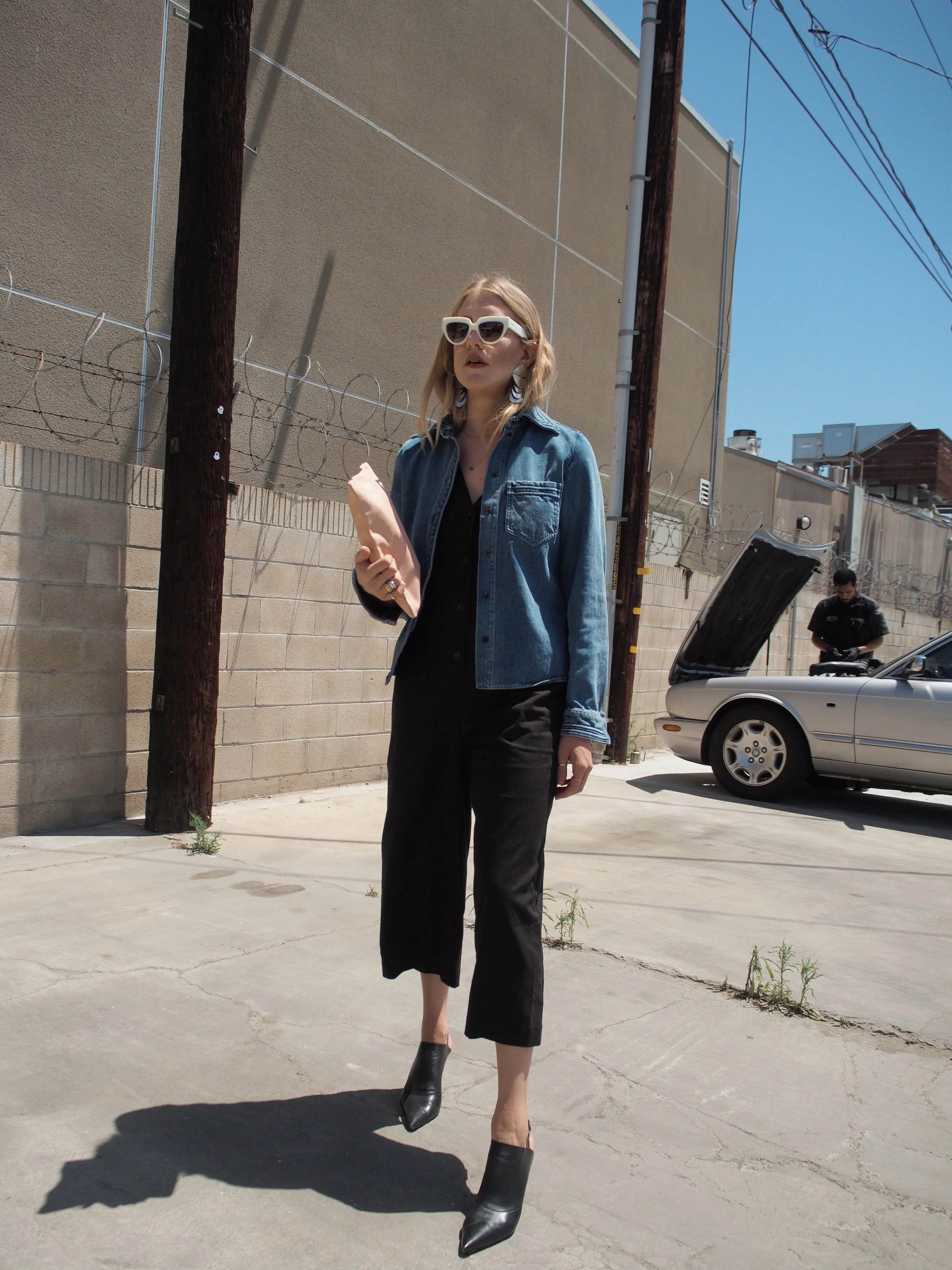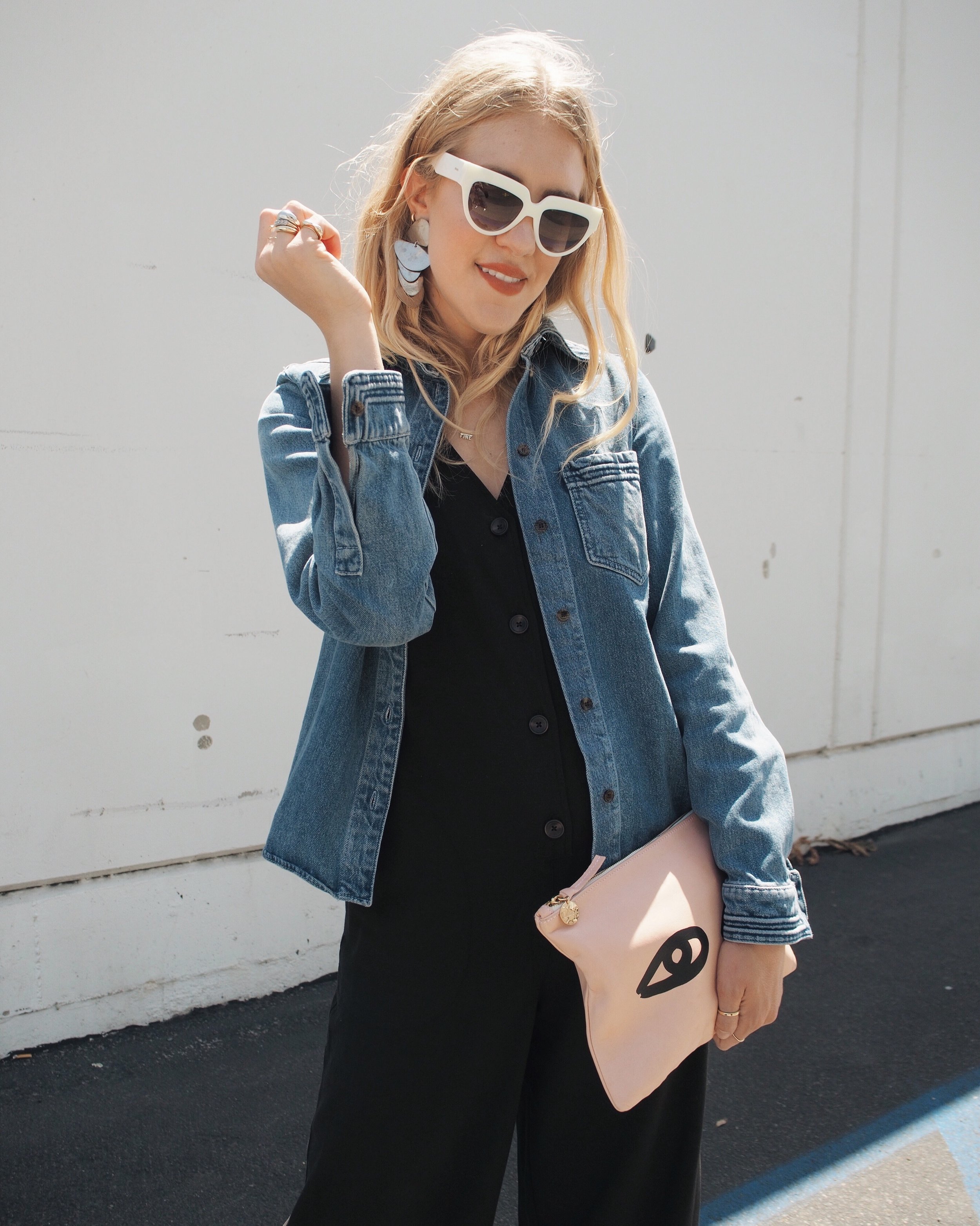 Wearing: Chloé Denim Button-Up | Leo & Sage Black Jumpsuit | Prada Sunglasses | Acne Slingback Pointed Mules | Clare V Flat Clutch (similar) | The2Bandits Earrings