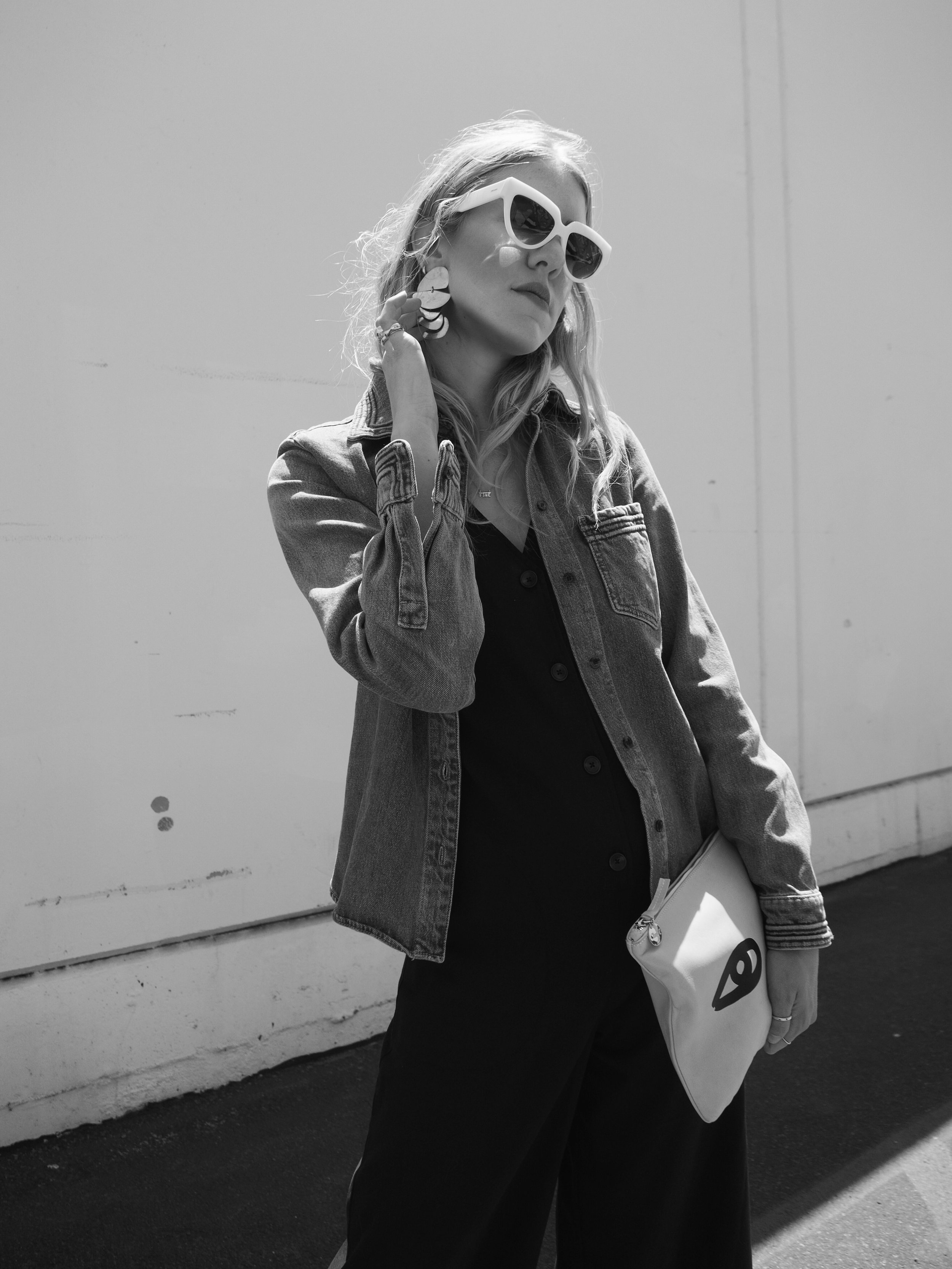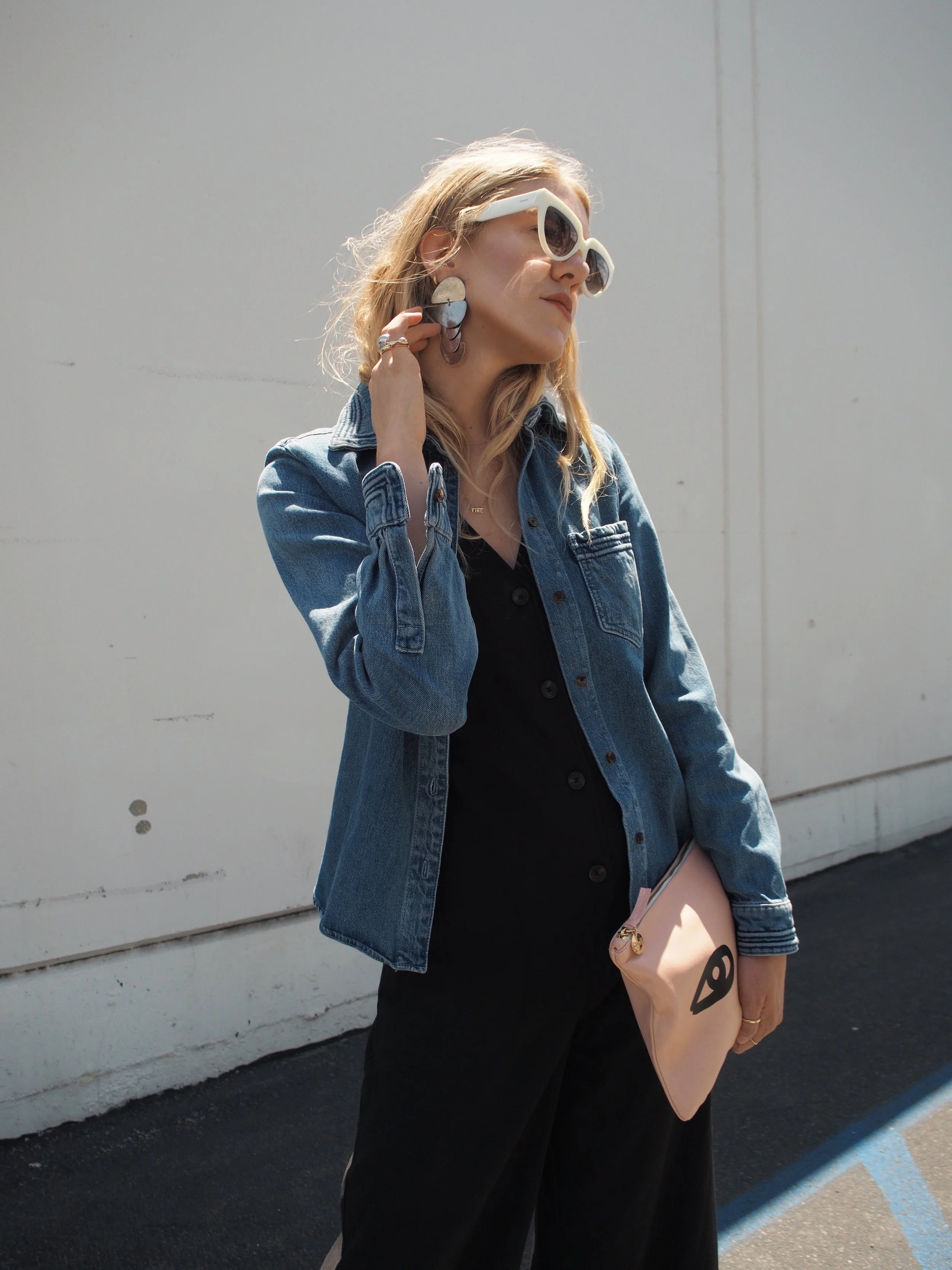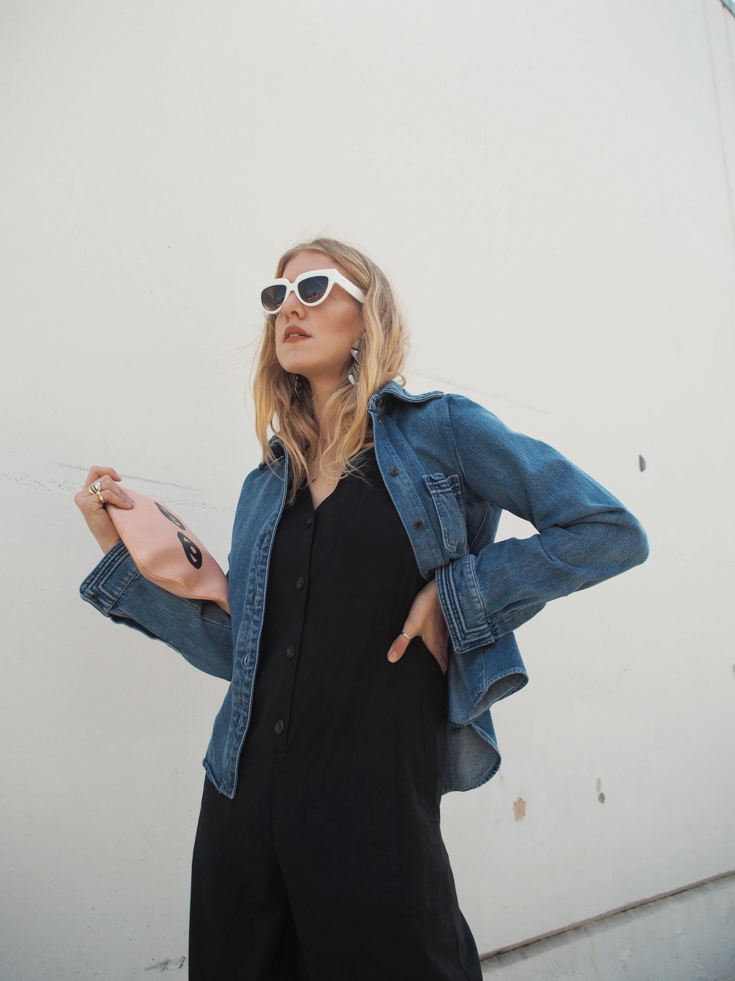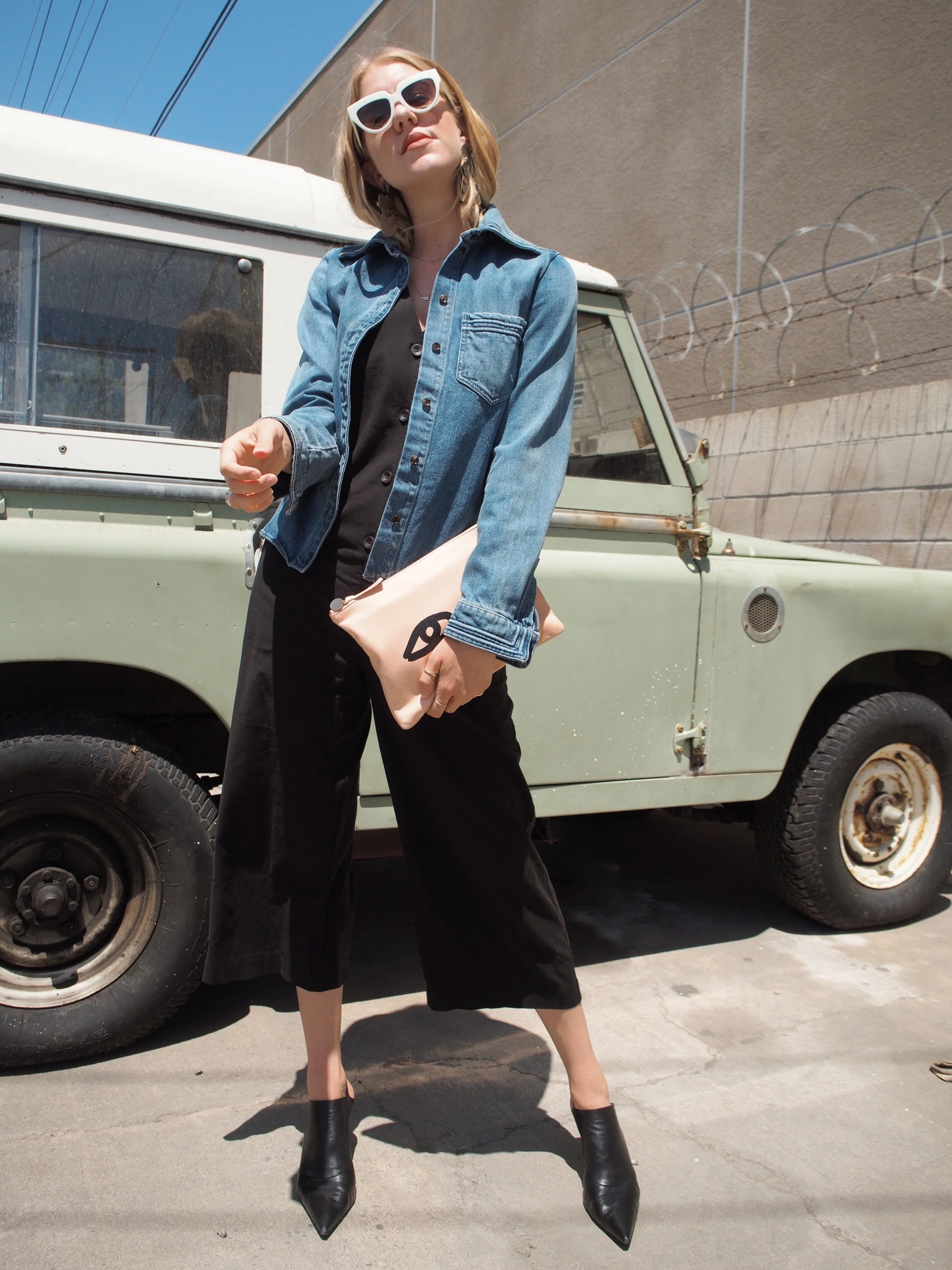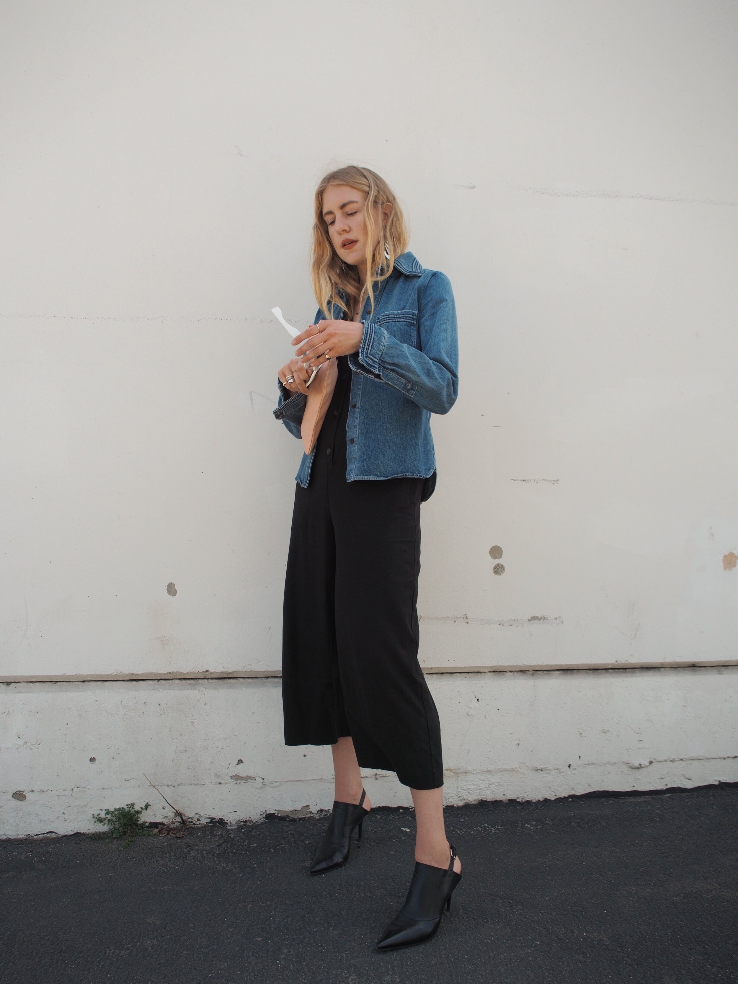 Wearing: Chloé Denim Button-Up | Leo & Sage Black Jumpsuit | Prada Sunglasses | Acne Slingback Pointed Mules | Clare V Flat Clutch (similar) | The2Bandits Earrings