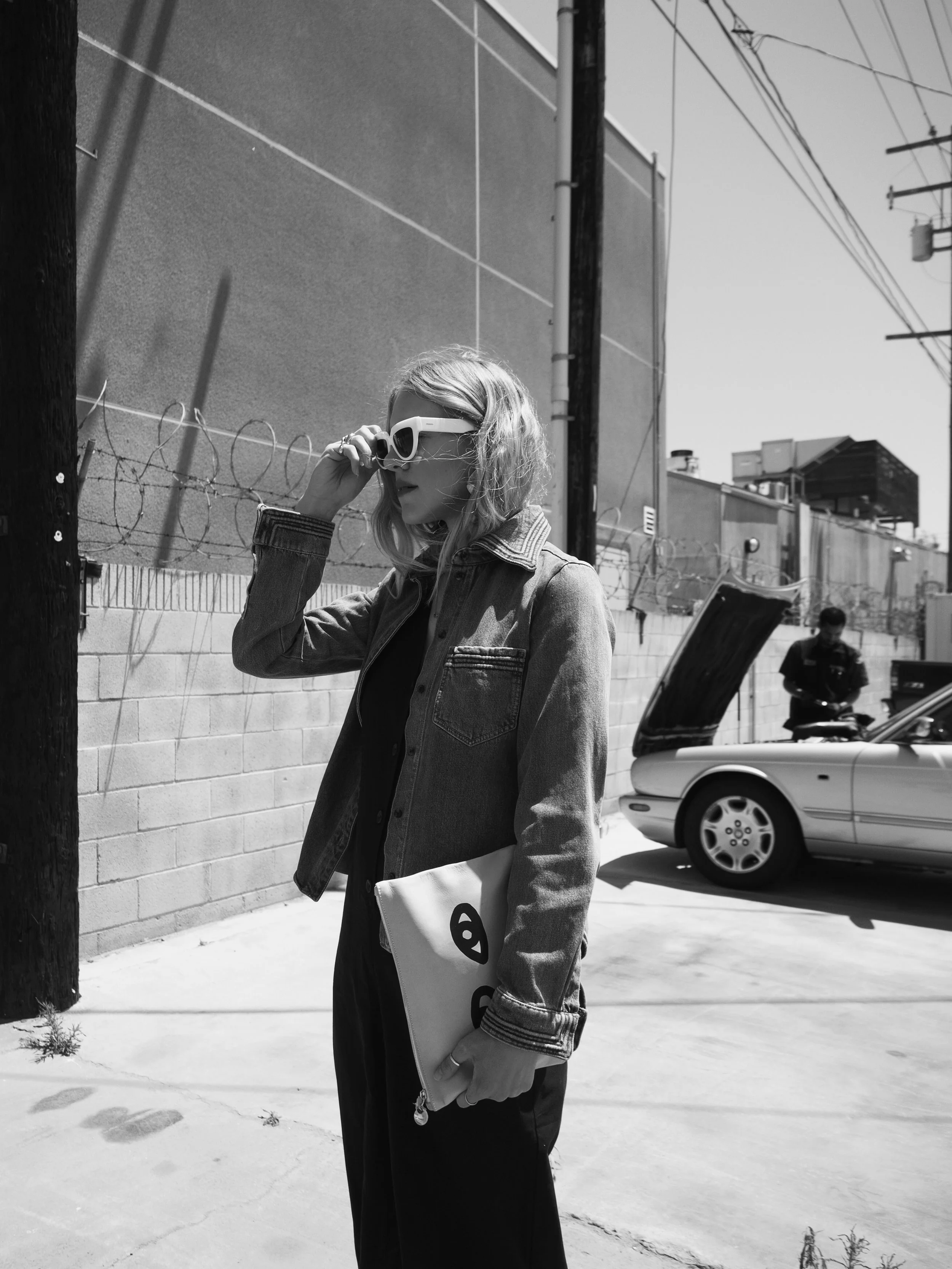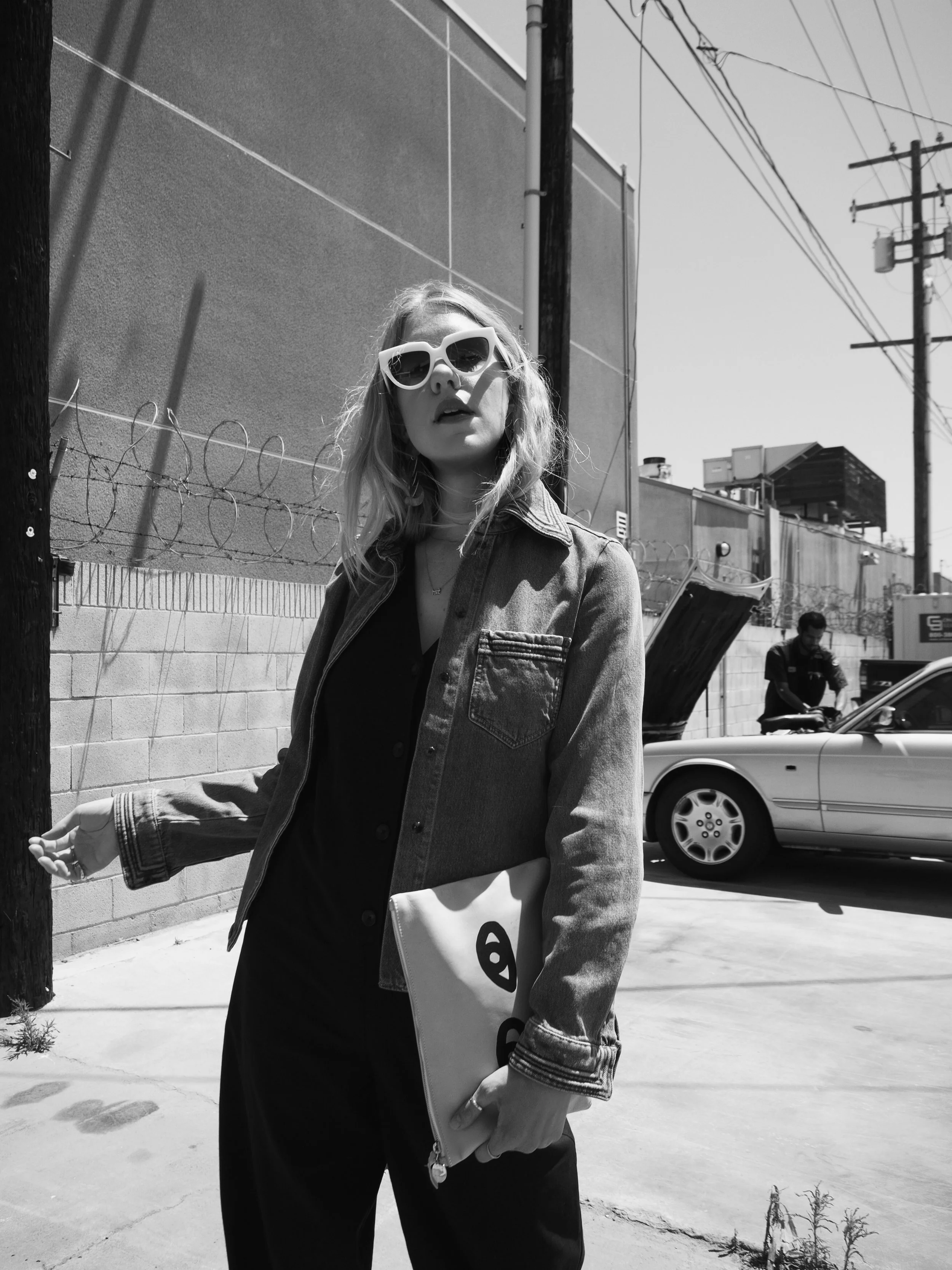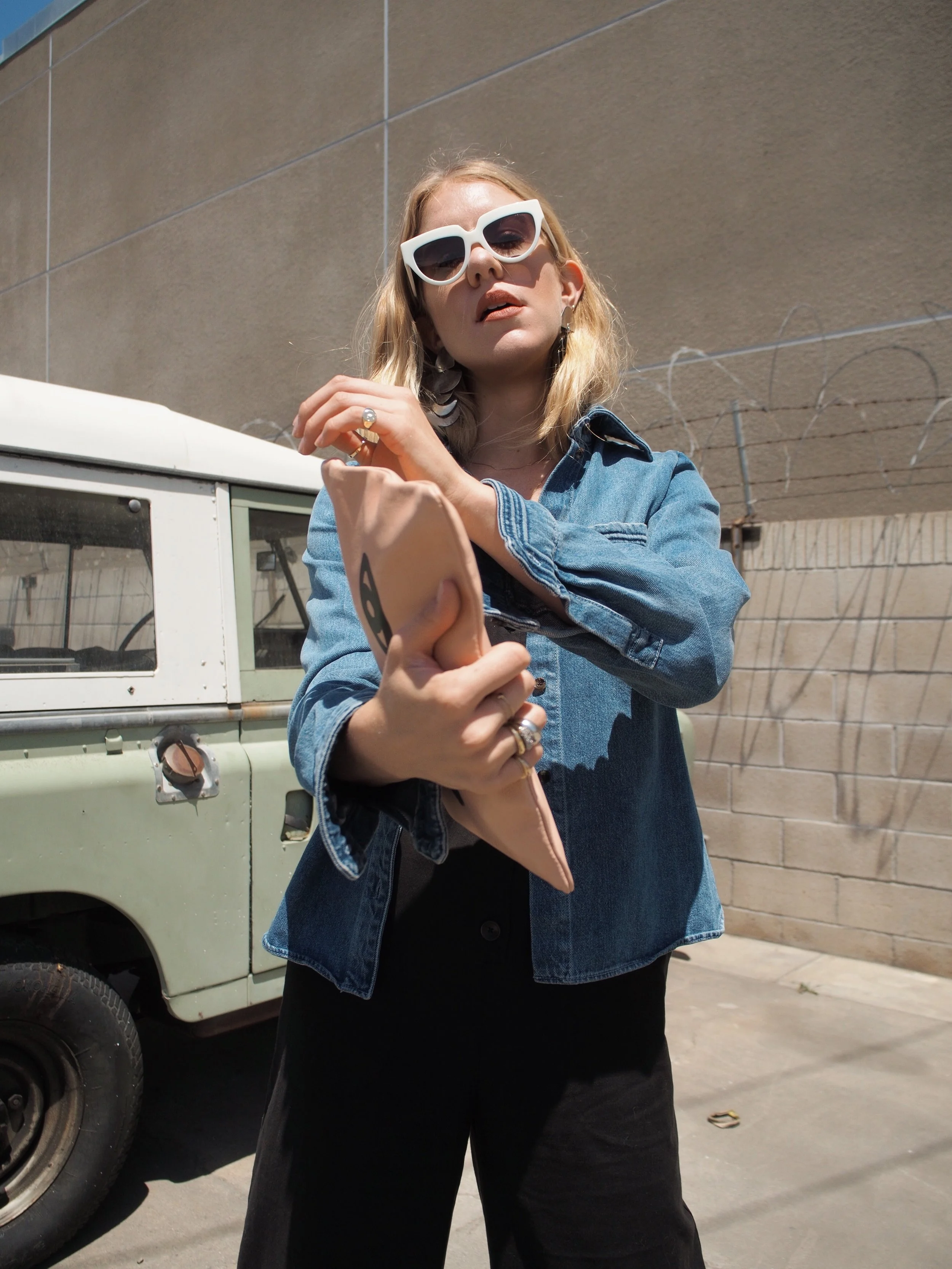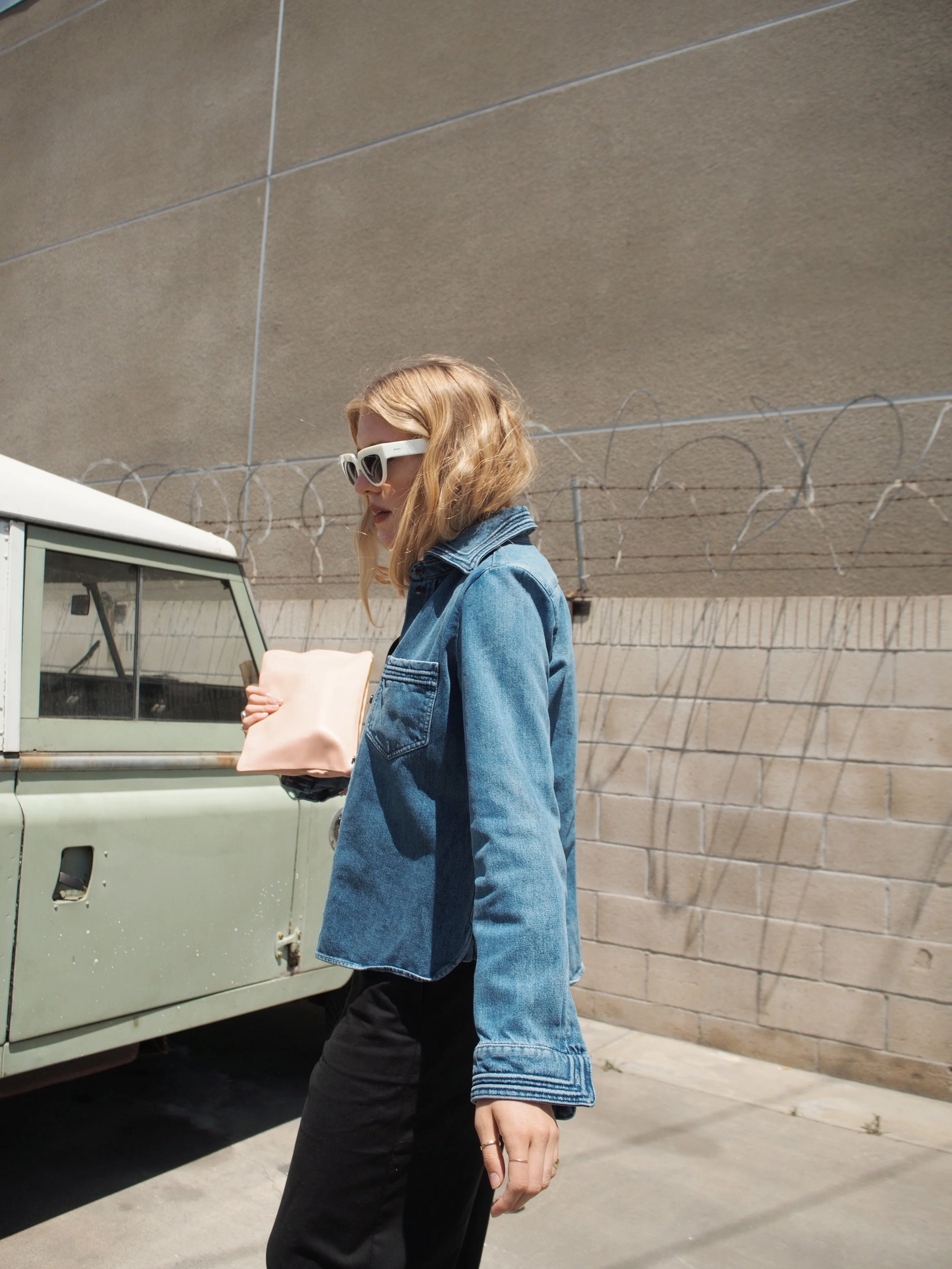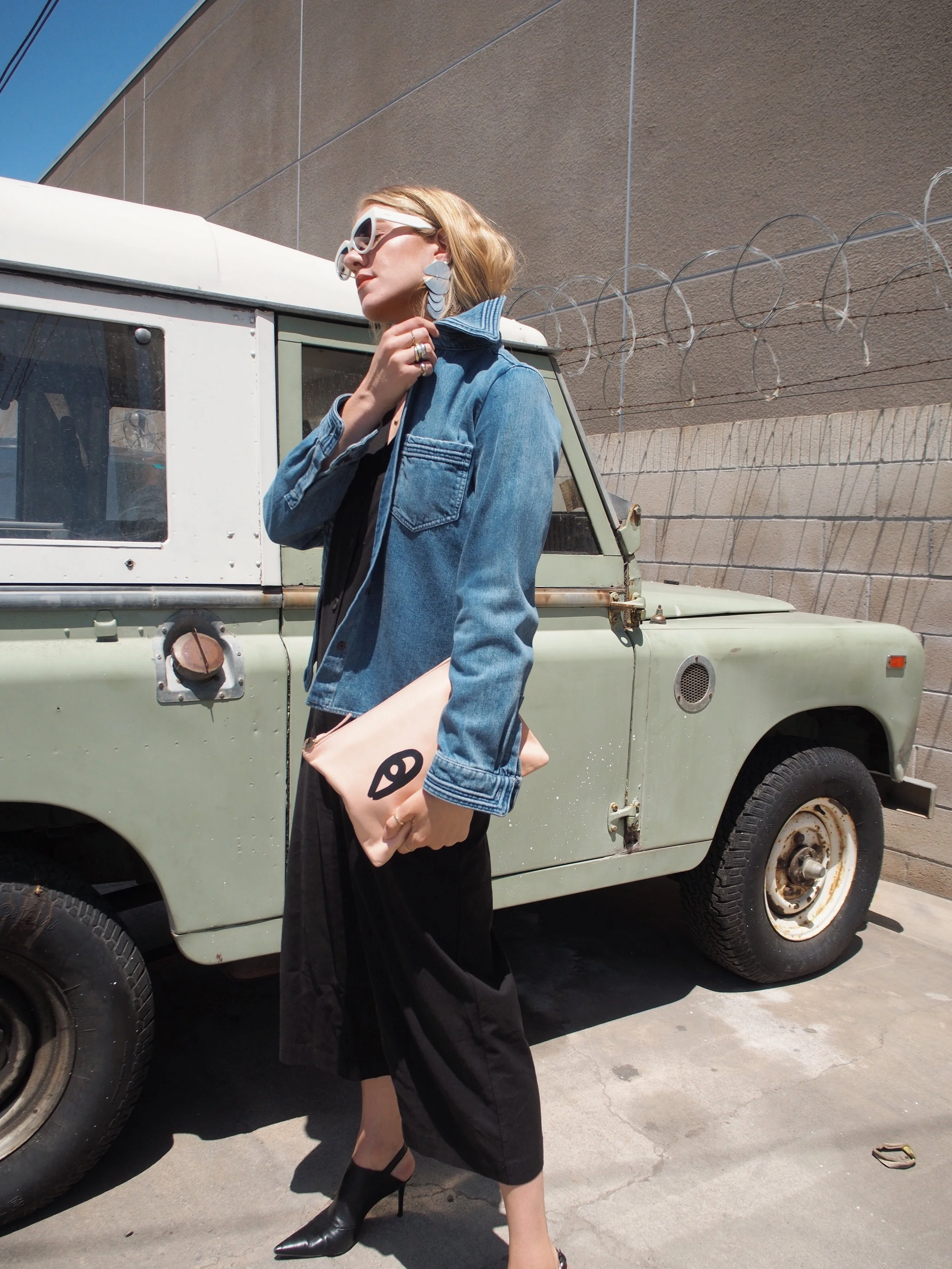 Wearing: Chloé Denim Button-Up | Leo & Sage Black Jumpsuit | Prada Sunglasses | Acne Slingback Pointed Mules | Clare V Flat Clutch (similar) | The2Bandits Earrings