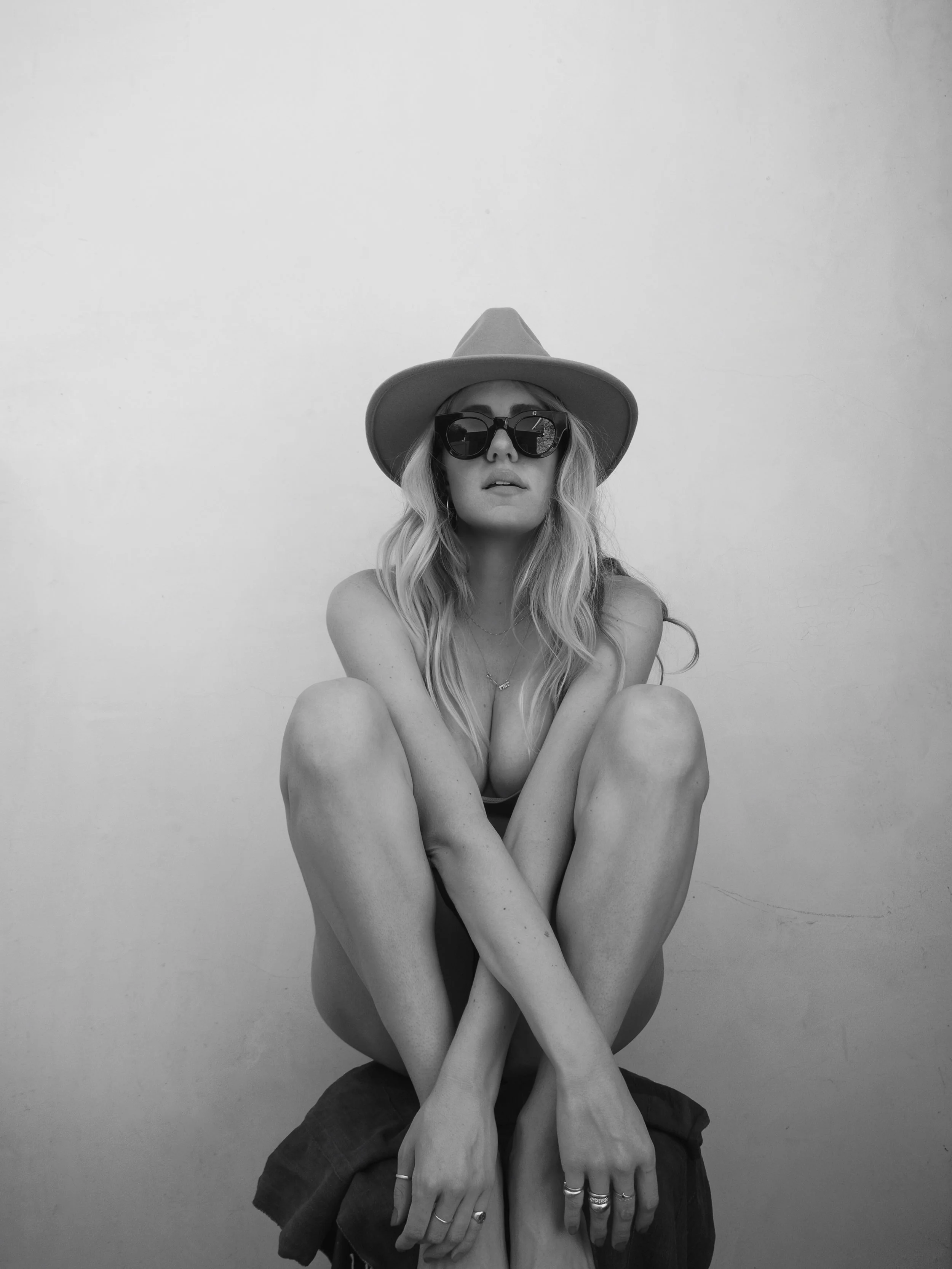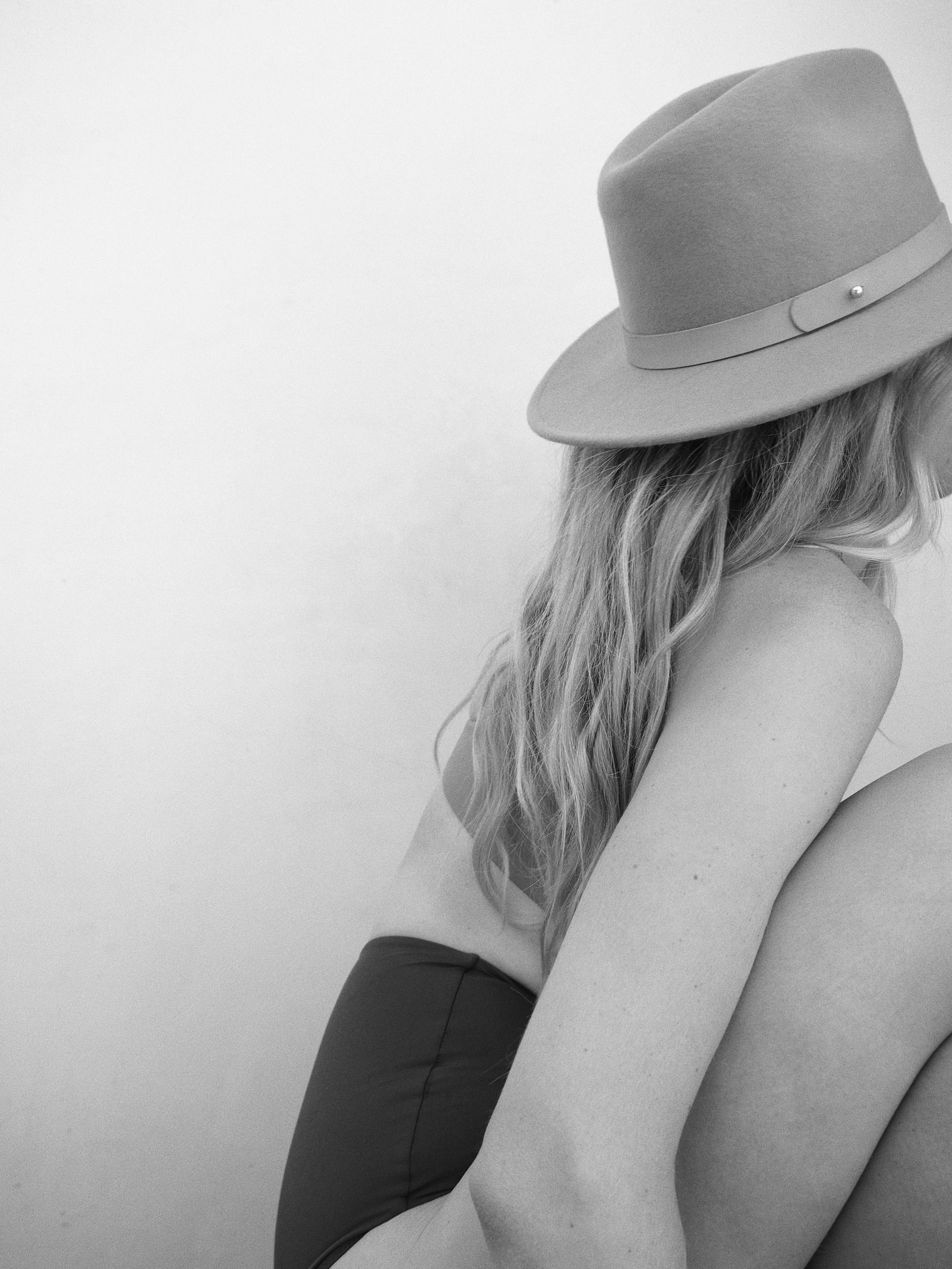 Wearing: Grana French Bikini Top in Blush Pearl | Grana High Rise Bikini Bottom in Olive Pearl | Sun Buddies Edie Sunglasses | Lack of Color 'The Frey' Hat