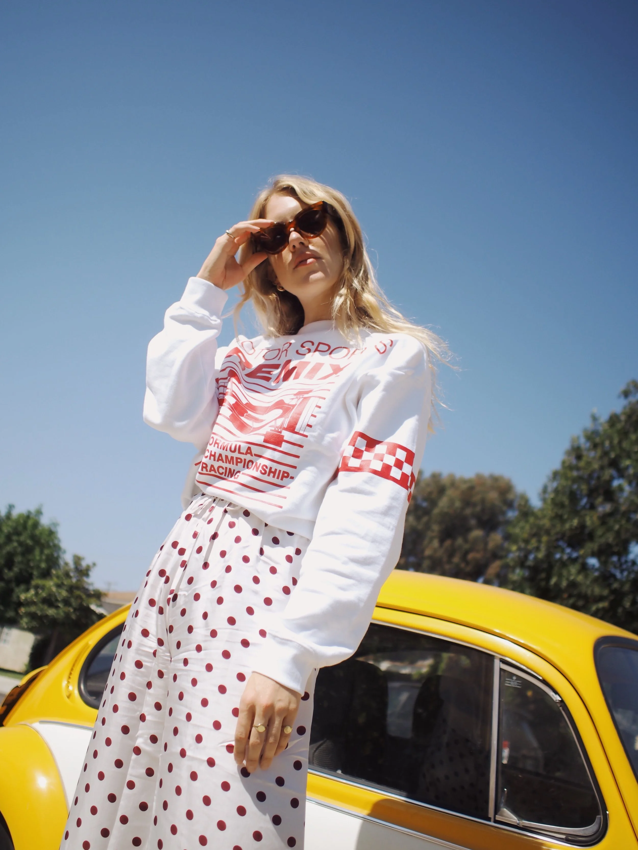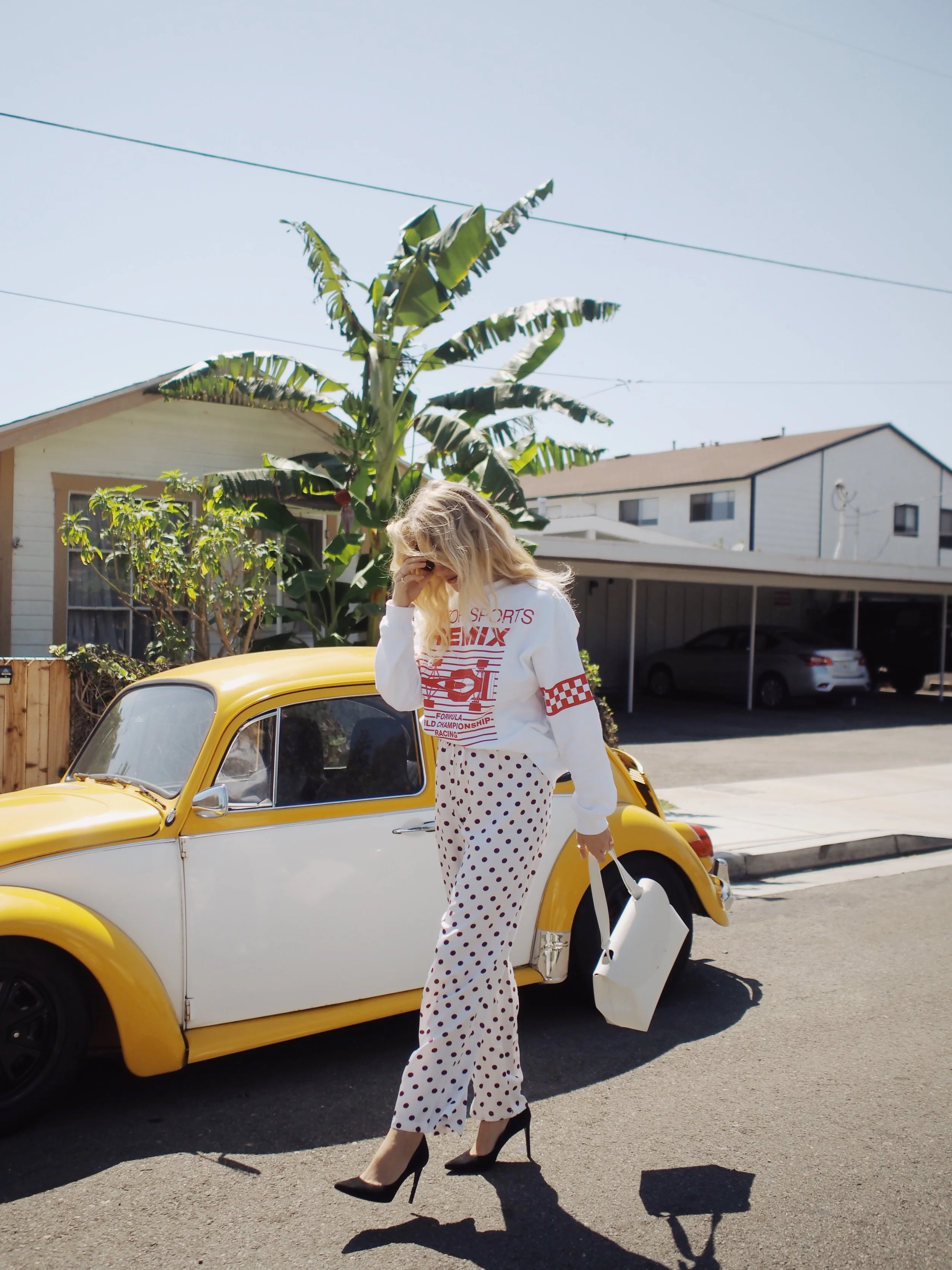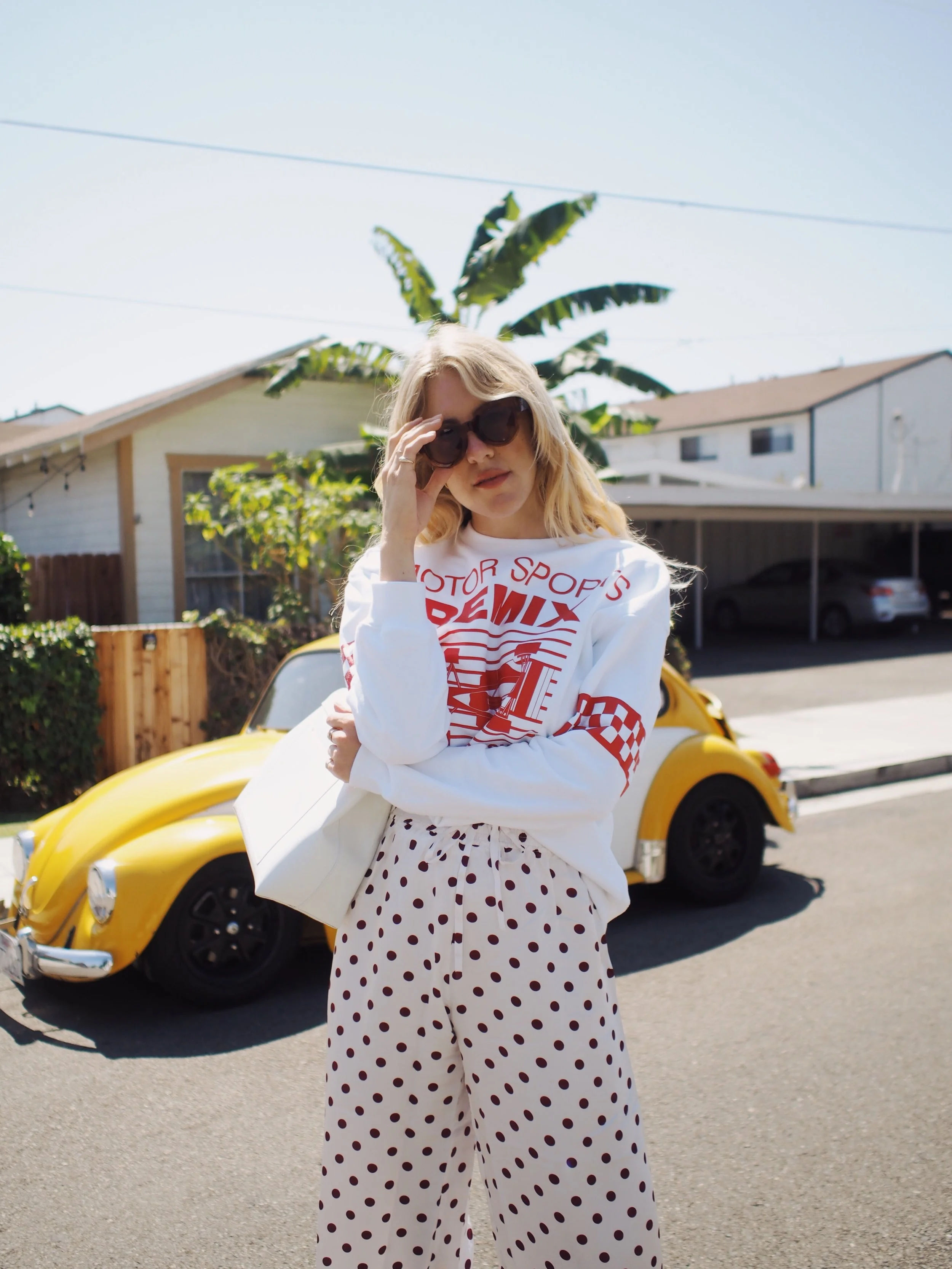 Living in California has giving me a very laid back style. I most often find myself in a worn tee shirt and jeans. Even with a relaxed wardrobe, as soon as I put on a heel I feel put together. No matter what shoes you have in your closet, I think every woman needs at least one pair of classic pumps. I recently received this motorsport racing sweatshirt and silk pair of pants from Danish brand, Designer's Remix and I couldn't help but pair this look with the super sophisticated Leigh 95 pump from Stuart Weitzman. I don't wear stiletto heels often, but when I do, I like to keep it simple and classic. These Leigh pumps are the perfect classic to wear with anything. From jeans and a tee shirt to a formal look, a sexy black pump is your one and done.