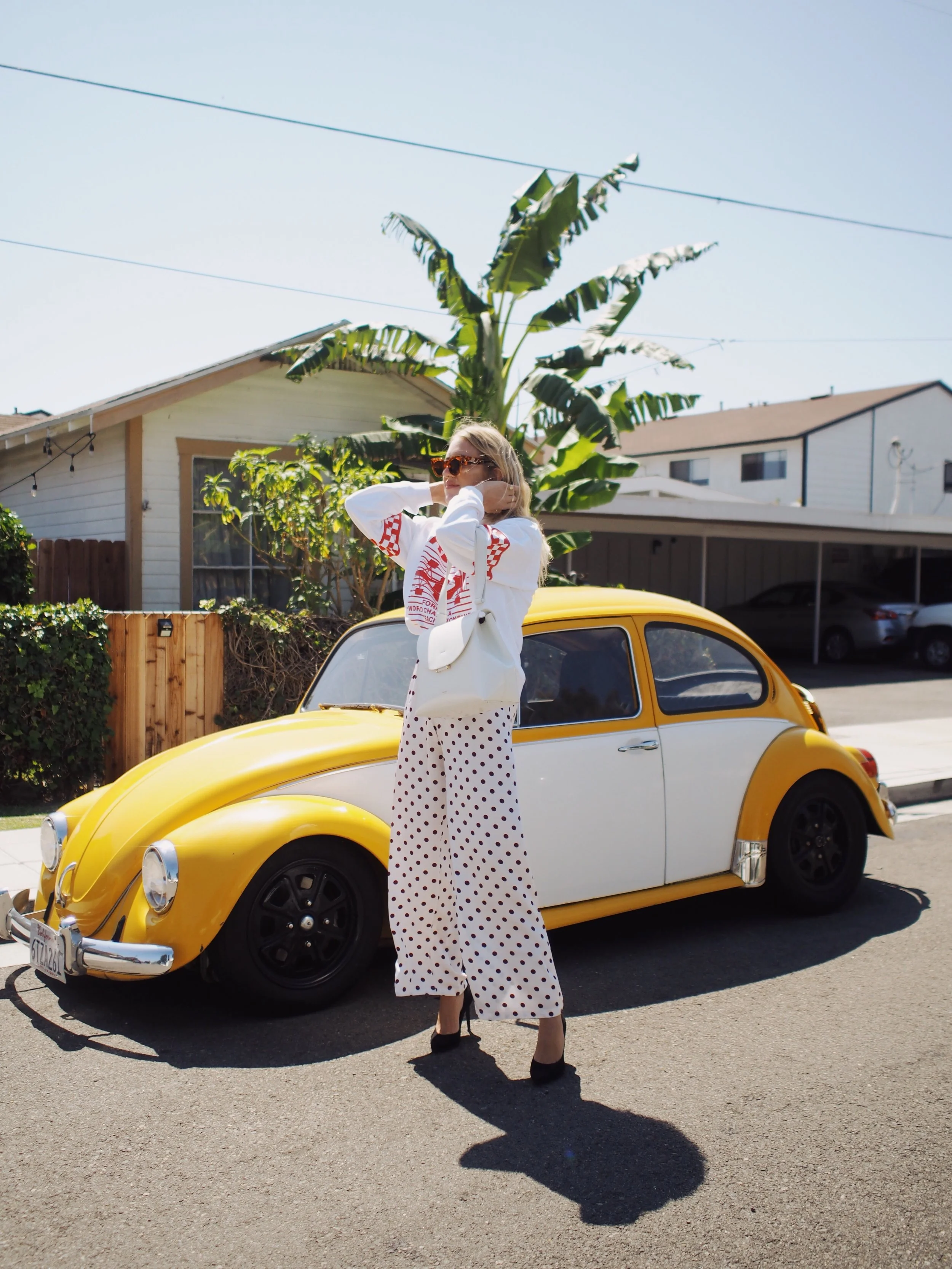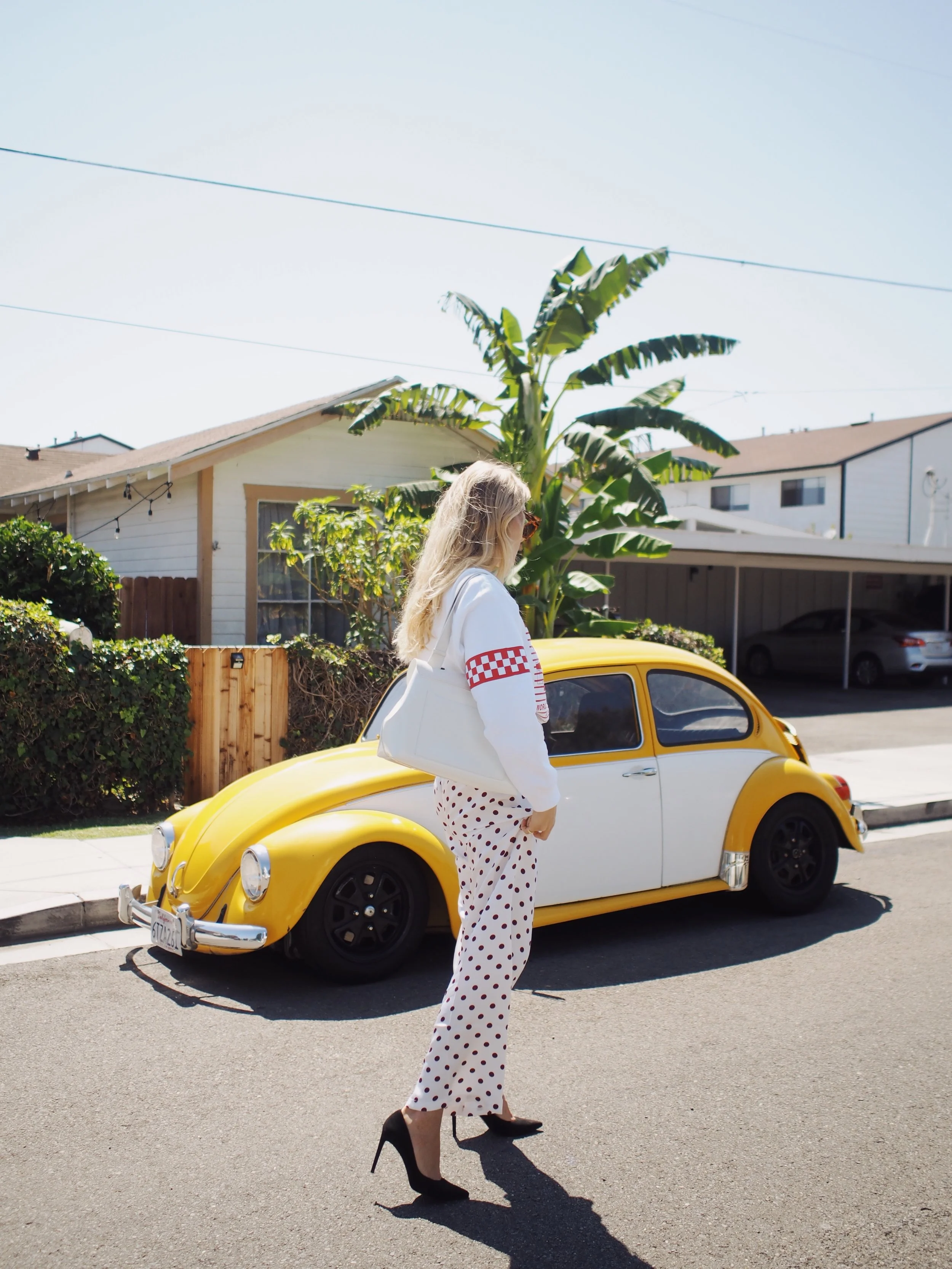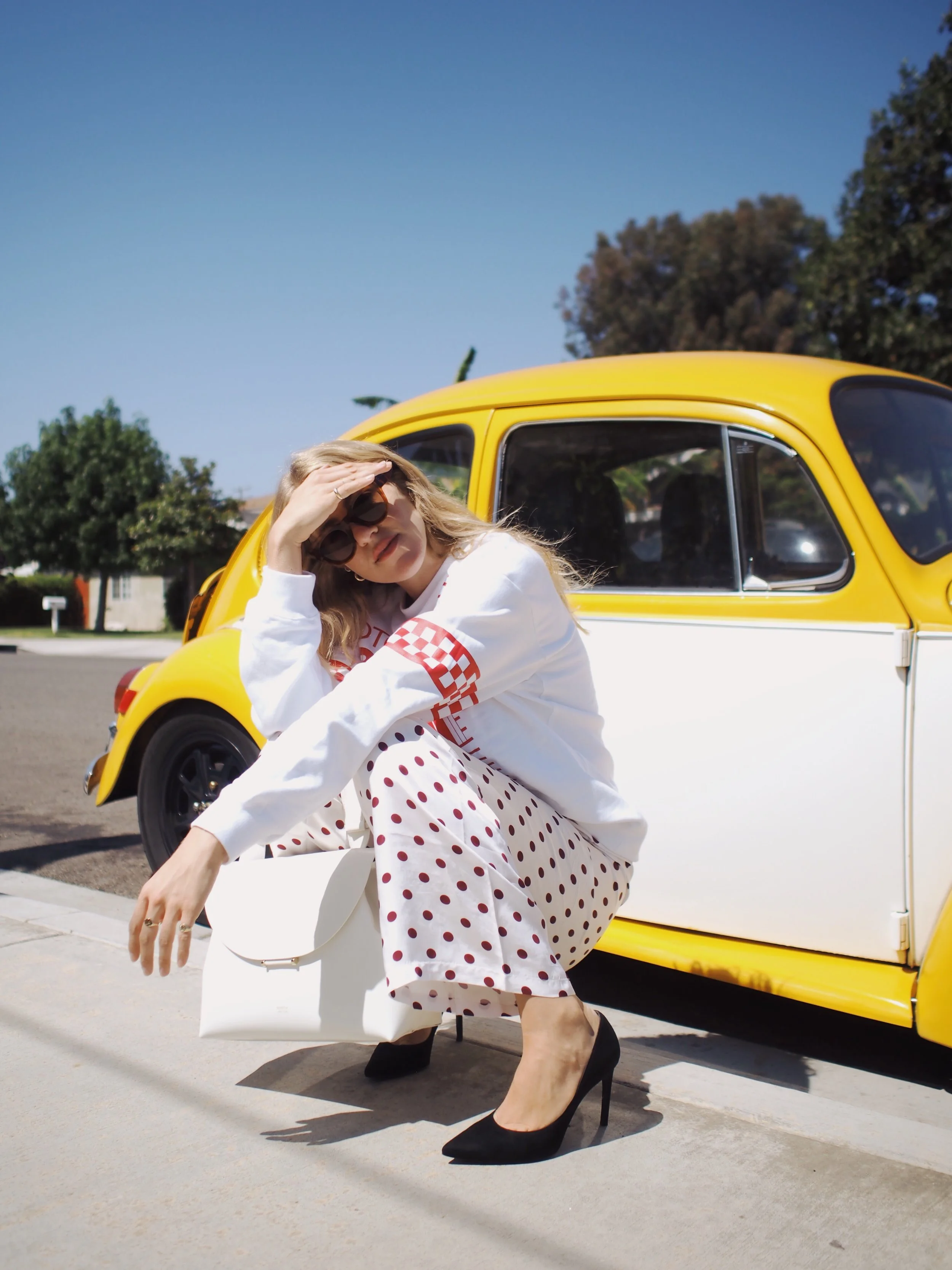 Living in California has giving me a very laid back style. I most often find myself in a worn tee shirt and jeans. Even with a relaxed wardrobe, as soon as I put on a heel I feel put together. No matter what shoes you have in your closet, I think every woman needs at least one pair of classic pumps. I recently received this motorsport racing sweatshirt and silk pair of pants from Danish brand, Designer's Remix and I couldn't help but pair this look with the super sophisticated Leigh 95 pump from Stuart Weitzman. I don't wear stiletto heels often, but when I do, I like to keep it simple and classic. These Leigh pumps are the perfect classic to wear with anything. From jeans and a tee shirt to a formal look, a sexy black pump is your one and done.