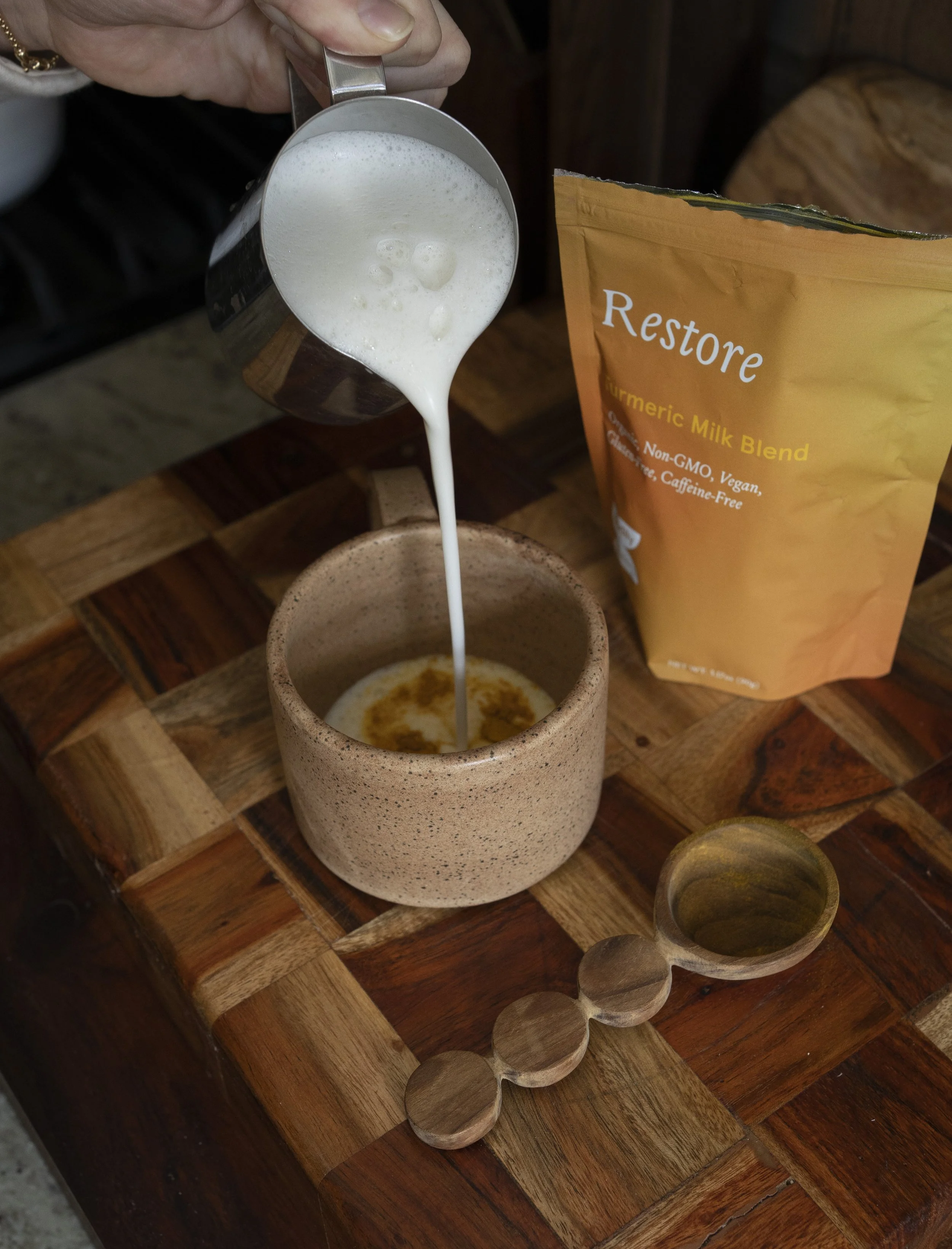 Two. Bodily Recovery Latte: Restore— the Restore latte has been so nourishing postpartum— a warming turmeric blend complete with organic cinnamon, ginger, black pepper, and other superfoods to support your body and mind during recovery. This latte draws from Indian tradition to unlock the anti-inflammatory benefits of black-pepper-activated curcumin (the active ingredient in turmeric) and antioxidants in the blend.