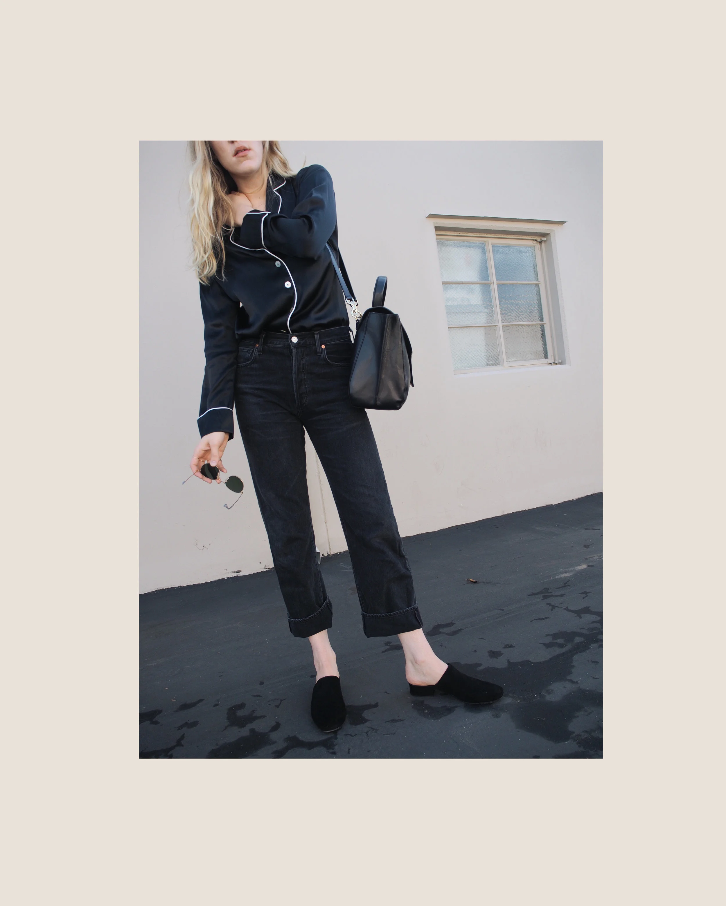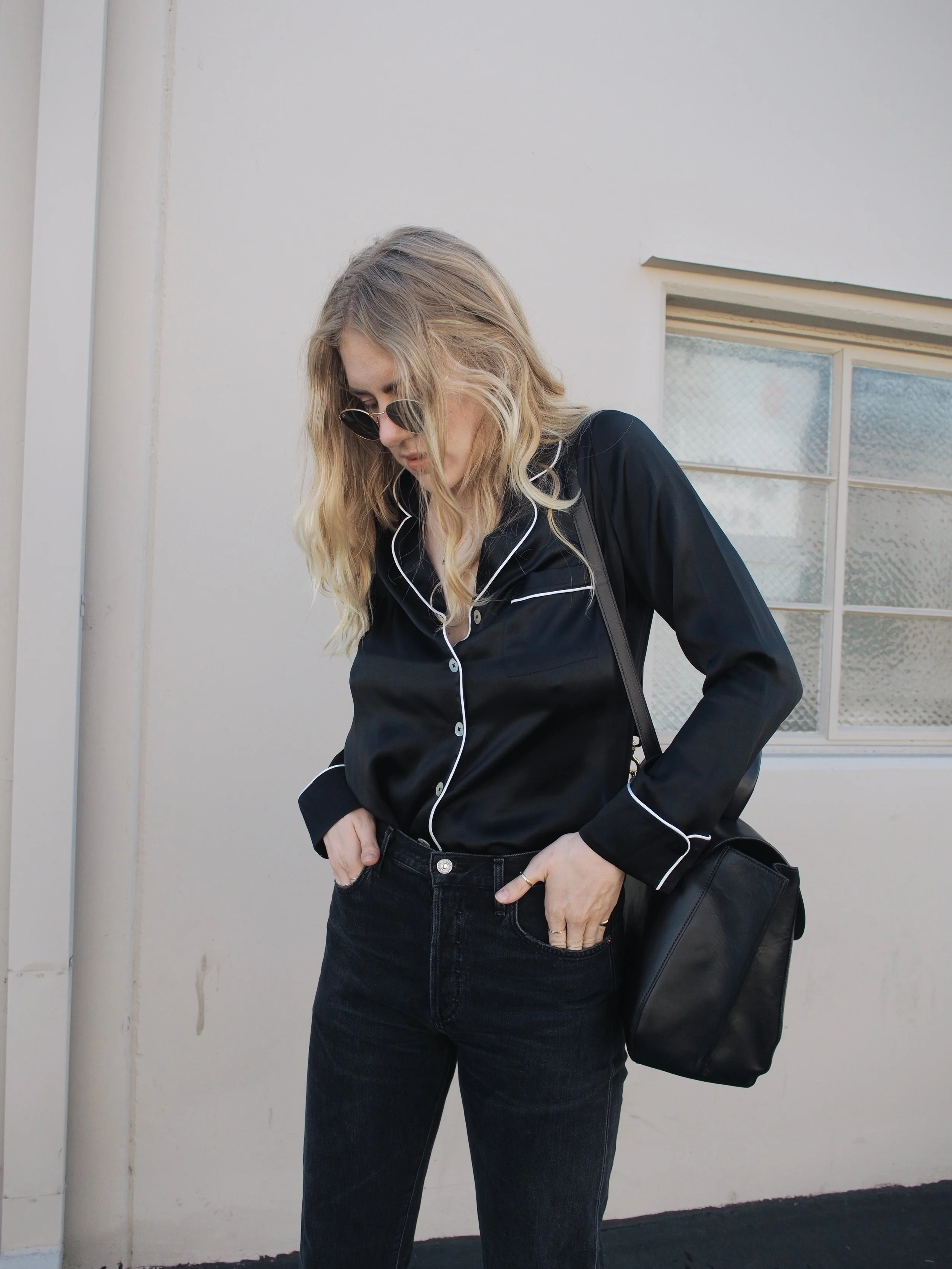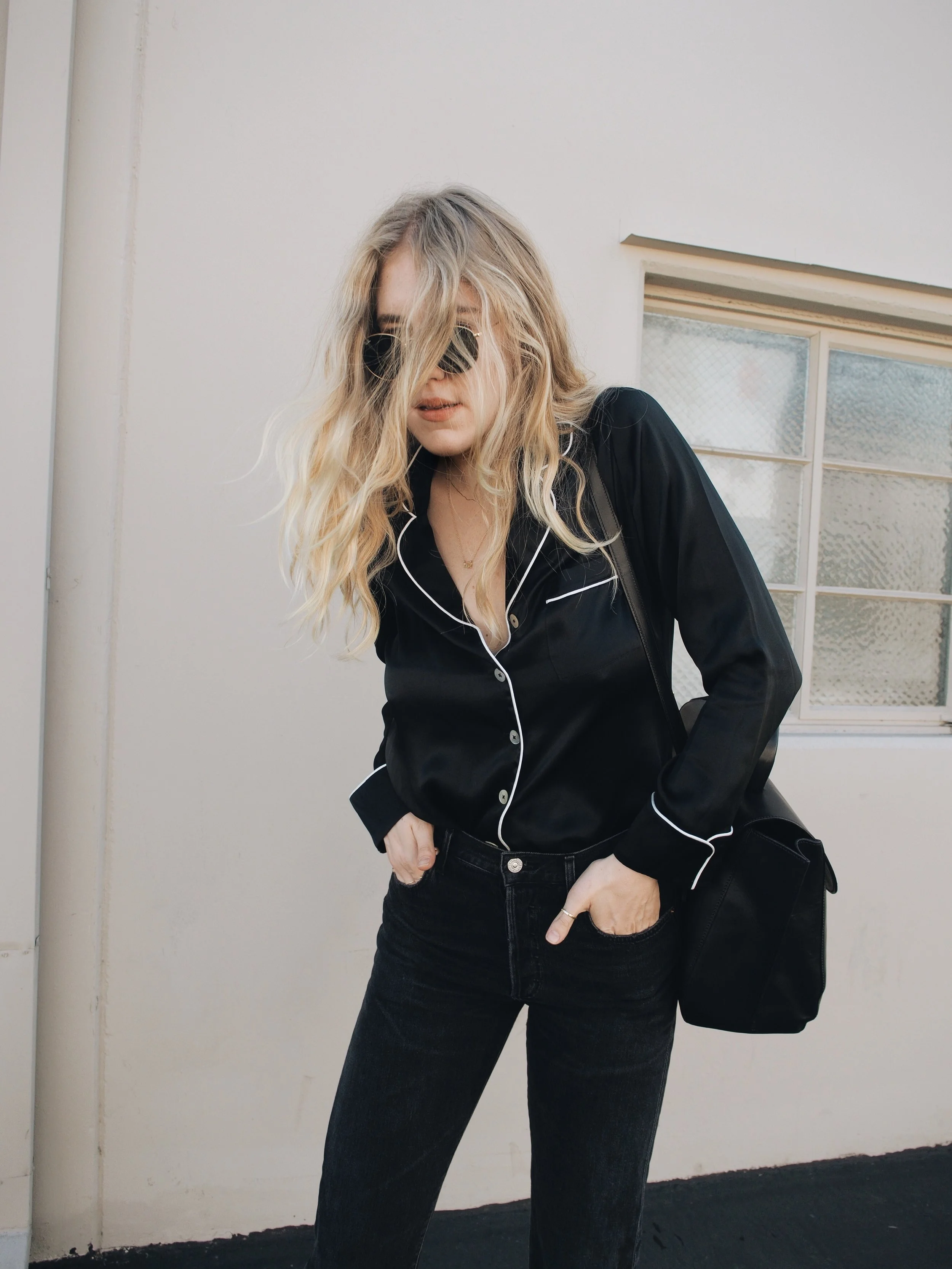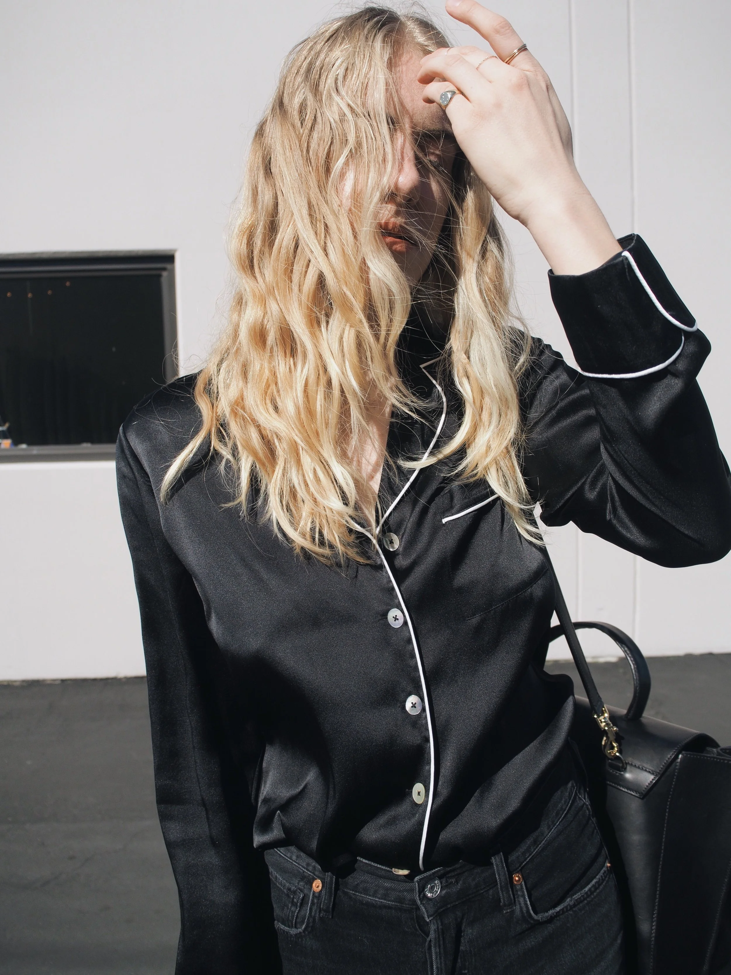 Back in sunny California after a week in Paris has me feeling in the most relaxed state of mind. As bed head has become a ritual hairstyle for me, there is nothing cooler than pairing a silk sleep shirt, like this one from Grana, with your favorite jeans. The most sophisticated way to achieve this look is a full-tuck in high waisted jeans, paired with heeled boots or a casual slide.