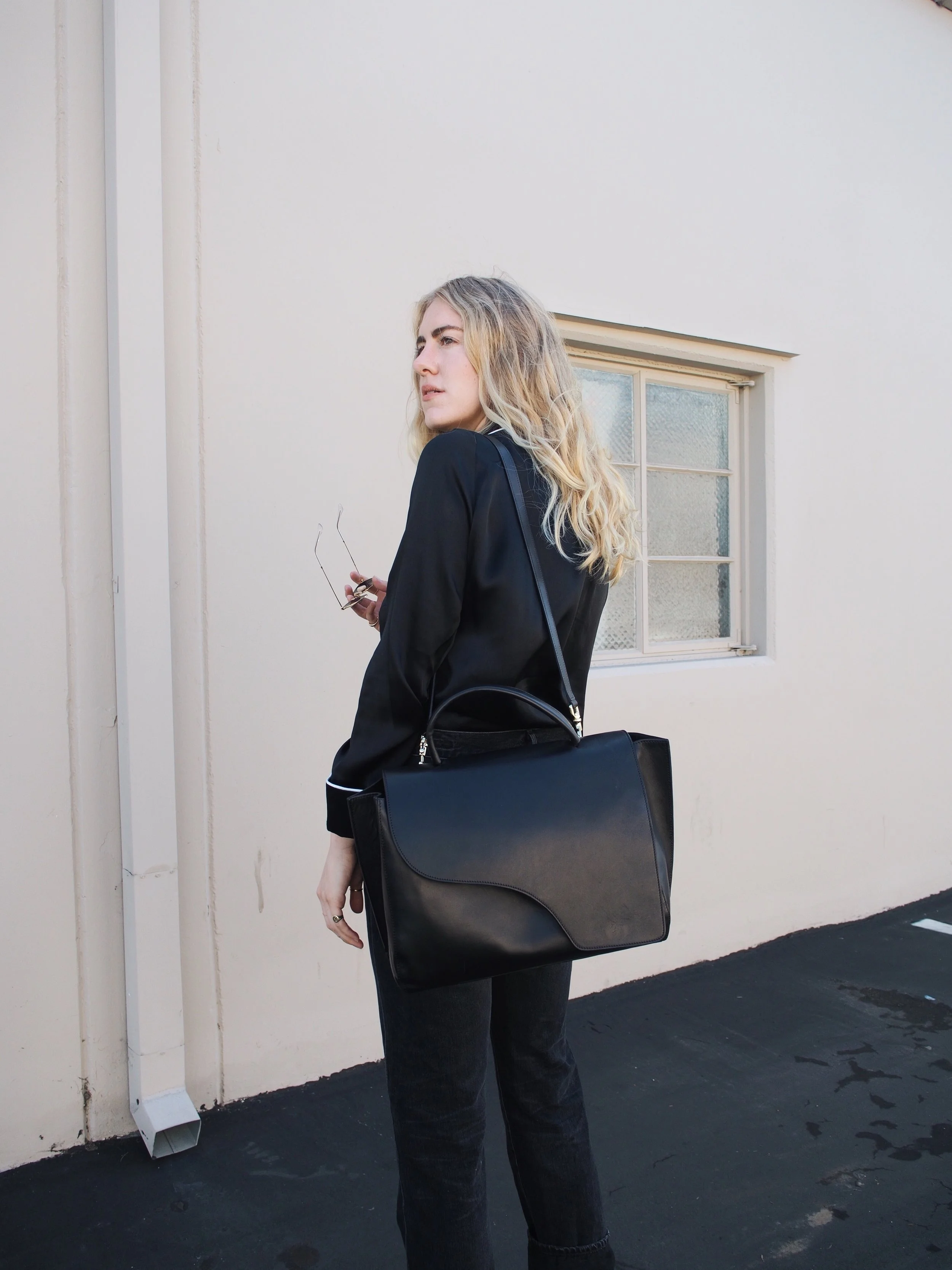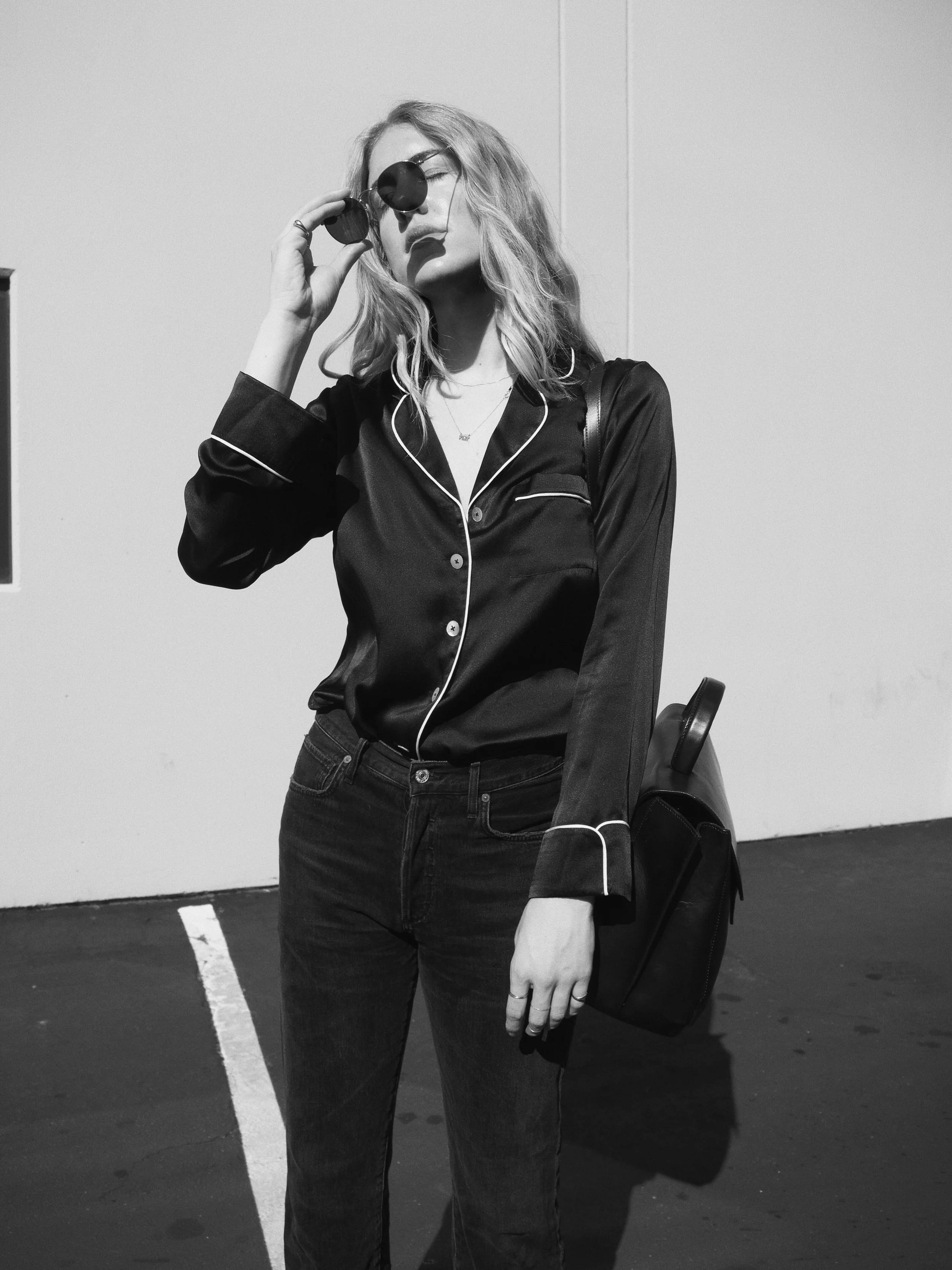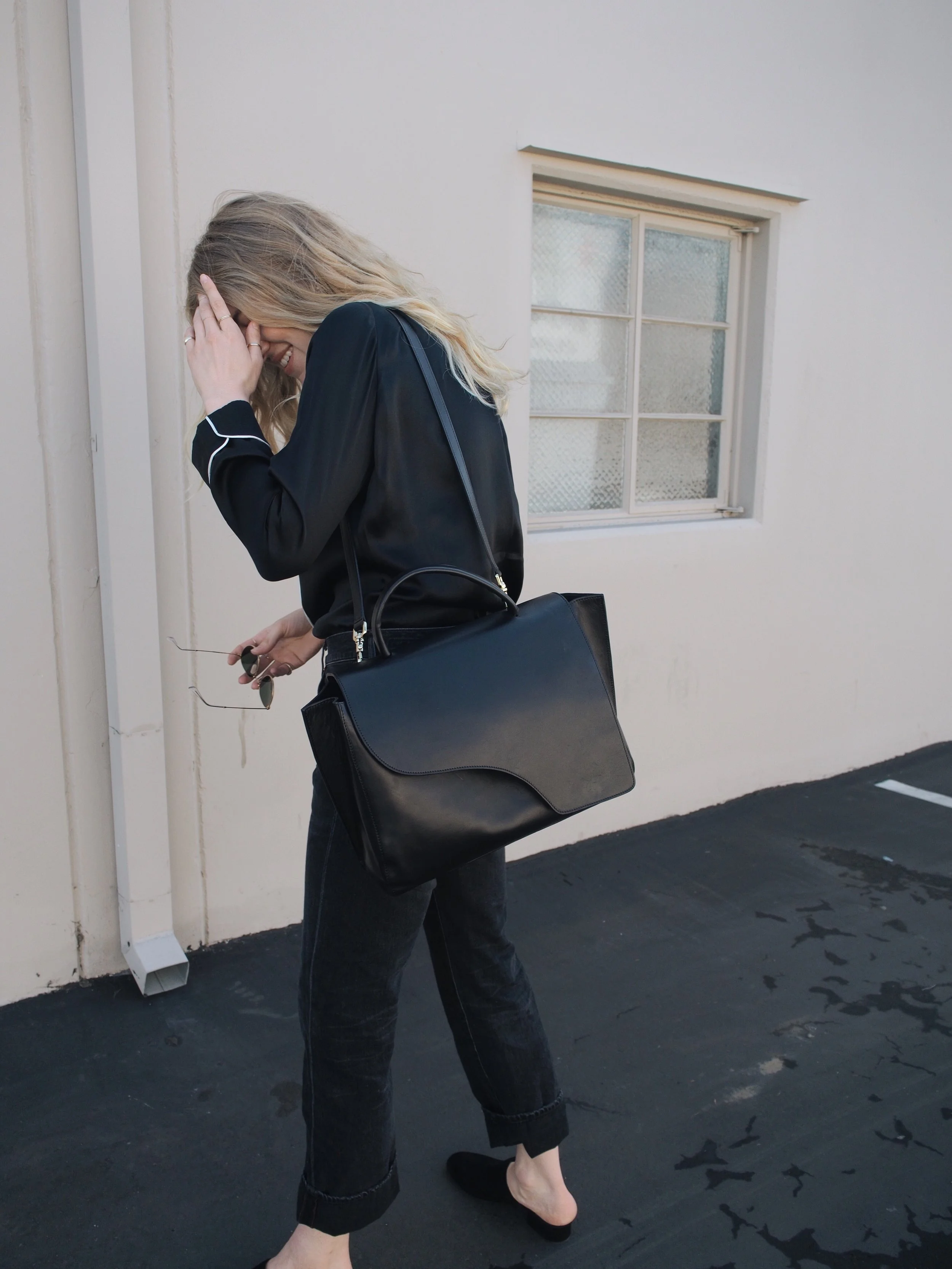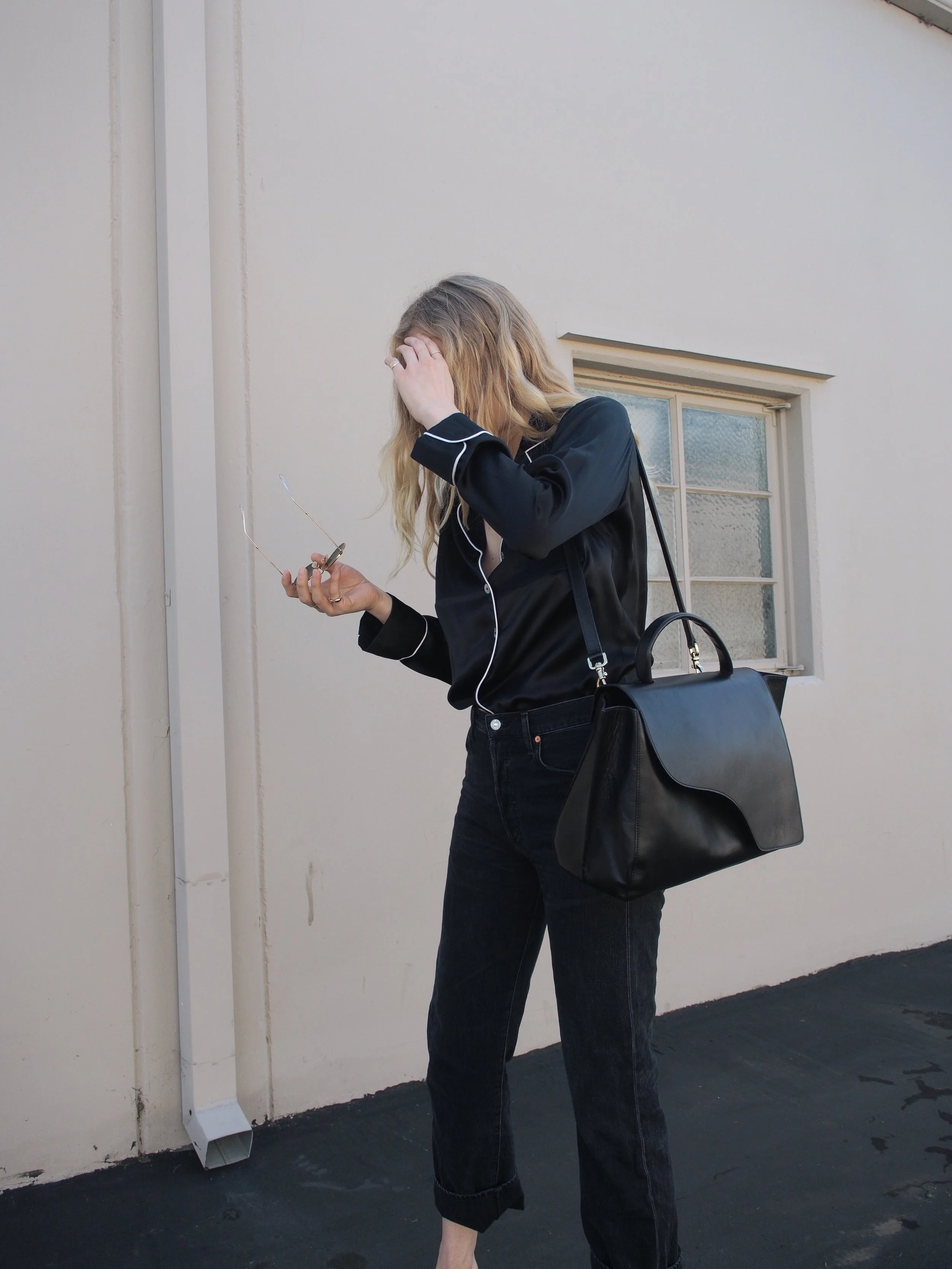 Back in sunny California after a week in Paris has me feeling in the most relaxed state of mind. As bed head has become a ritual hairstyle for me, there is nothing cooler than pairing a silk sleep shirt, like this one from Grana, with your favorite jeans. The most sophisticated way to achieve this look is a full-tuck in high waisted jeans, paired with heeled boots or a casual slide.